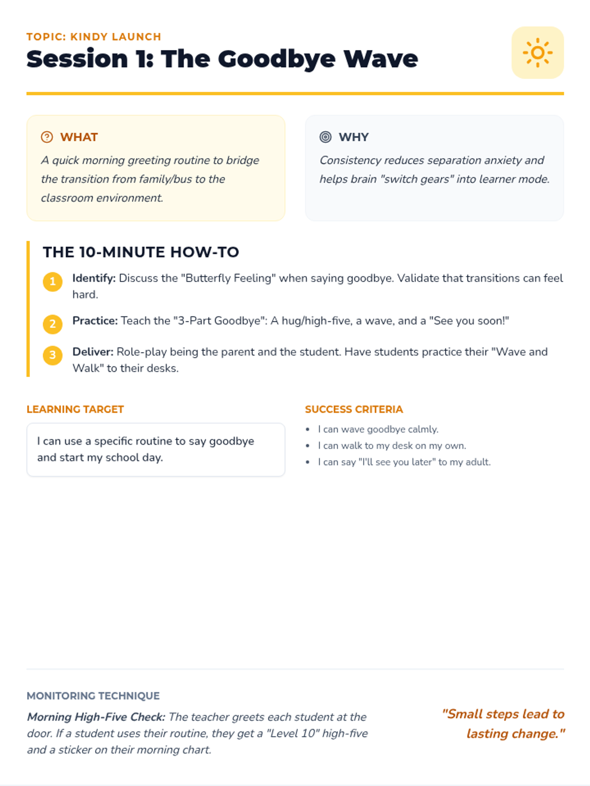 A Kindergarten sequence focused on building task persistence and management through visual supports, routines, and incremental stamina building. Students learn to use timers, First/Then boards, and self-monitoring tools to sustain attention.
