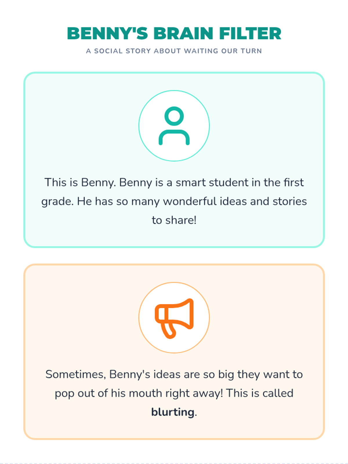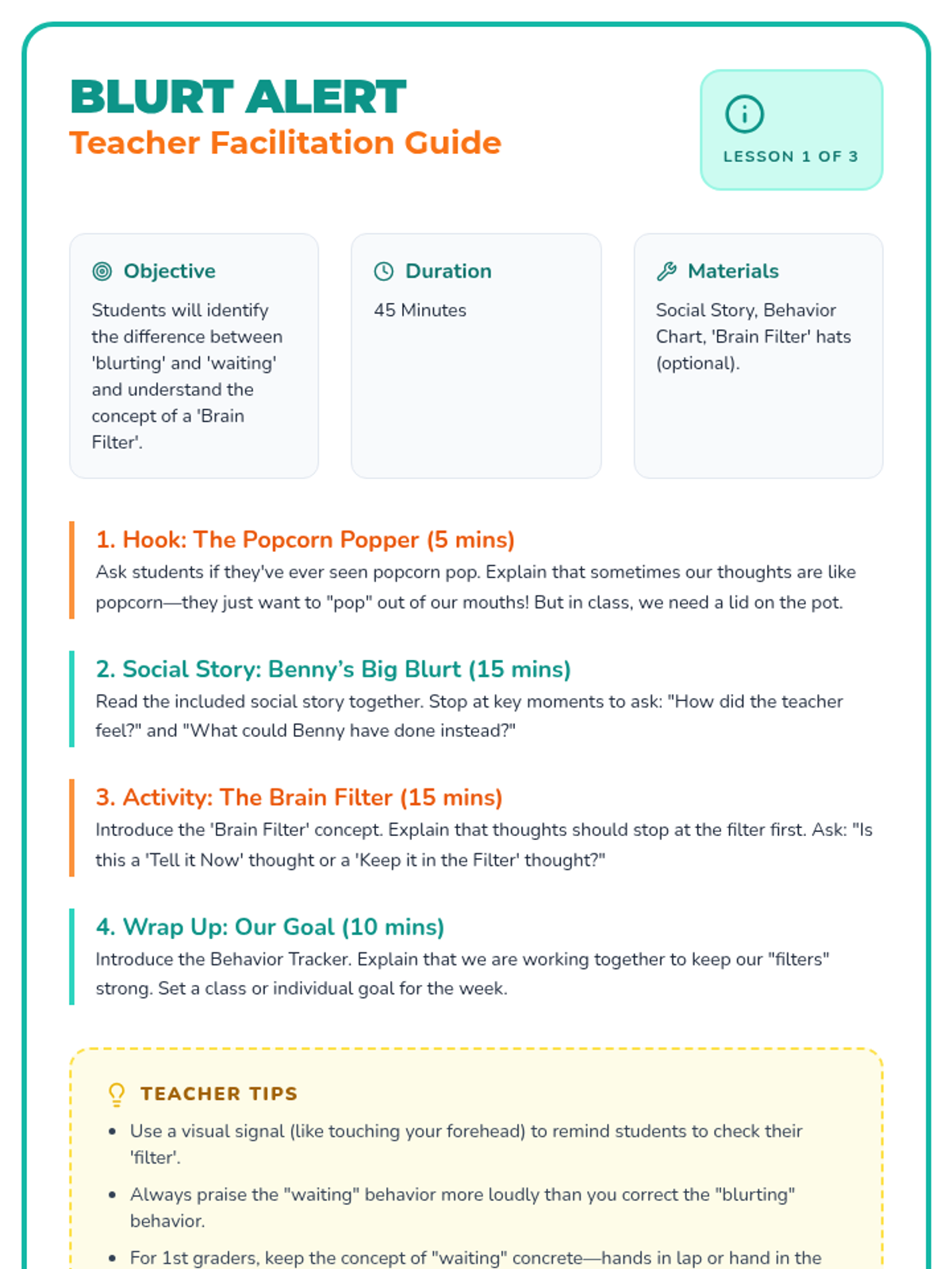 A comprehensive unit for 1st grade students to understand and manage blurting in the classroom through social stories, sorting activities, and interactive games.
