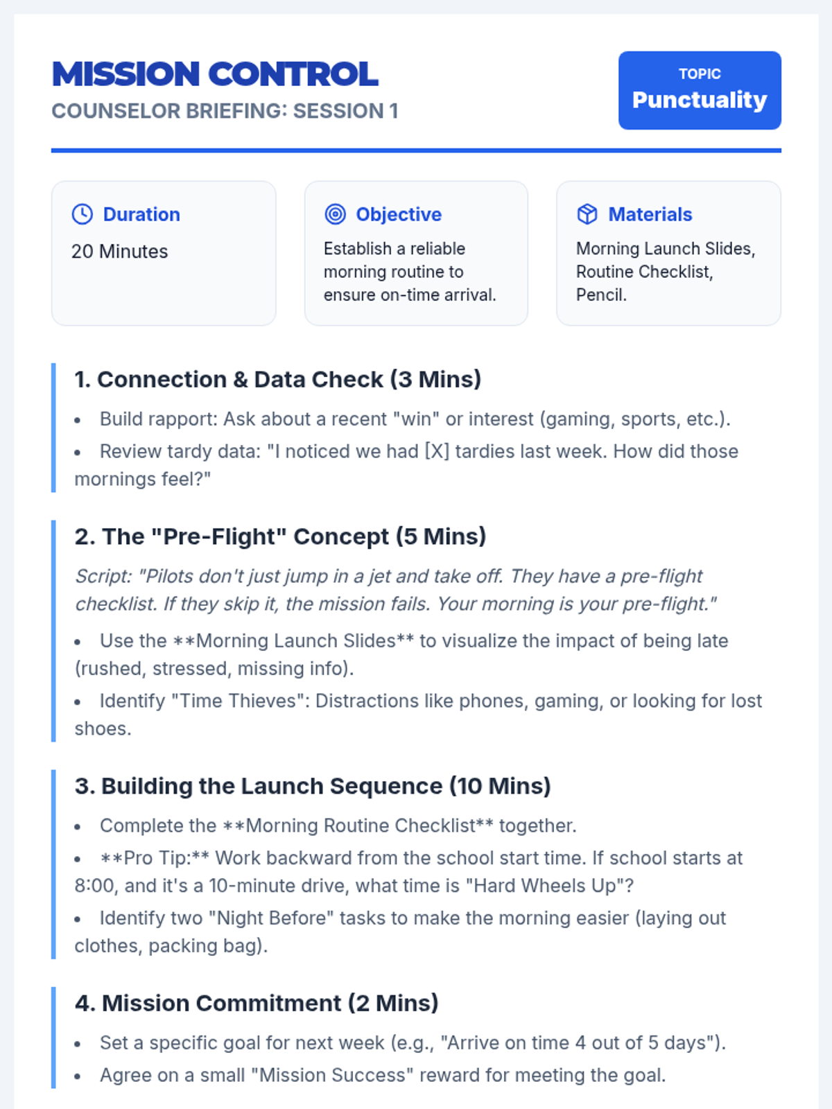 A 4-week individual counseling program for upper elementary students designed to improve organizational skills, punctuality, and assignment completion through a high-tech "Mission Control" theme.