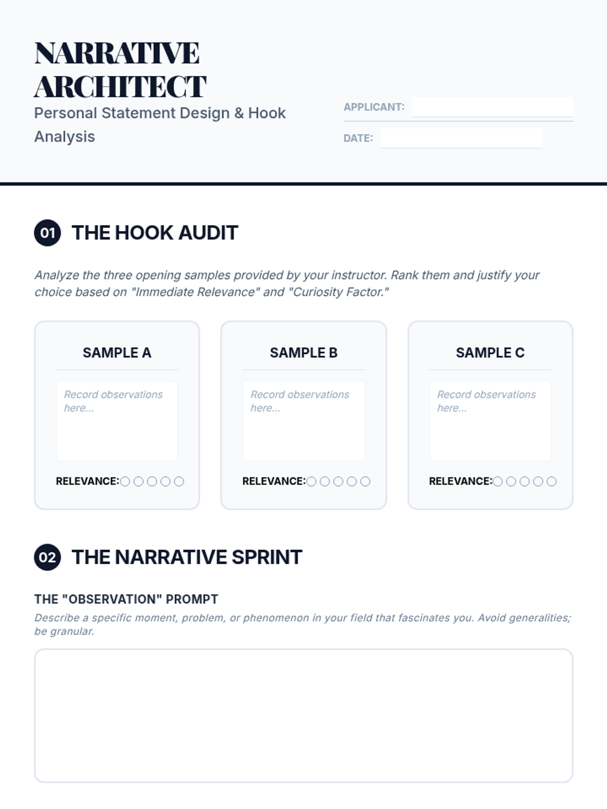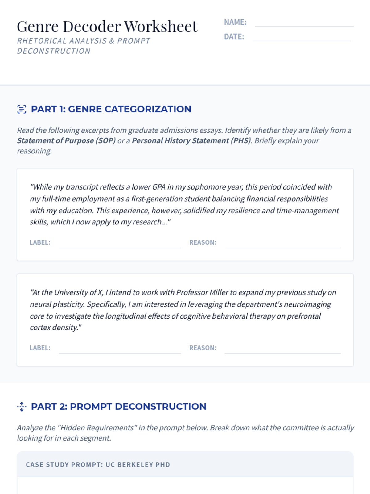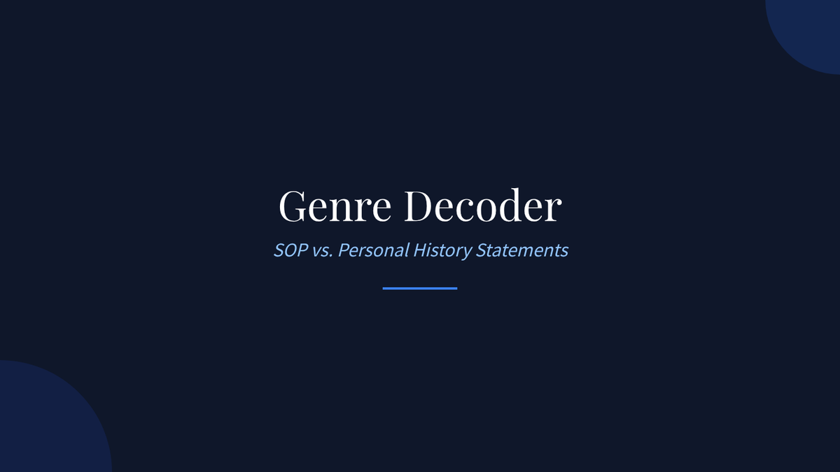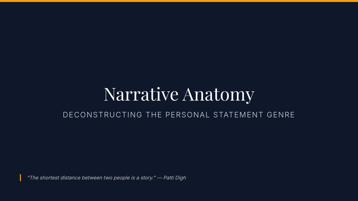 A graduate-level sequence focused on the rhetorical strategies of admissions writing, helping students distinguish between Personal Statements and Statements of Purpose while mastering the 'hidden curriculum' of graduate applications.