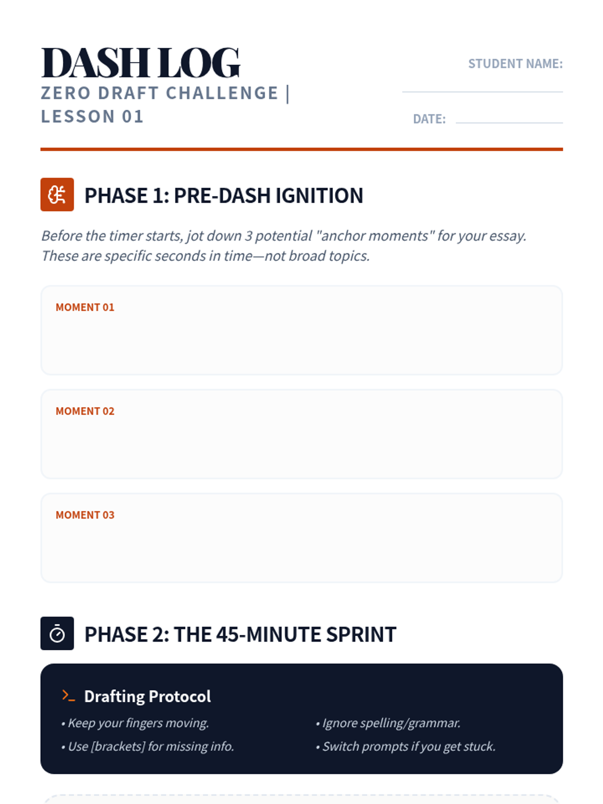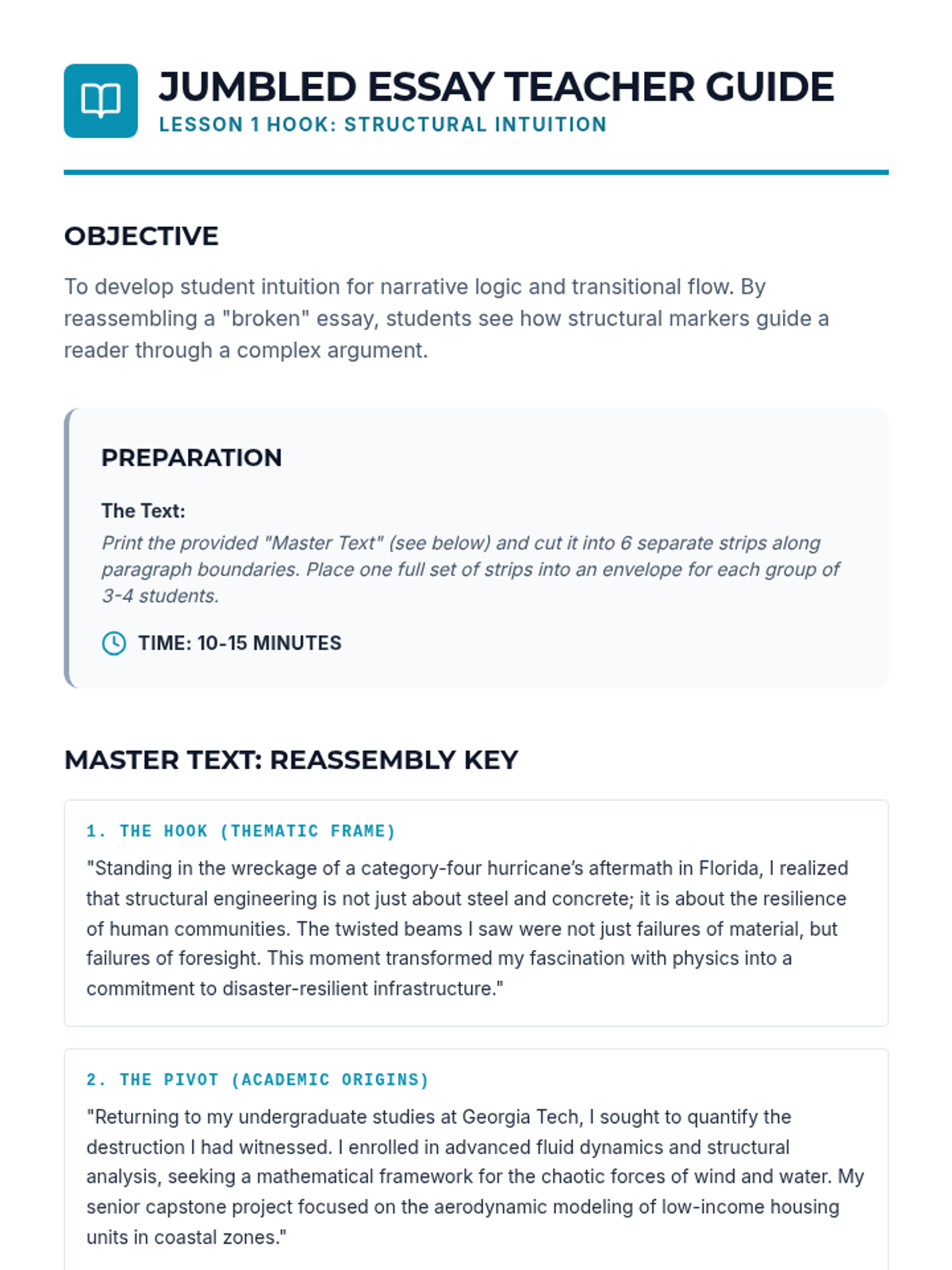 A comprehensive workshop-style sequence designed to guide 11th-grade students through the iterative process of drafting, restructuring, and refining their college personal statements. Students transition from raw 'zero drafts' to polished, reflective essays using structural analysis, peer feedback protocols, and precision editing techniques.