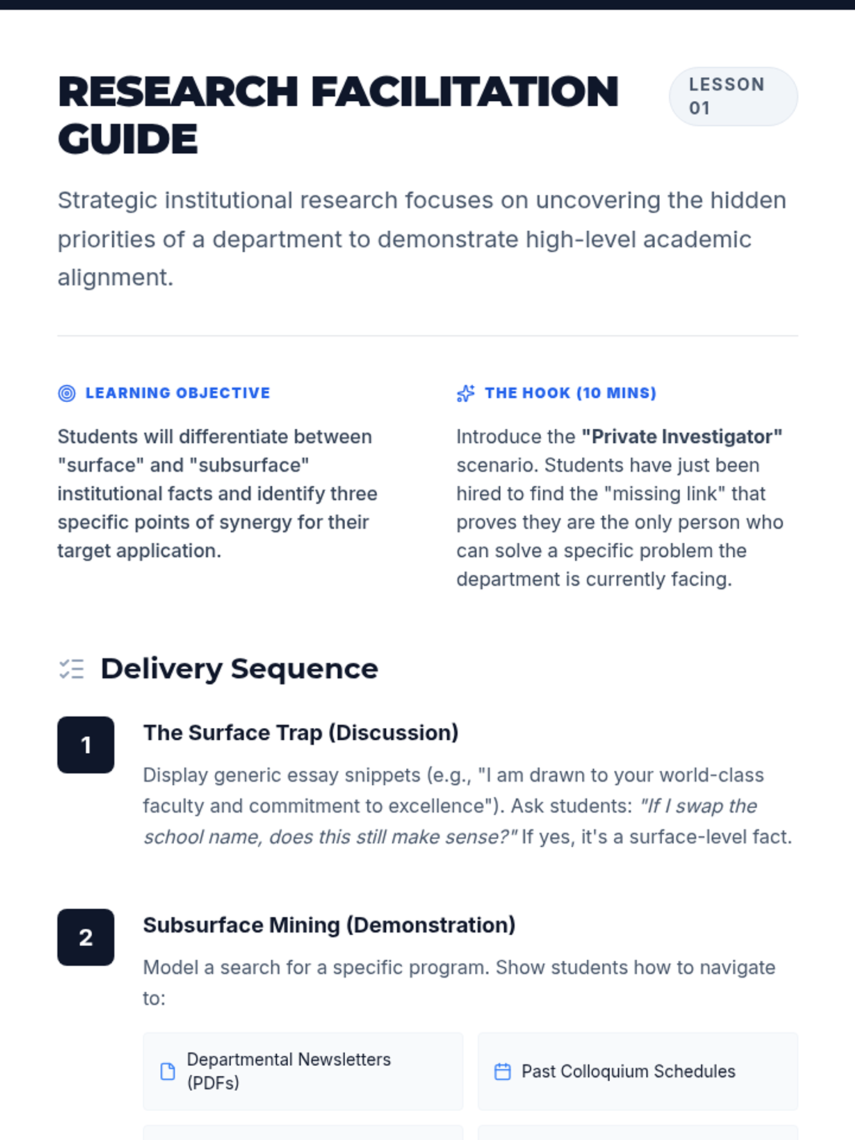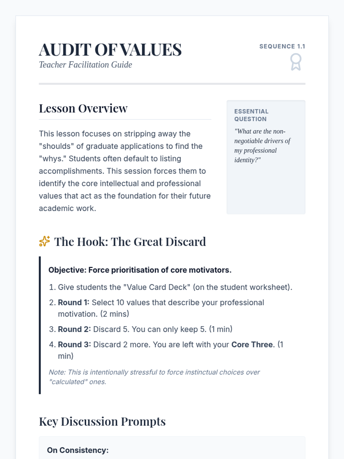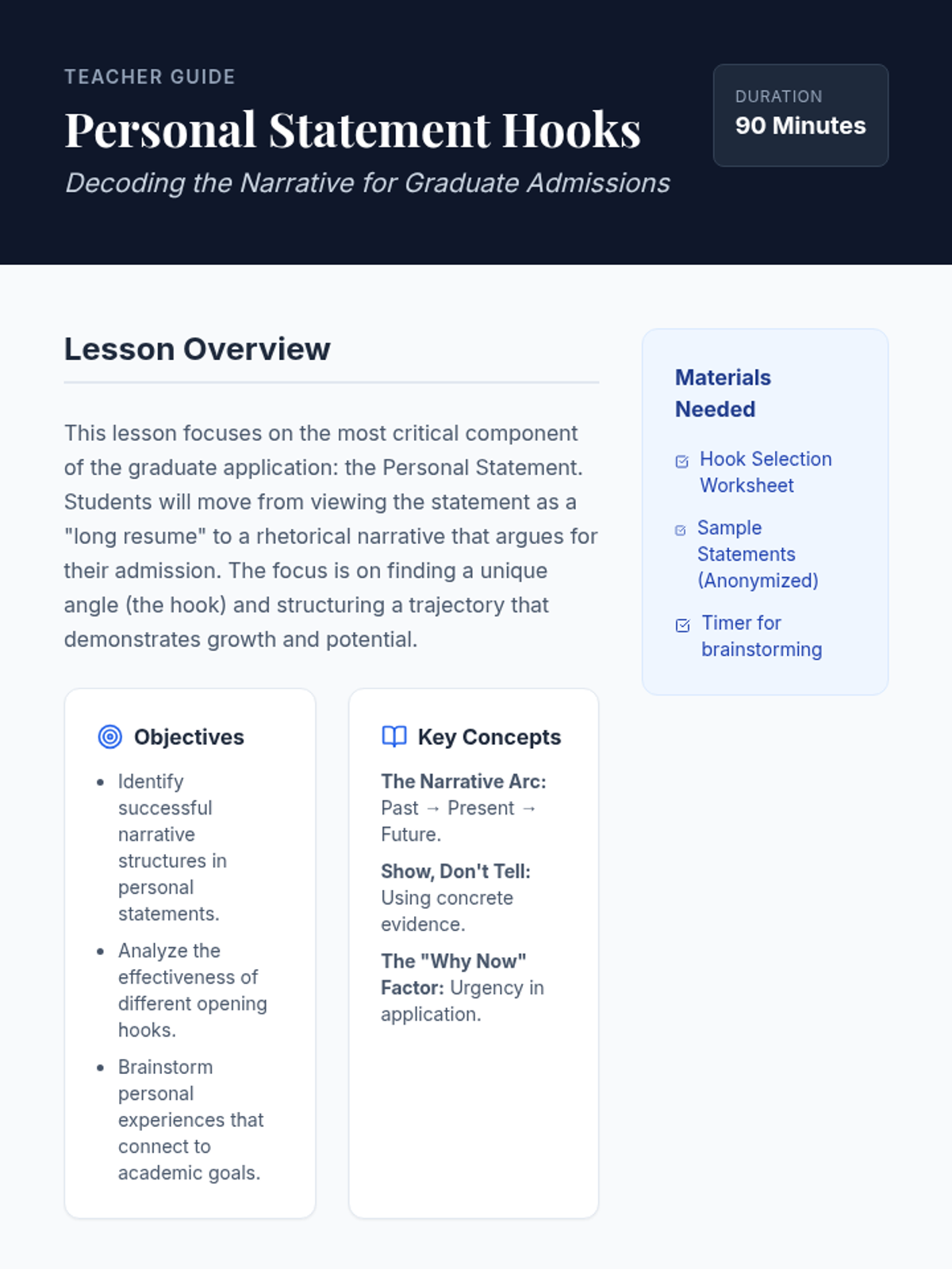 A 5-lesson sequence for graduate students to identify and articulate their professional and academic identity for personal statement writing. The sequence covers value identification, intellectual mapping, narrative construction, reframing challenges, and synthesizing a personal thesis.