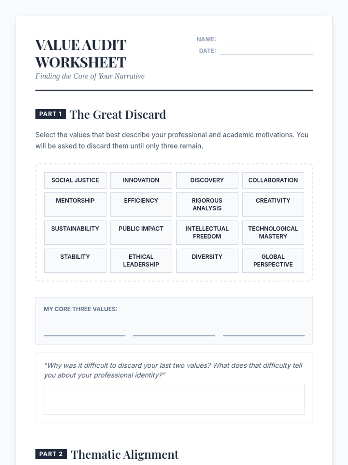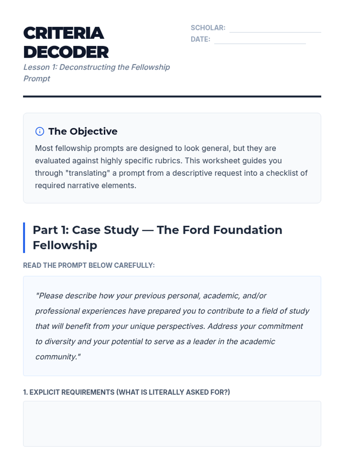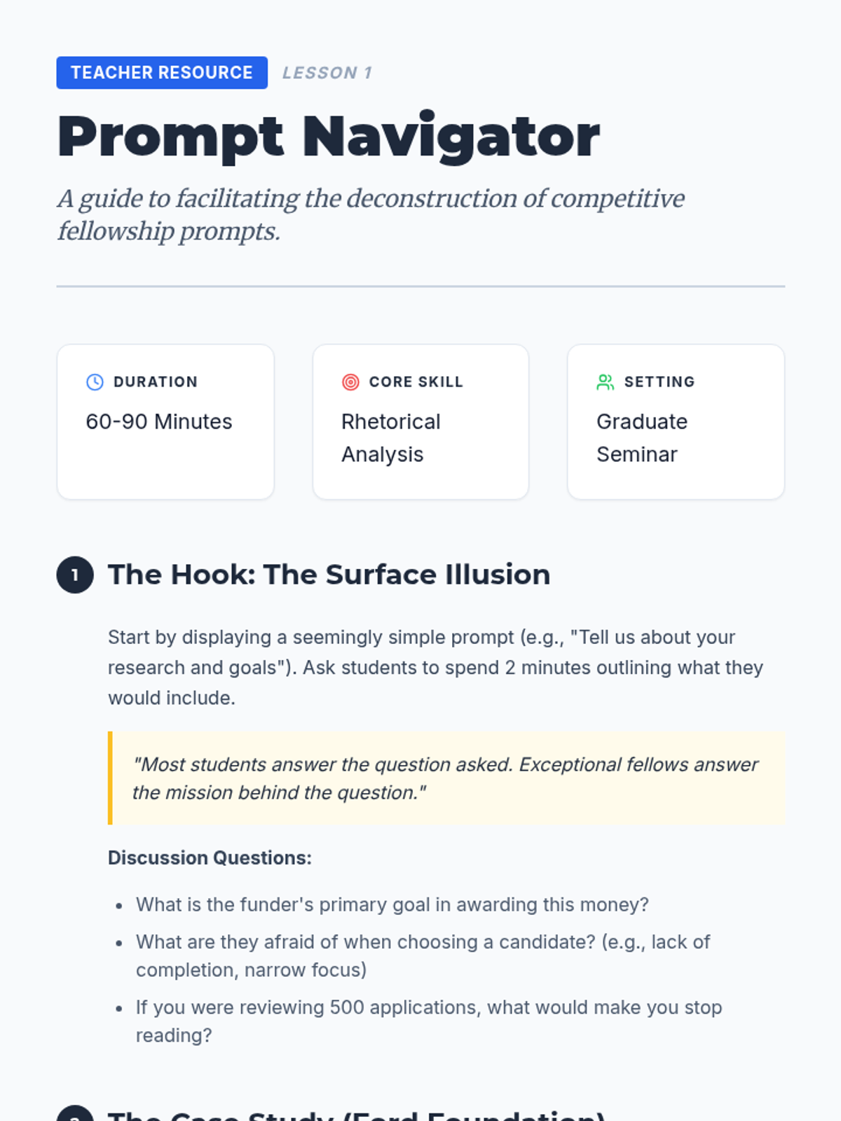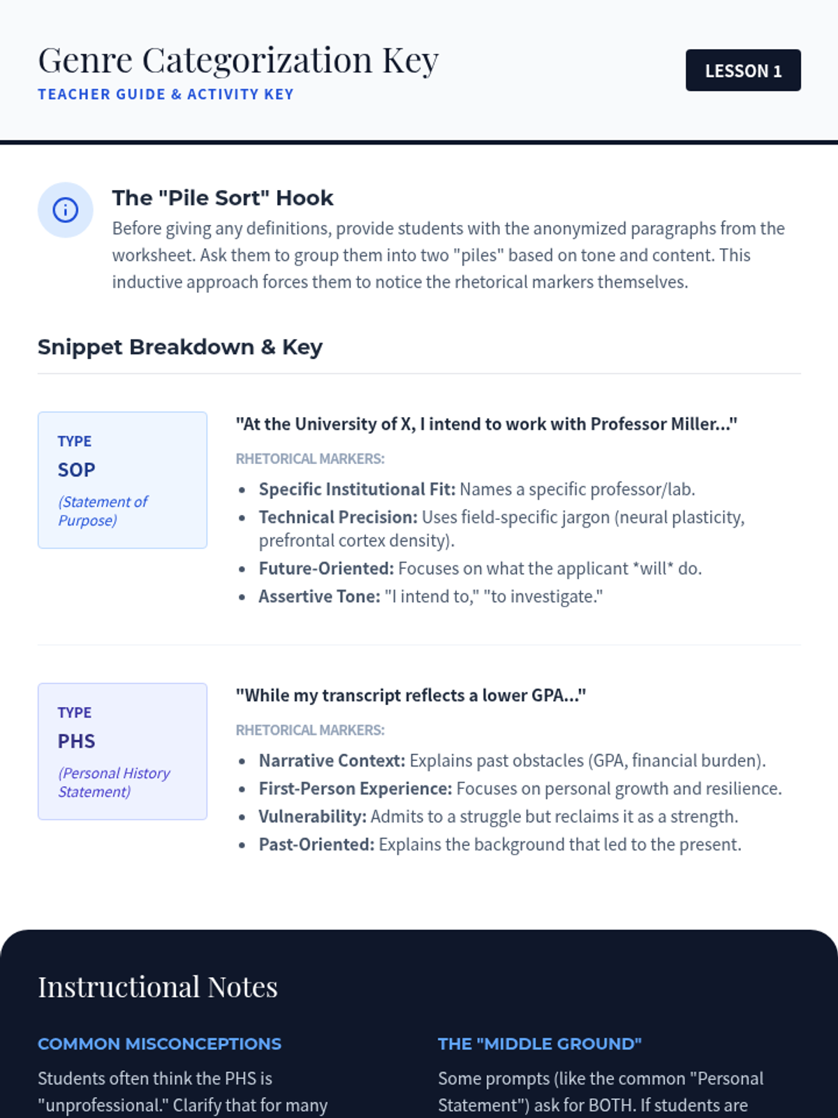 A 5-lesson sequence for graduate students to identify and articulate their professional and academic identity for personal statement writing. The sequence covers value identification, intellectual mapping, narrative construction, reframing challenges, and synthesizing a personal thesis.