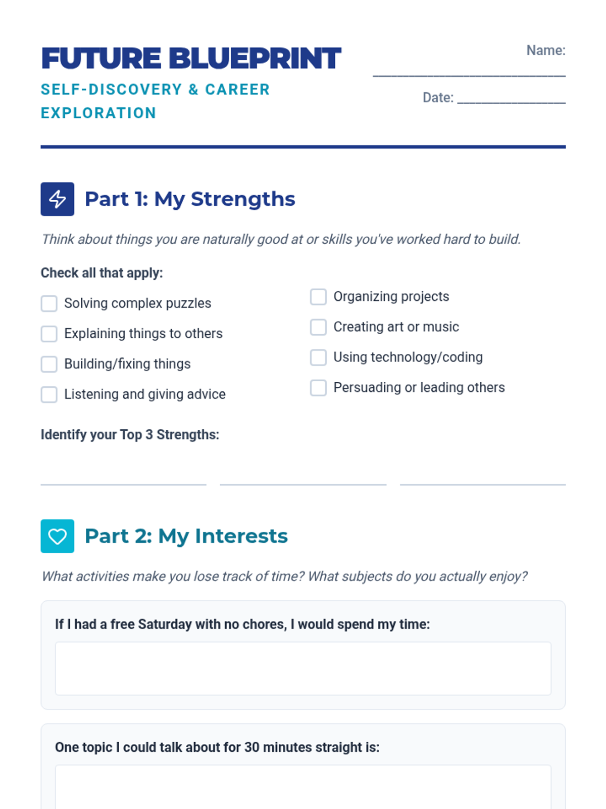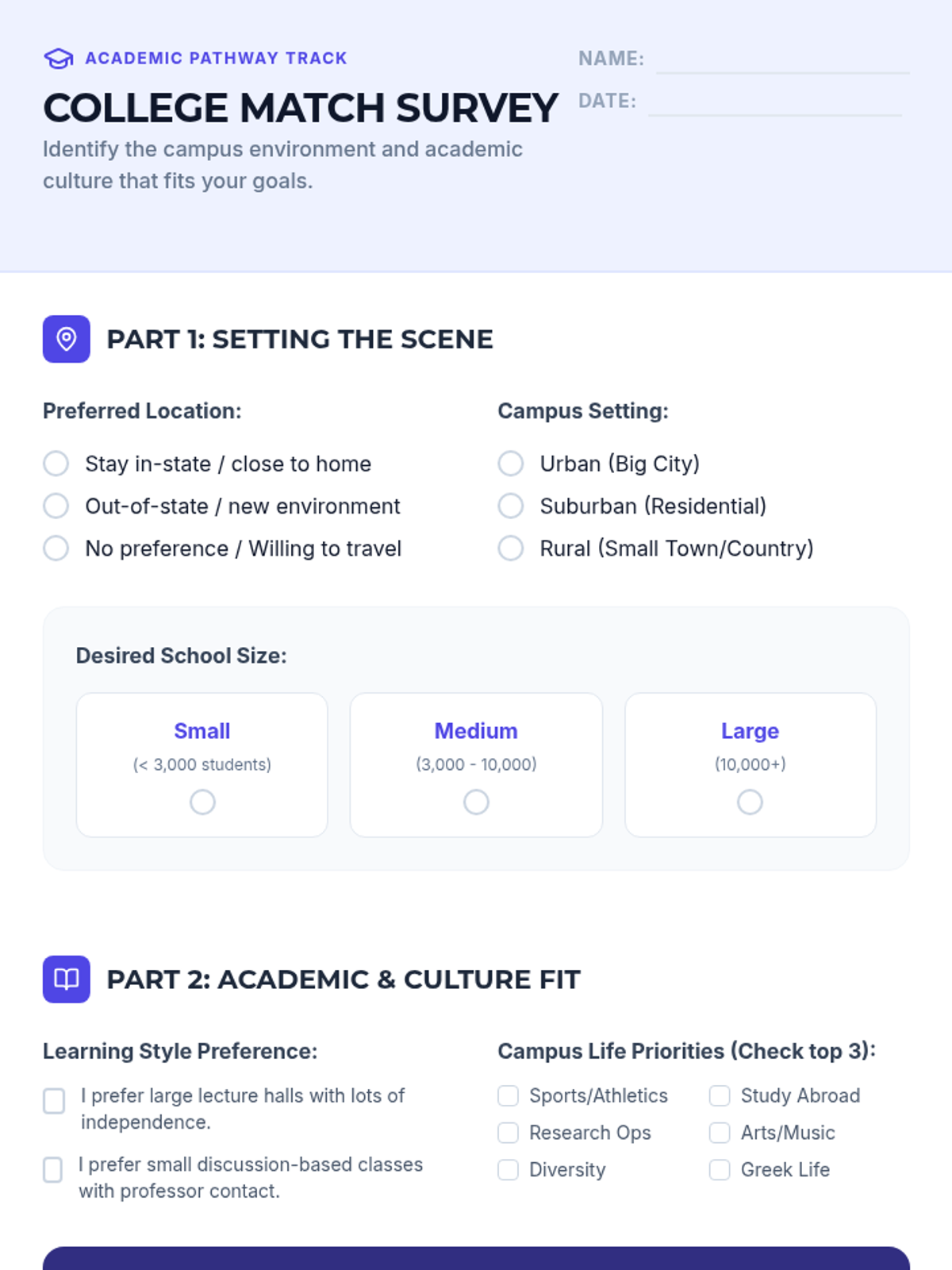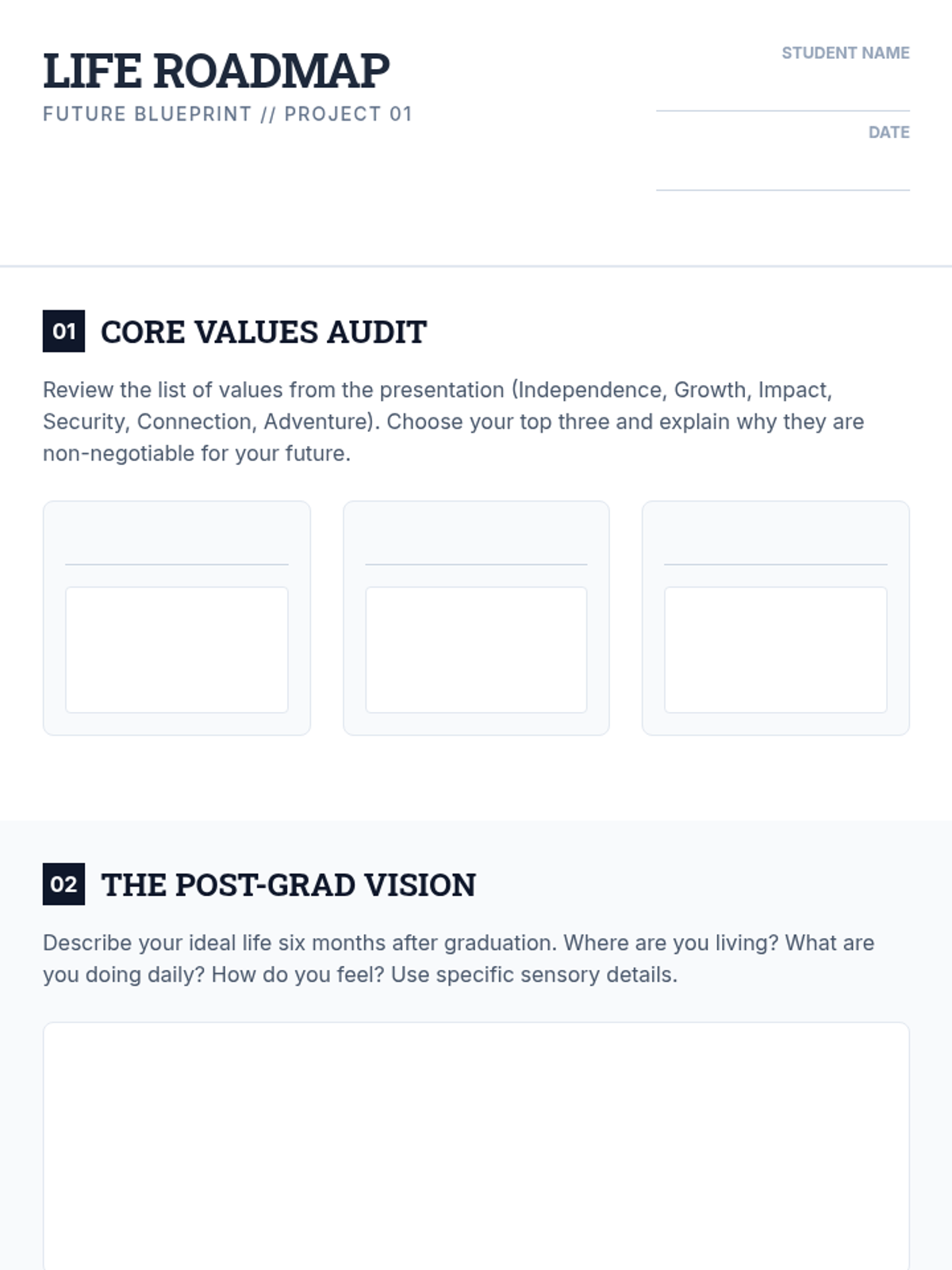 College selection, application workflows, and financial aid navigation including FAFSA and scholarship acquisition. Builds skills in personal statement writing and career exploration to align post-secondary choices with long-term professional goals.