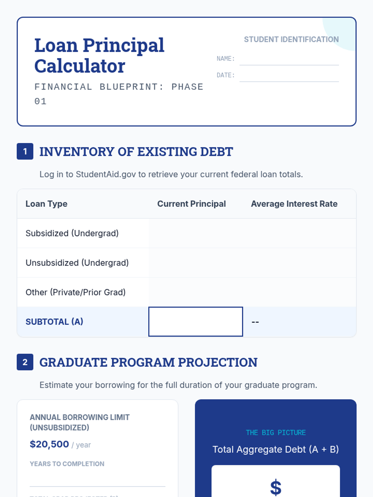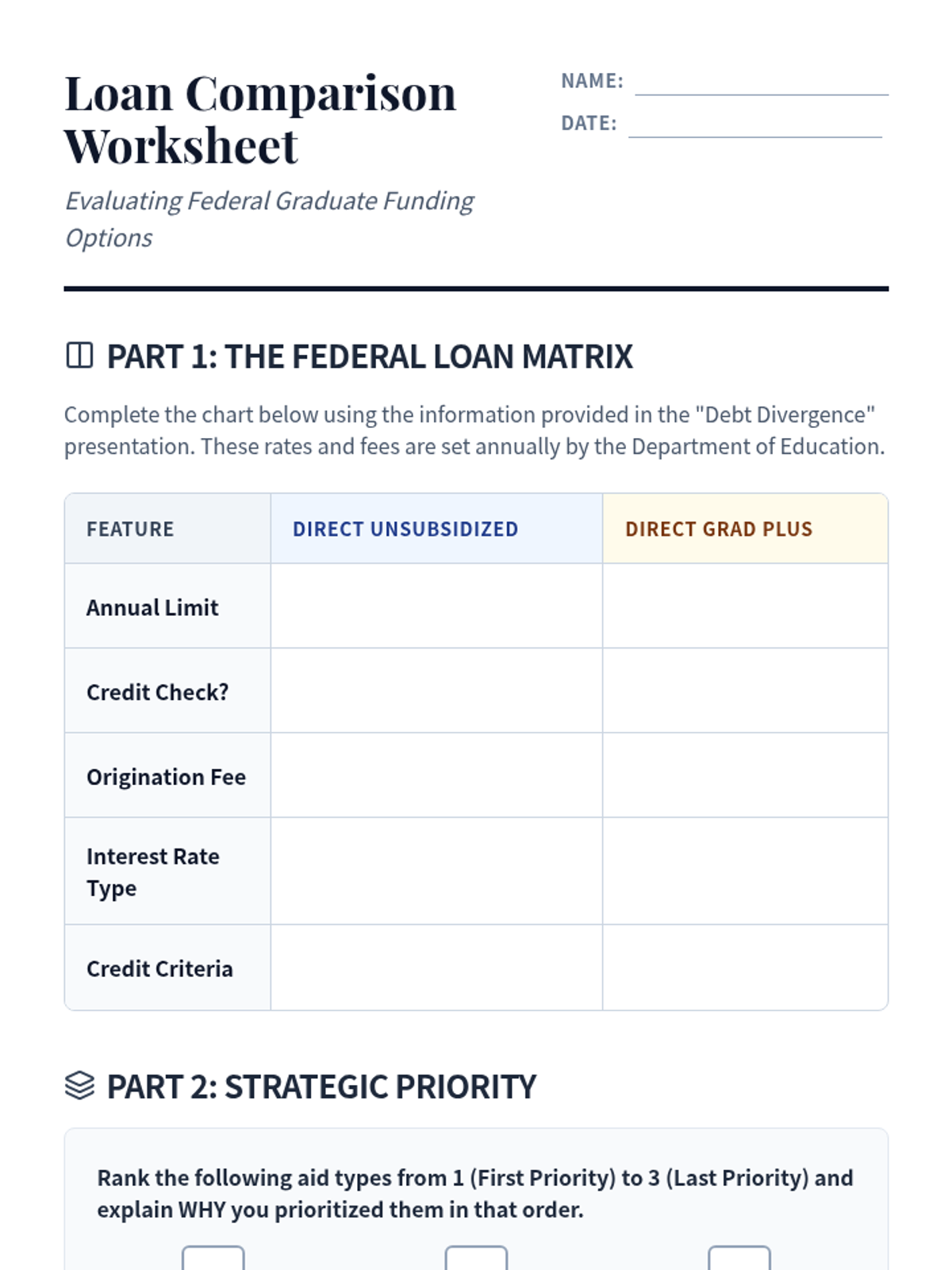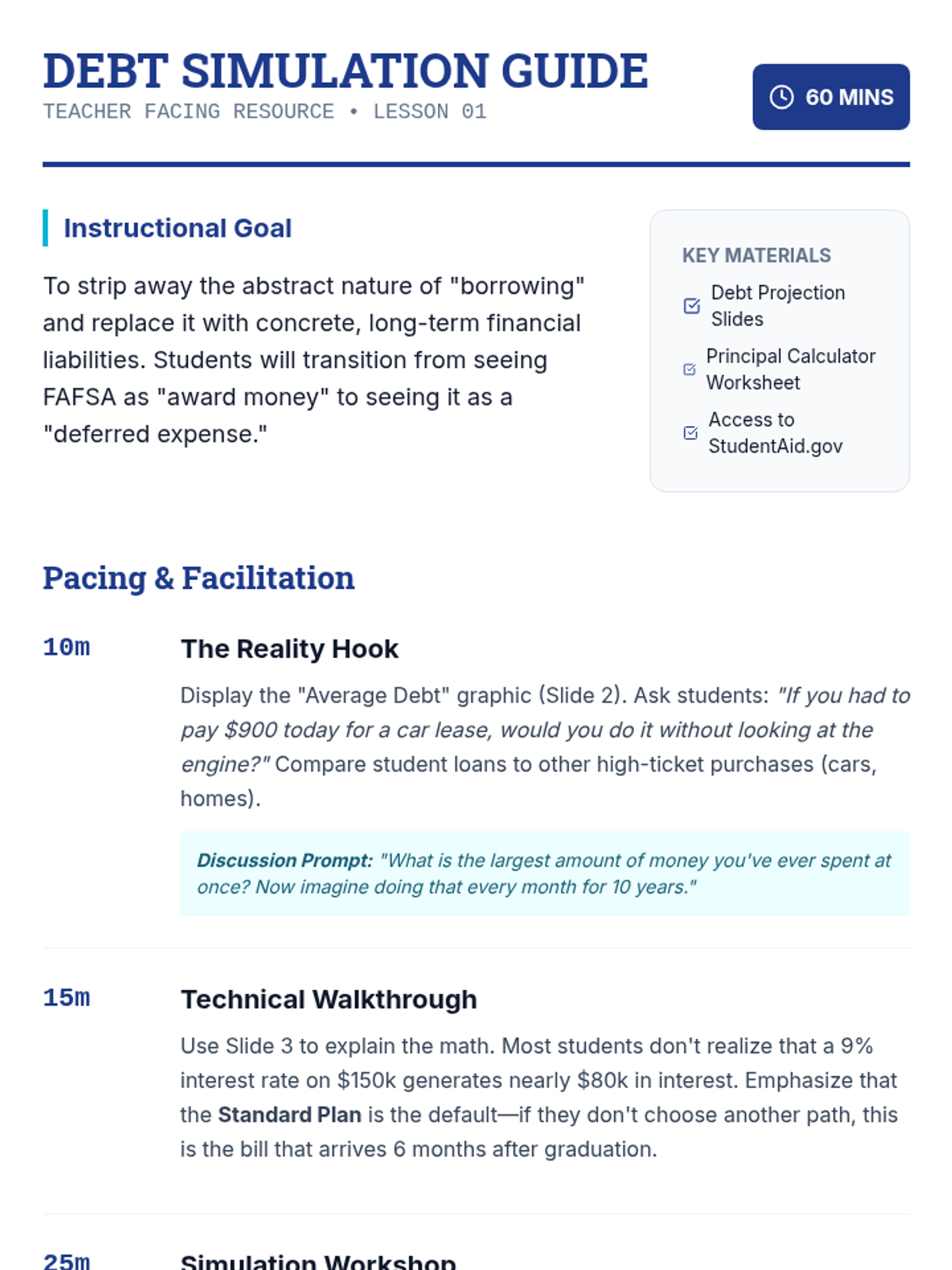 A comprehensive 5-lesson unit for graduate students that bridges the gap between FAFSA borrowing and long-term repayment. Students explore debt forecasting, repayment plans (IDR/PSLF), interest mechanics, and the legal implications of the Master Promissory Note.