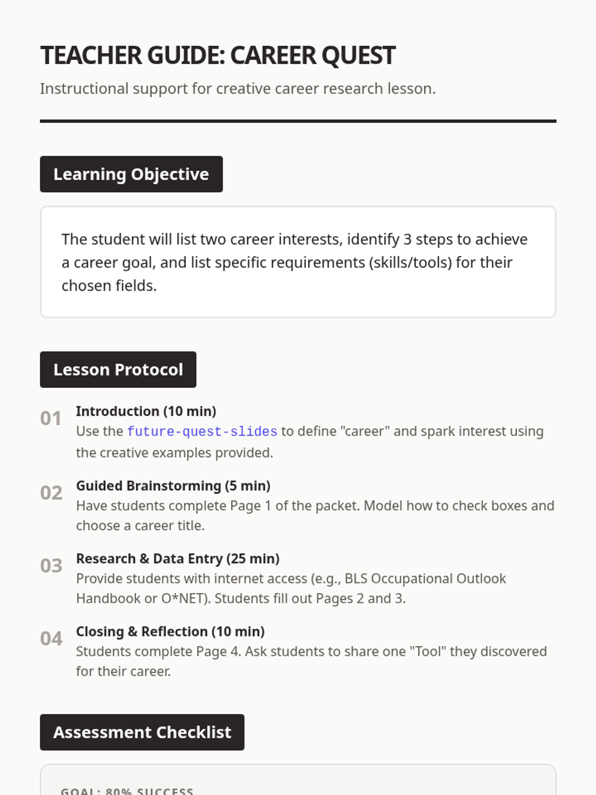 A comprehensive 2-hour lesson sequence focused on career exploration, starting with O*NET interest profiling and transitioning into an in-depth study of hard and soft skills. Students will explore skill definitions, transferability, and development through reading, role-play, and interactive activities.