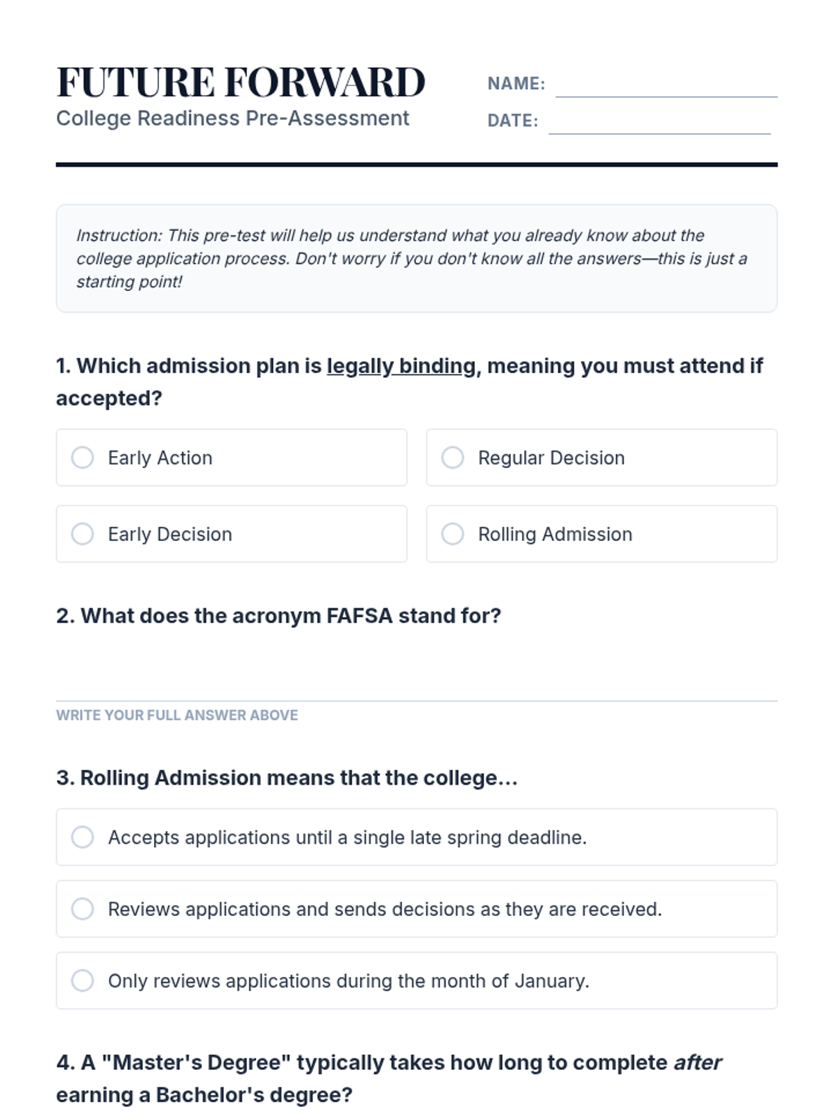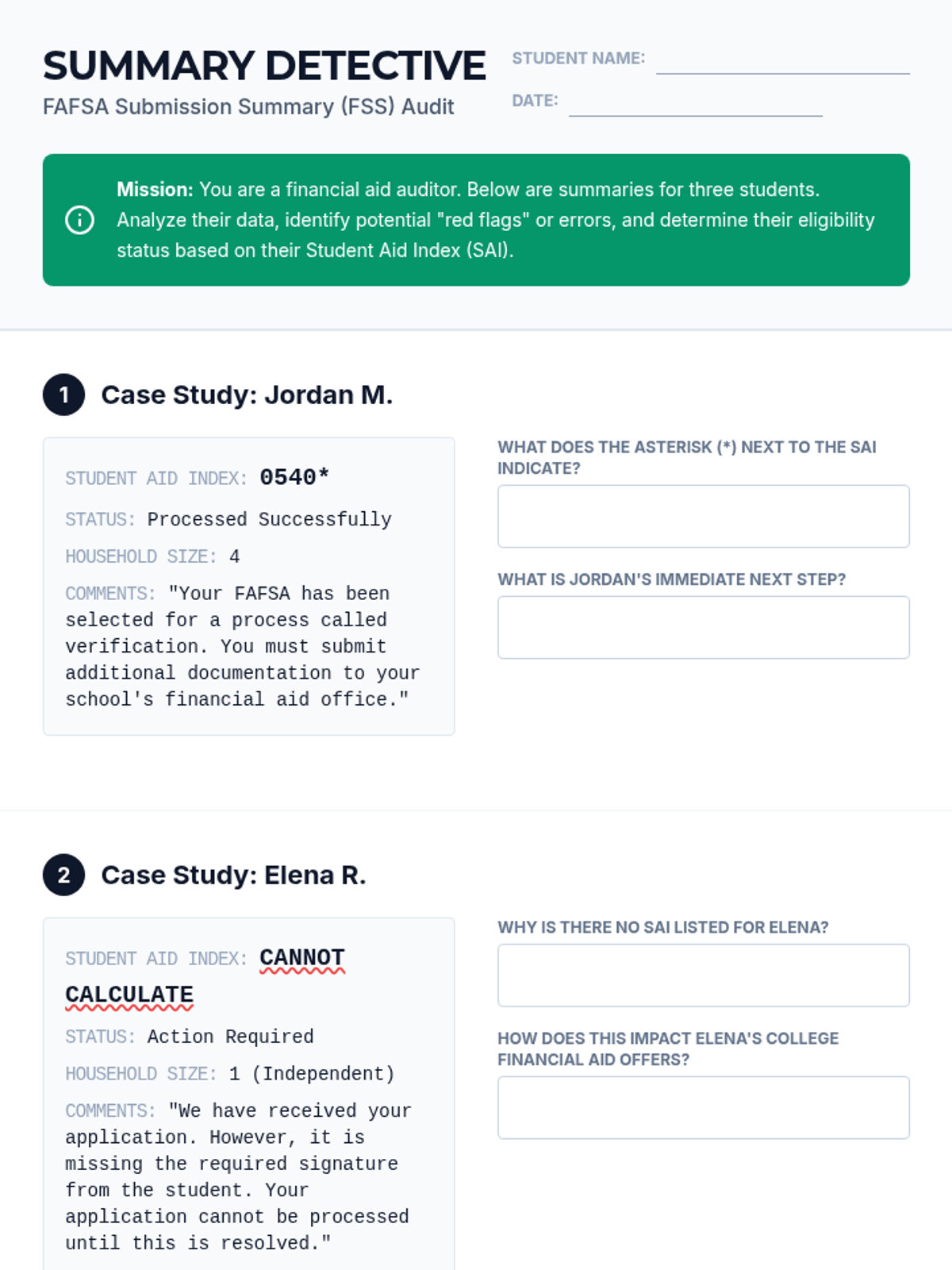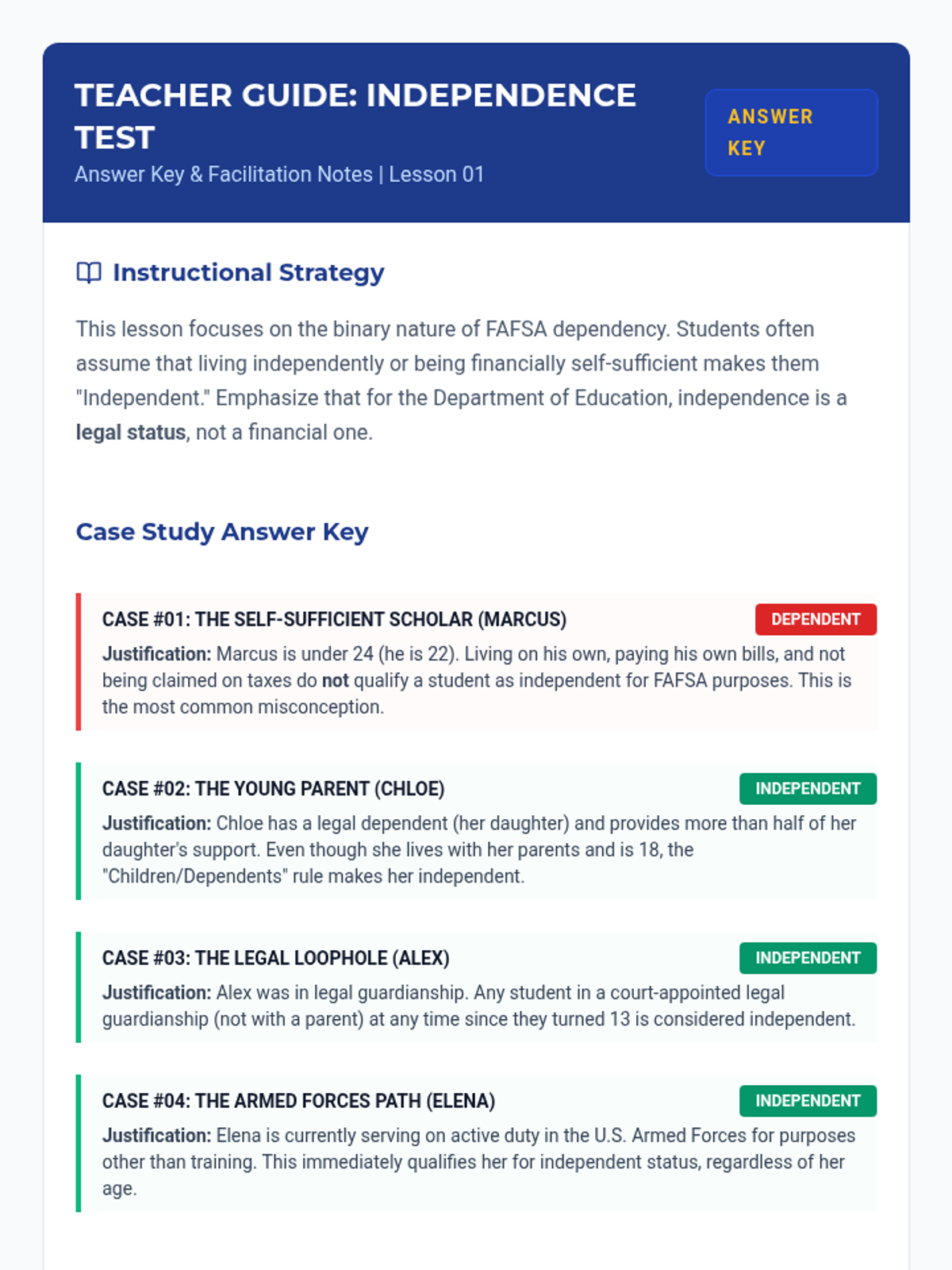 This 11th-grade sequence guides students through the complexities of the FAFSA, focusing on dependency status, household composition, and asset reporting. Students will use case studies to navigate diverse family structures and financial scenarios to ensure accurate aid calculations.