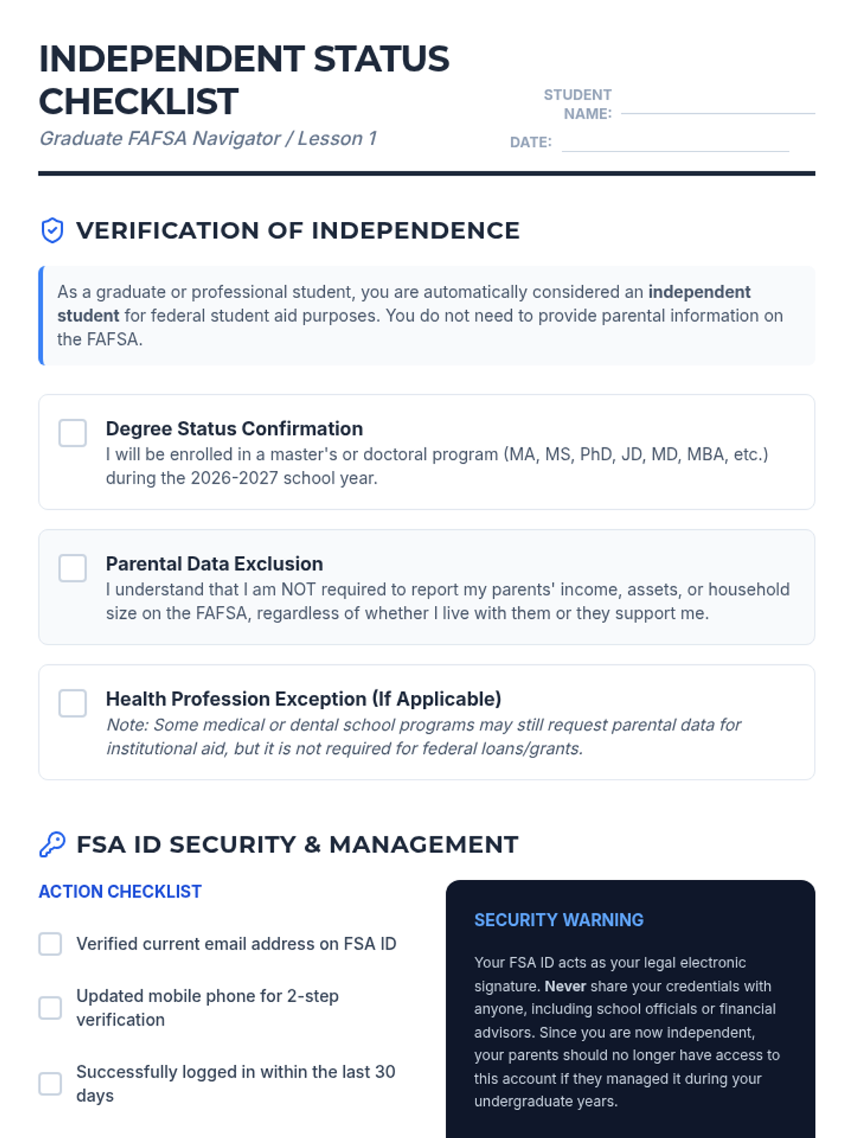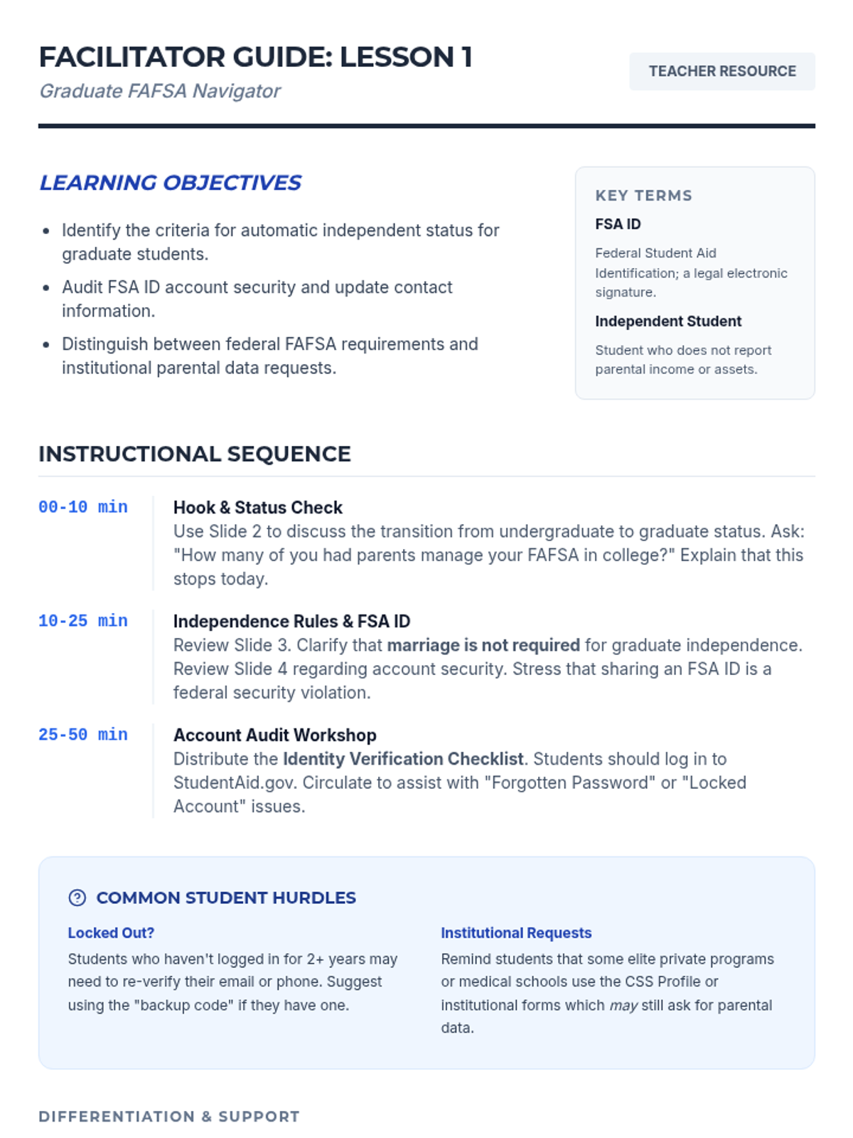 A comprehensive workshop-style sequence for graduate students navigating the FAFSA as independent applicants, focusing on technical requirements, asset reporting, and strategic planning.