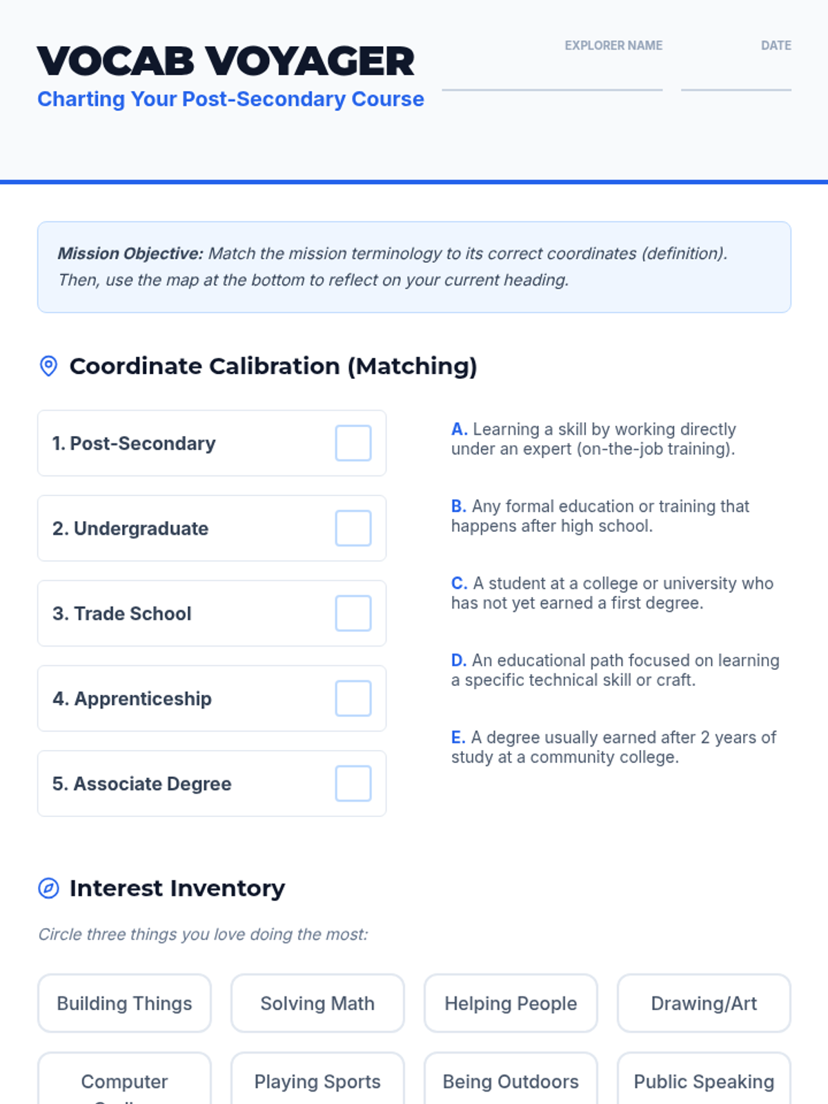 A comprehensive 12th-grade unit exploring post-secondary success through non-degree pathways, including apprenticeships, technical bootcamps, and stackable credentials. Students analyze program rigor, industry demand, and cost-benefit ratios to build viable alternatives to traditional 4-year degrees.