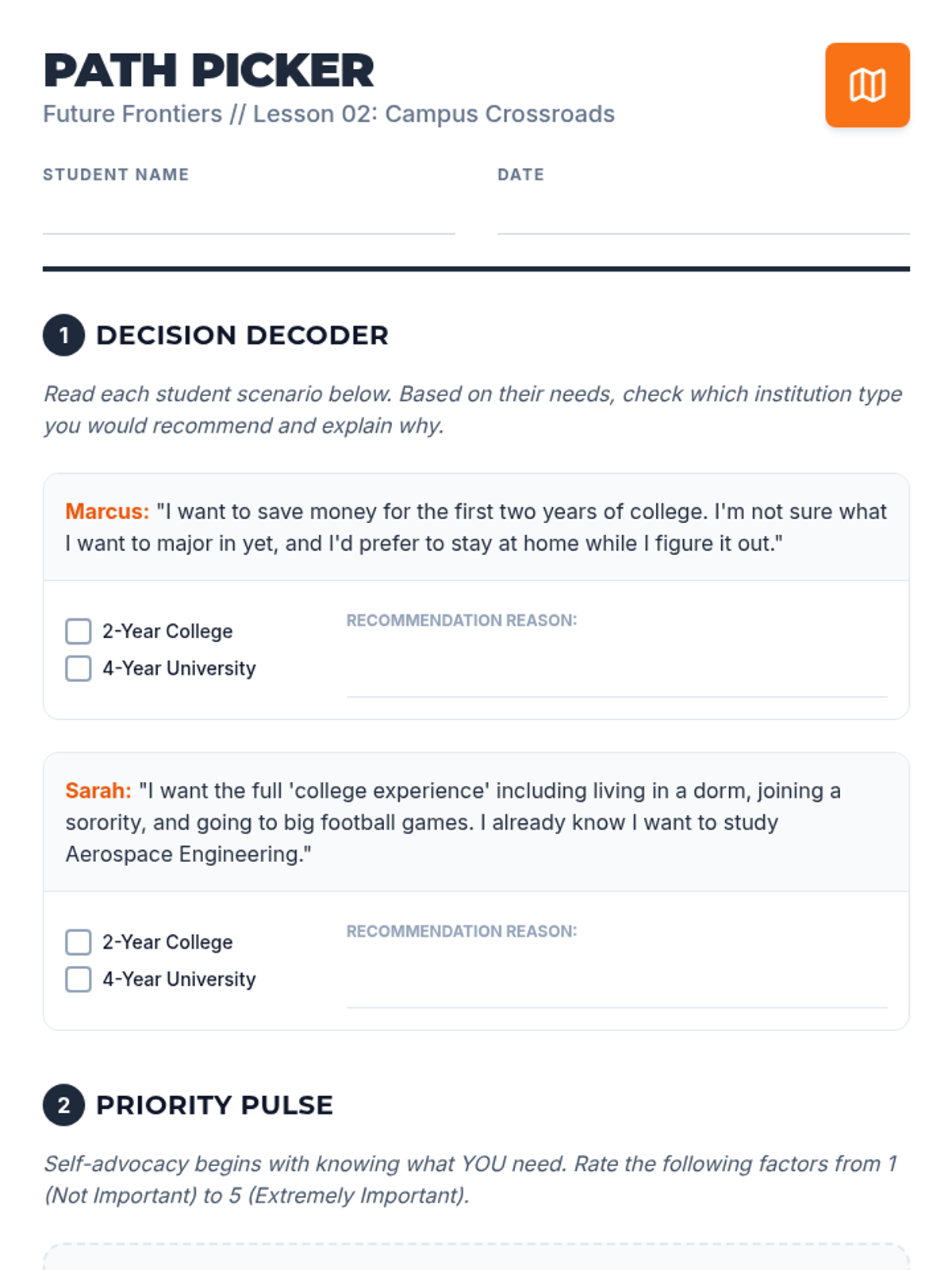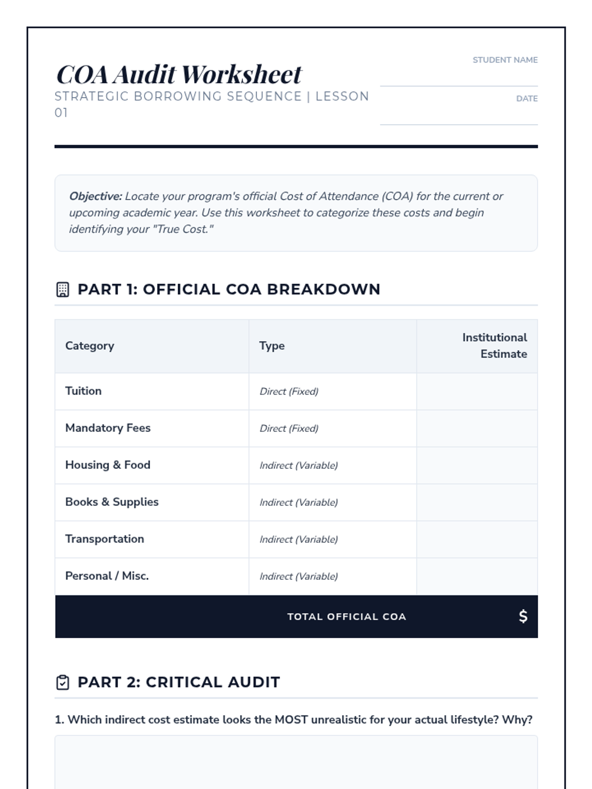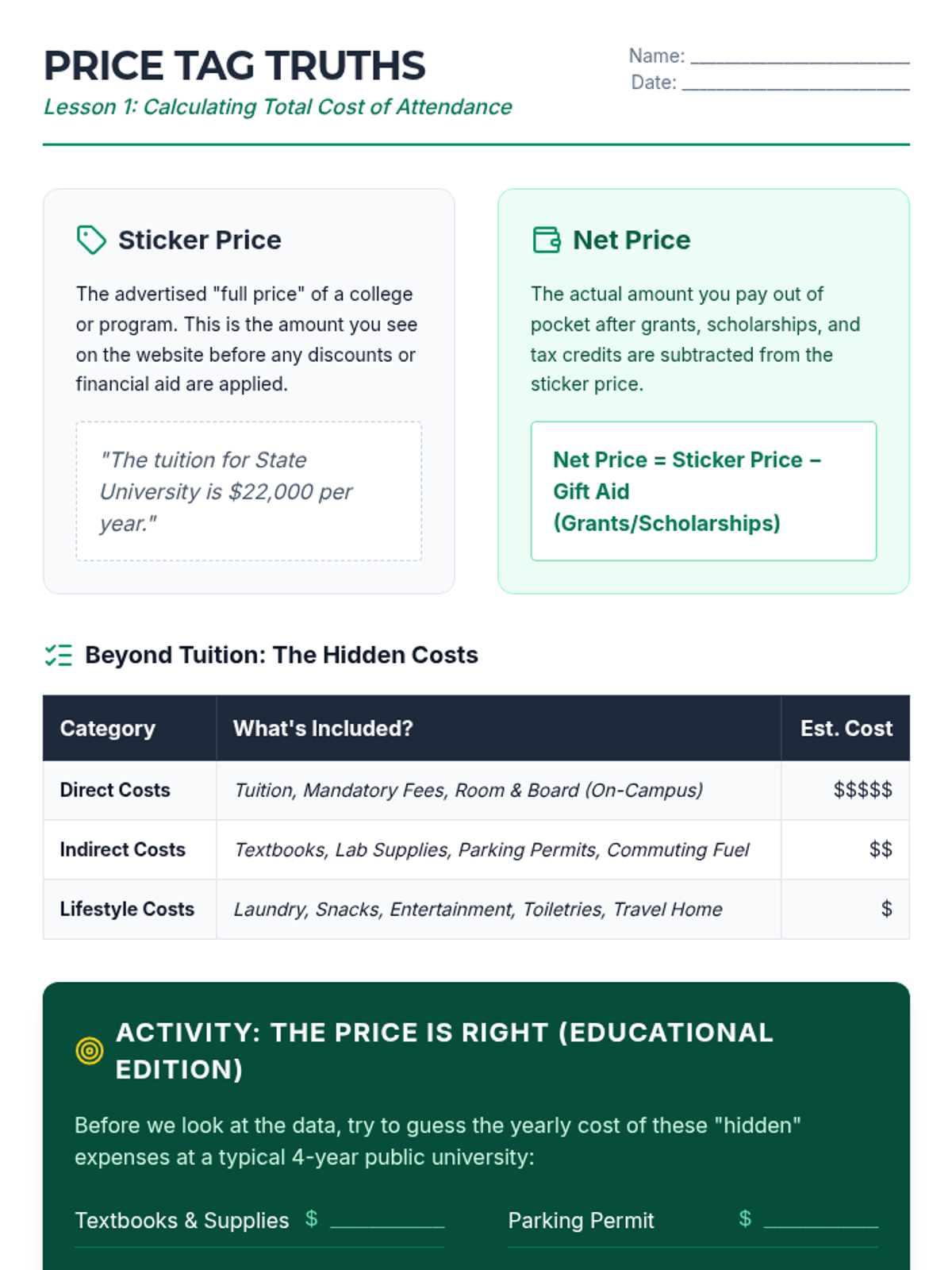 A comprehensive guide for 12th-grade students to navigate the financial complexities of post-secondary education. Students analyze total cost of ownership, debt structures, and Return on Investment (ROI) to create a sustainable financial roadmap for their future.