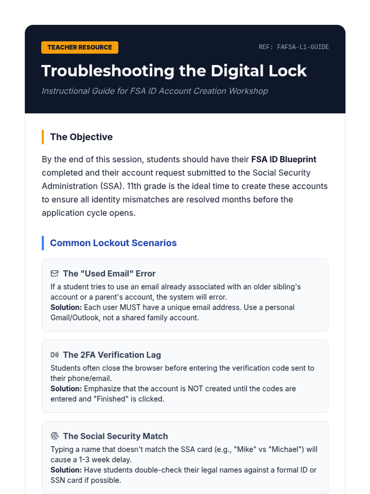 A comprehensive sequence for 11th-grade students to demystify financial aid and prepare for the FAFSA application process. Students will explore aid types, establish digital identities, navigate dependency rules, interpret tax documents, and build a strategic timeline for senior year.