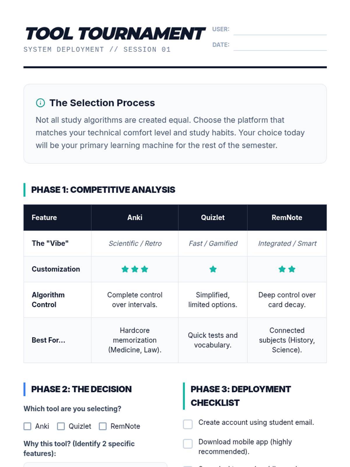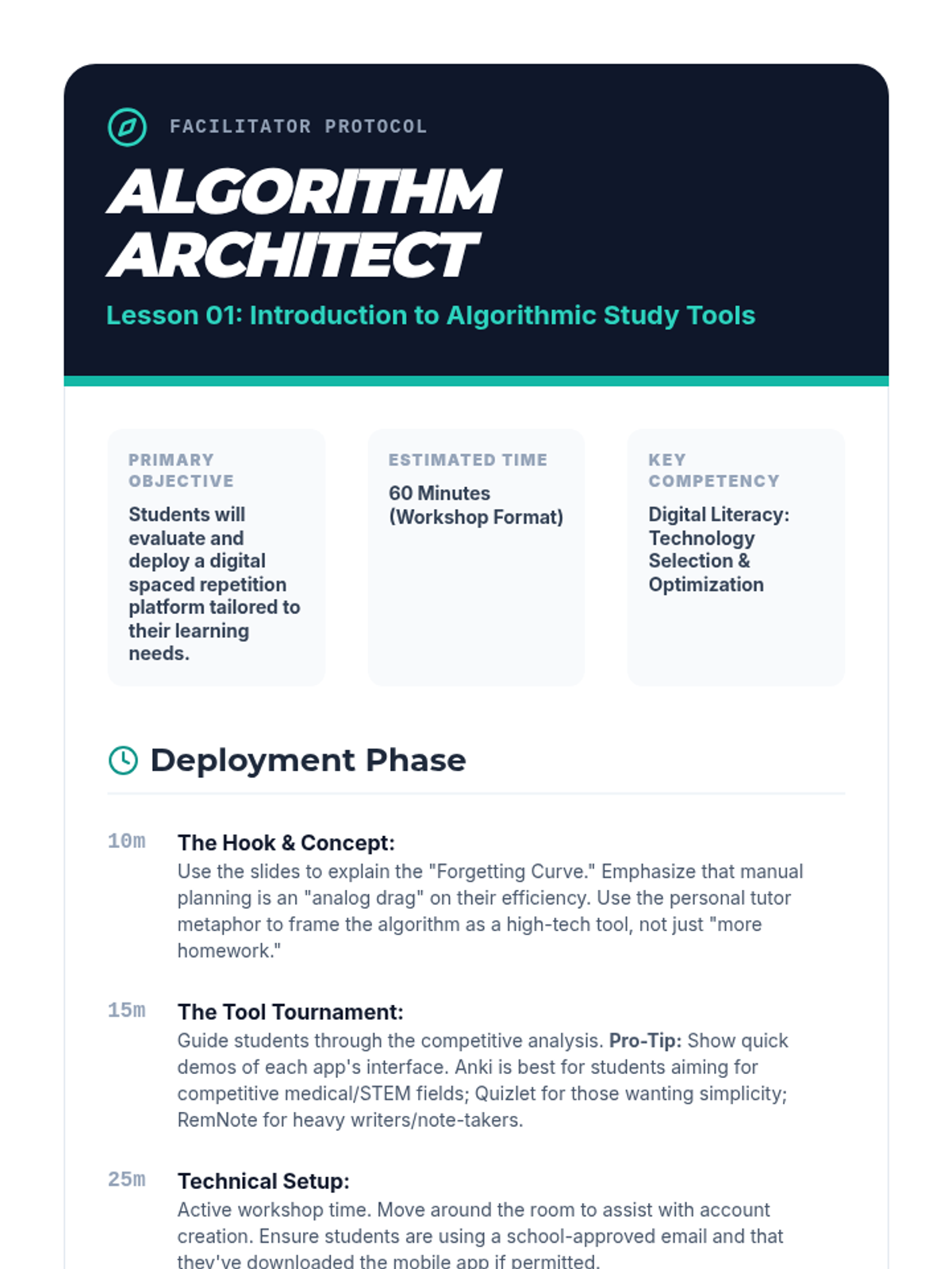 This sequence transitions 12th-grade students from manual study methods to digital spaced repetition software (SRS). Students will master advanced card-creation techniques, interpret retention data to optimize their learning, and develop long-term maintenance strategies for post-secondary success.