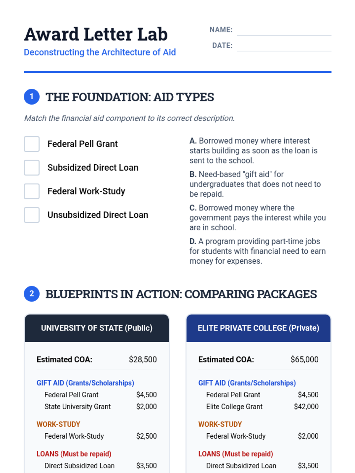 A project-based sequence for 10th-grade students to master the complexities of college funding. Students will learn to deconstruct costs, prioritize non-repayable aid, interpret confusing financial aid letters, and design a sustainable borrowing strategy to minimize long-term debt.
