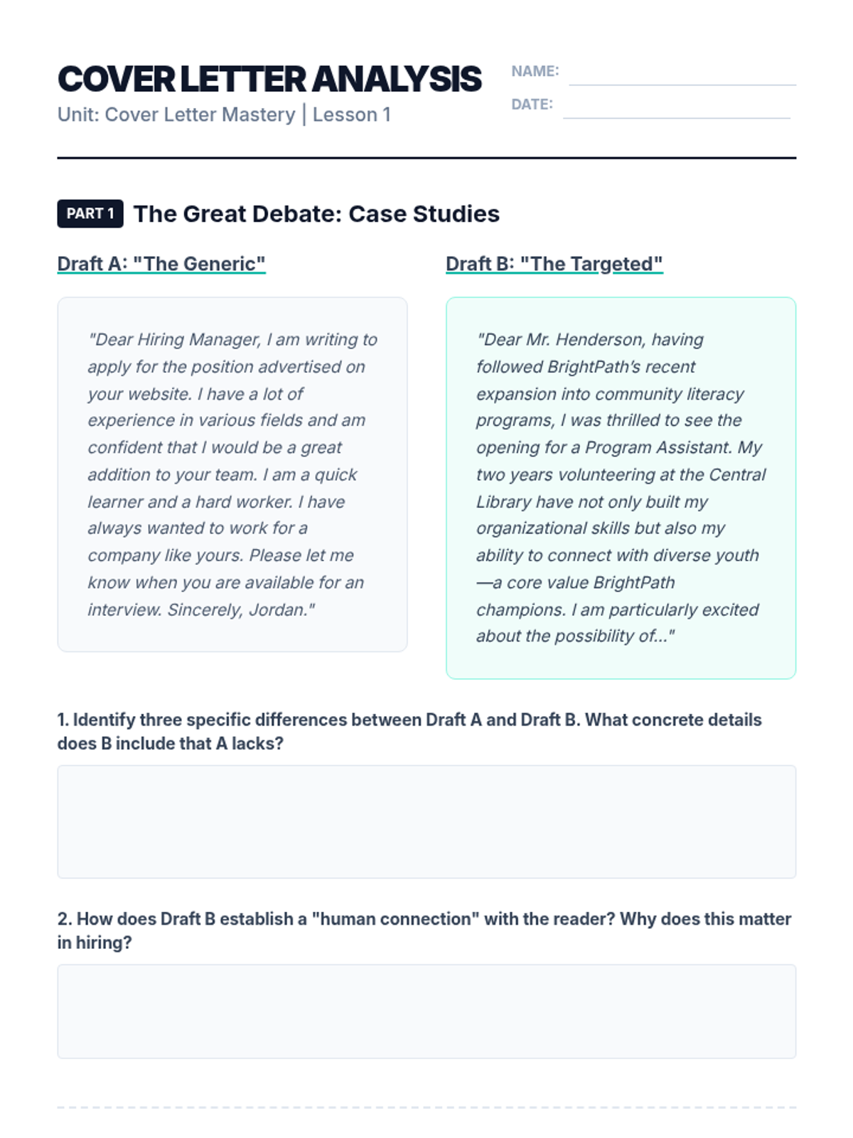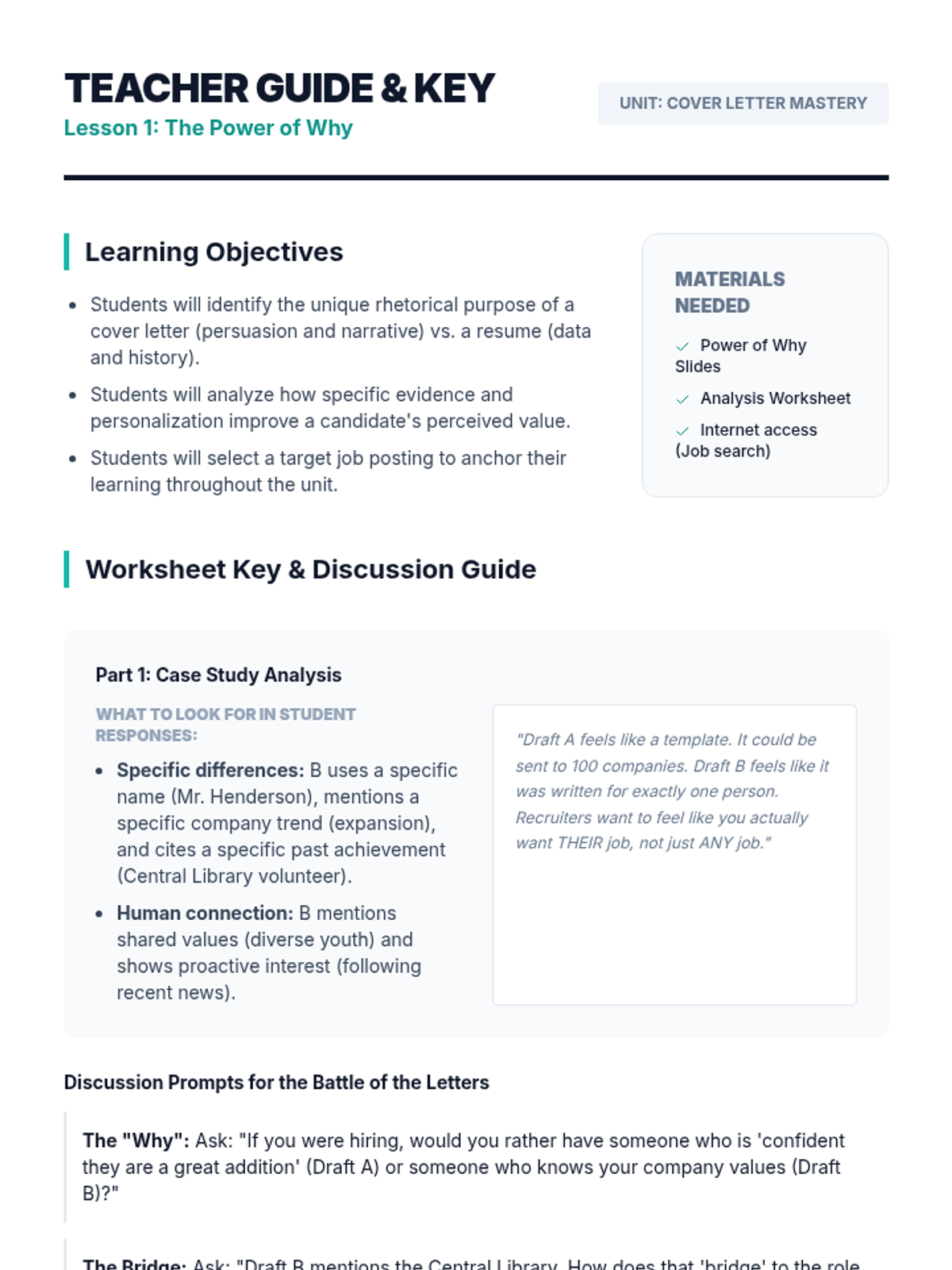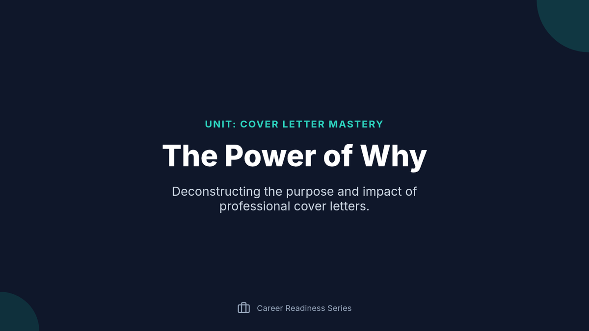 A comprehensive 5-lesson unit for 12th-grade students to master the art of writing persuasive, tailored cover letters. Students learn to decode job descriptions, craft compelling narratives, and apply professional business formatting.