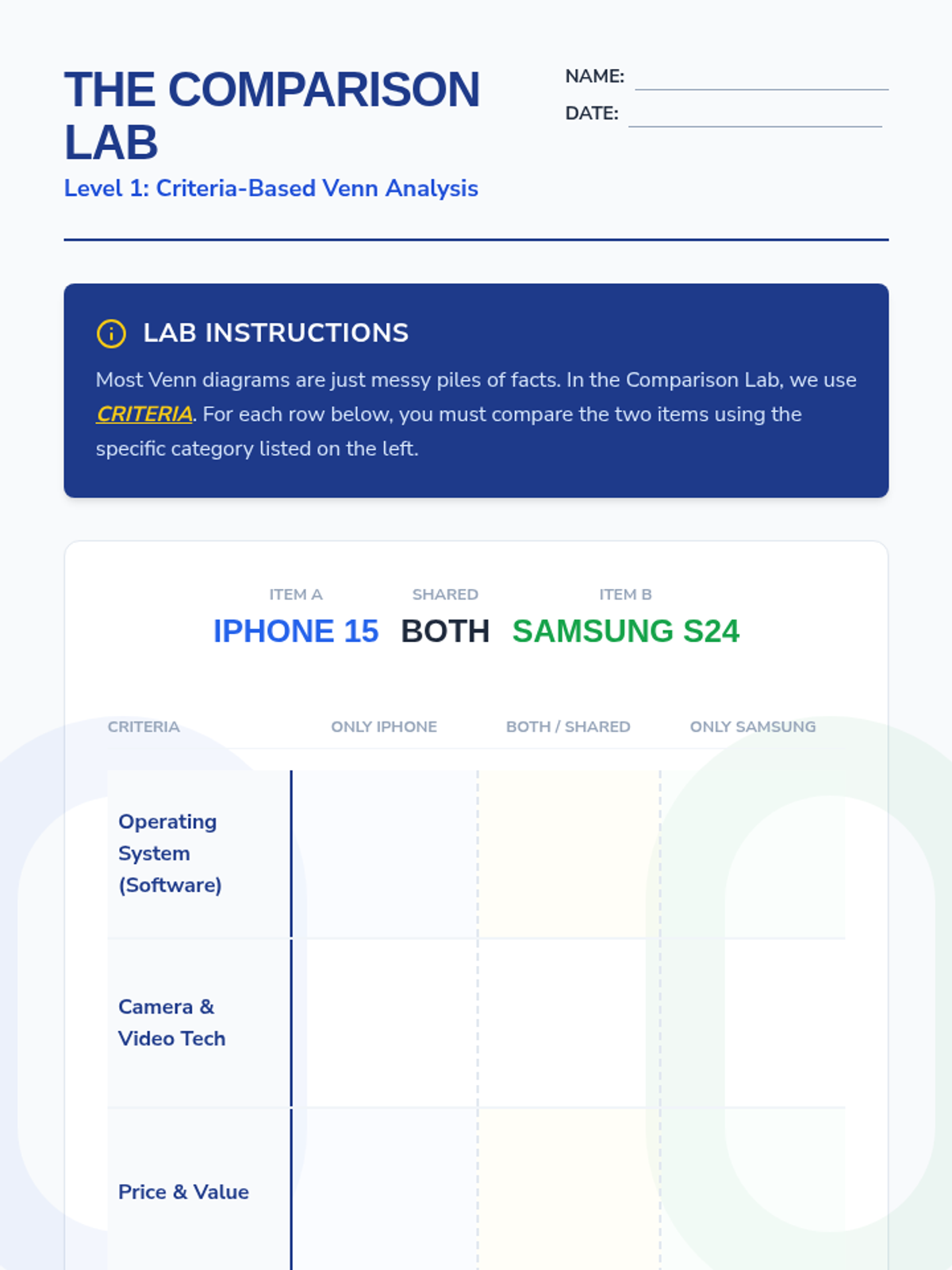 A 9th-grade academic support sequence focused on teaching students how to use advanced graphic organizers—specifically criteria-based Venn diagrams and comparison matrices—to analyze information, compare perspectives, and synthesize findings into written arguments. Students move from basic observations to evaluative decision-making using structured visual tools.