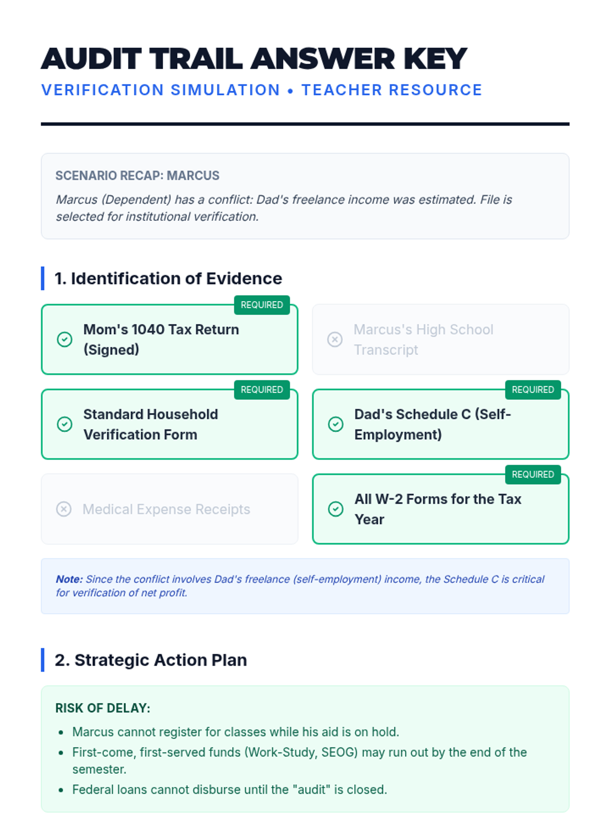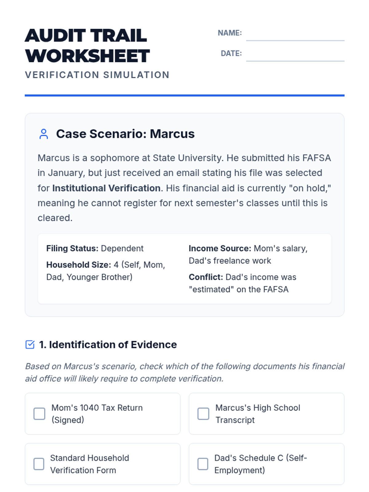 This sequence guides undergraduate students through the complexities of FAFSA verification, professional judgment appeals, and unique filing statuses. It focuses on self-advocacy and navigating bureaucratic exceptions to ensure equitable financial aid.