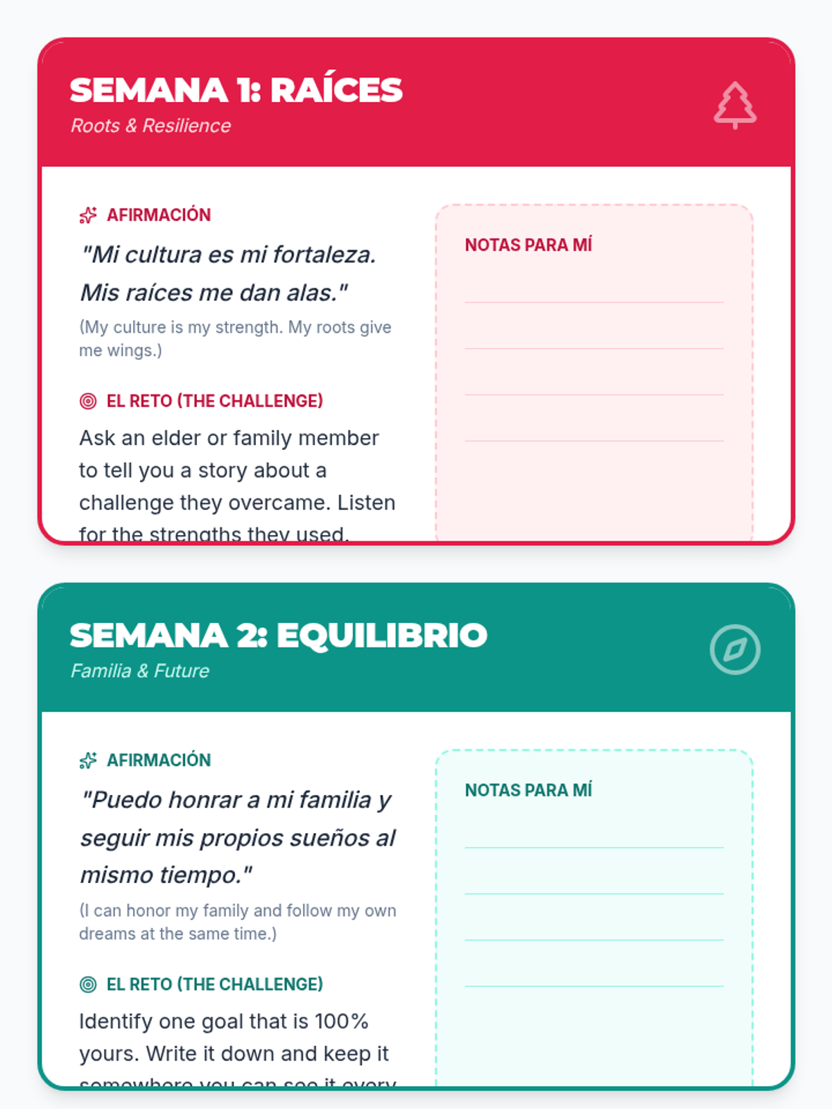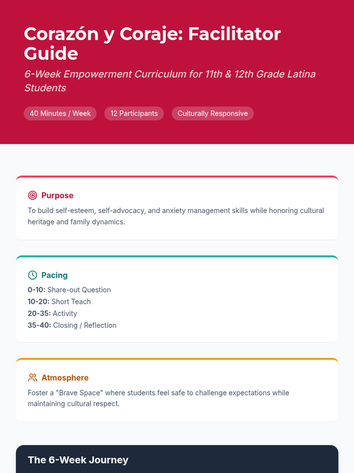 A 6-week empowerment curriculum for 11th and 12th grade Latina students, focusing on self-esteem, self-advocacy, anxiety management, and navigating family expectations through a culturally responsive lens.