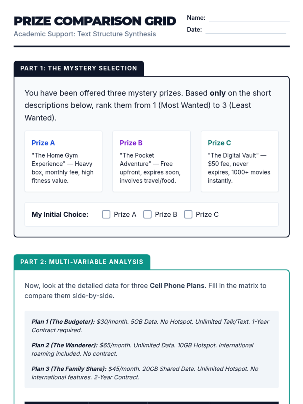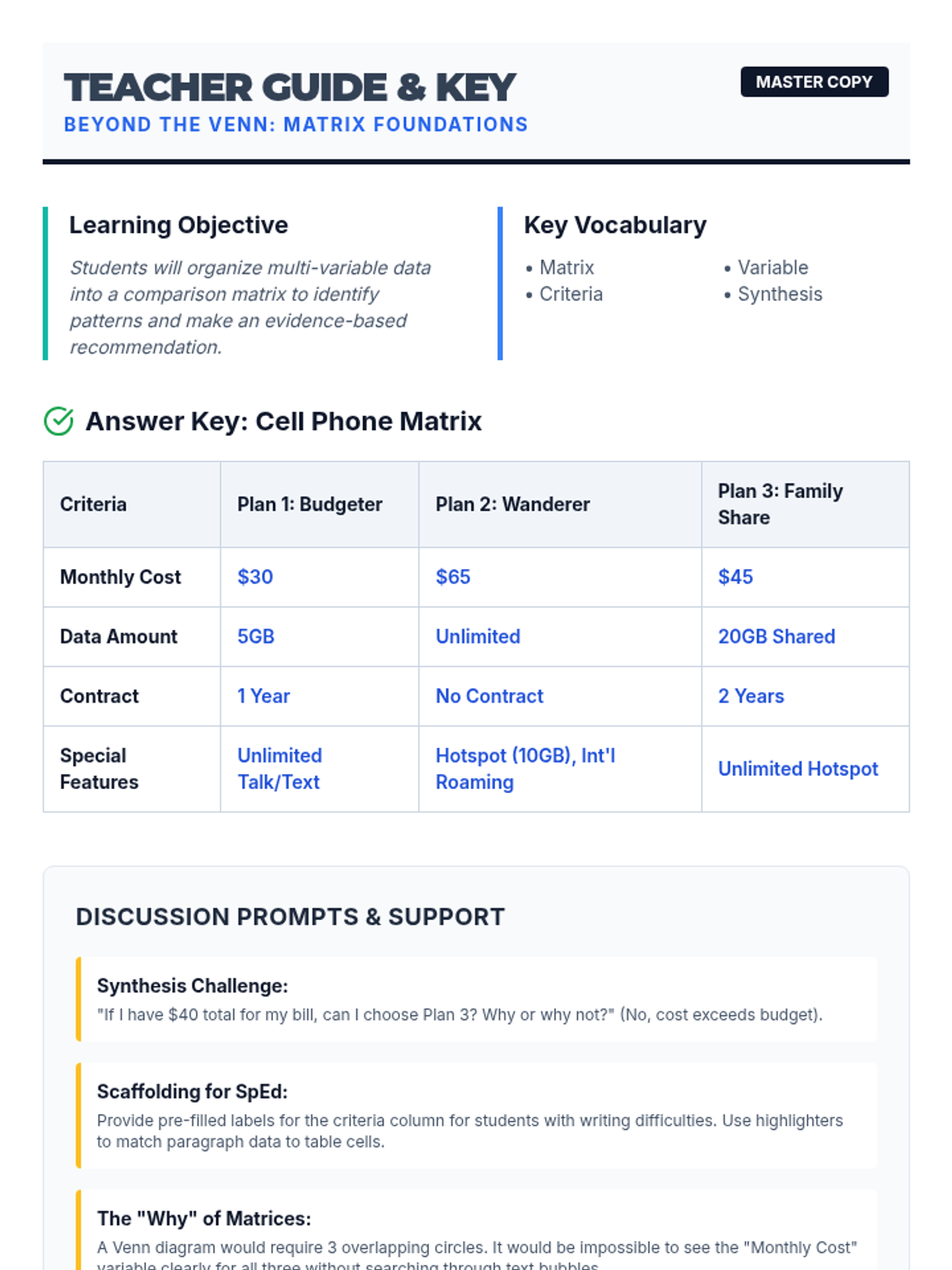 A higher-education and career-readiness sequence for 12th-grade students focused on using matrices to synthesize complex, conflicting, and multi-variable information. Students move from basic data organization to high-level comparative analysis and source evaluation.