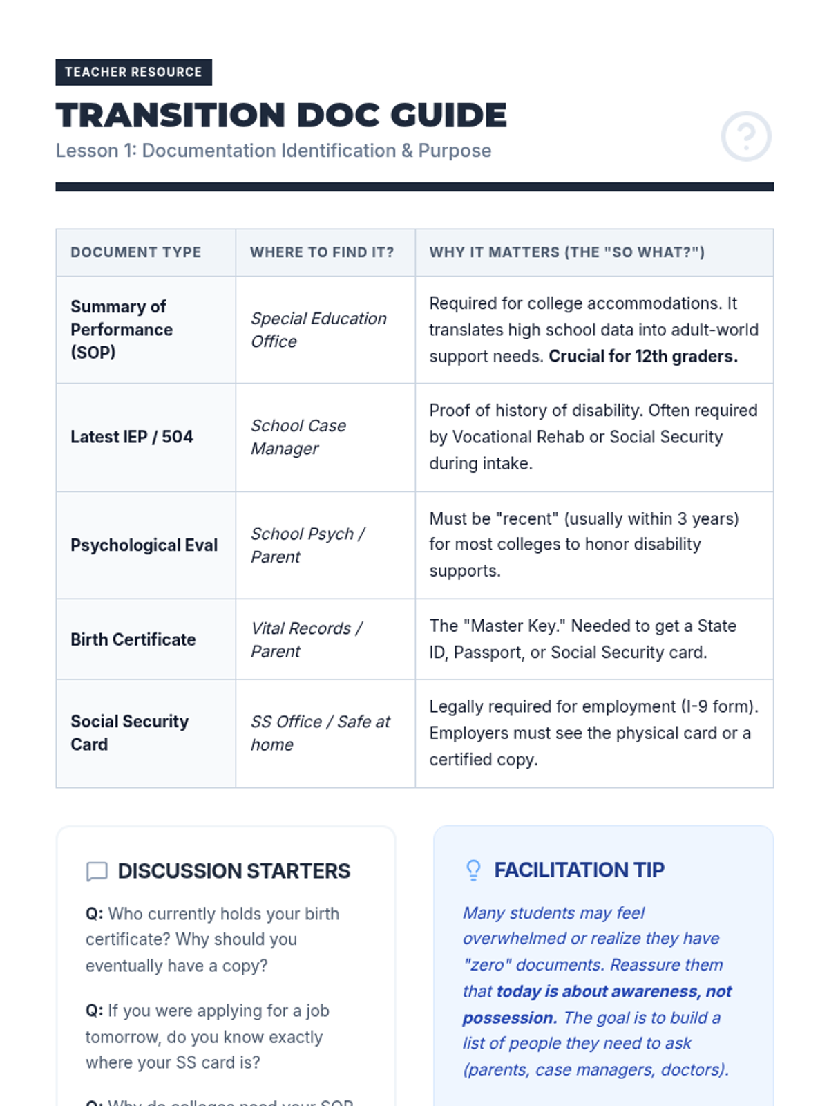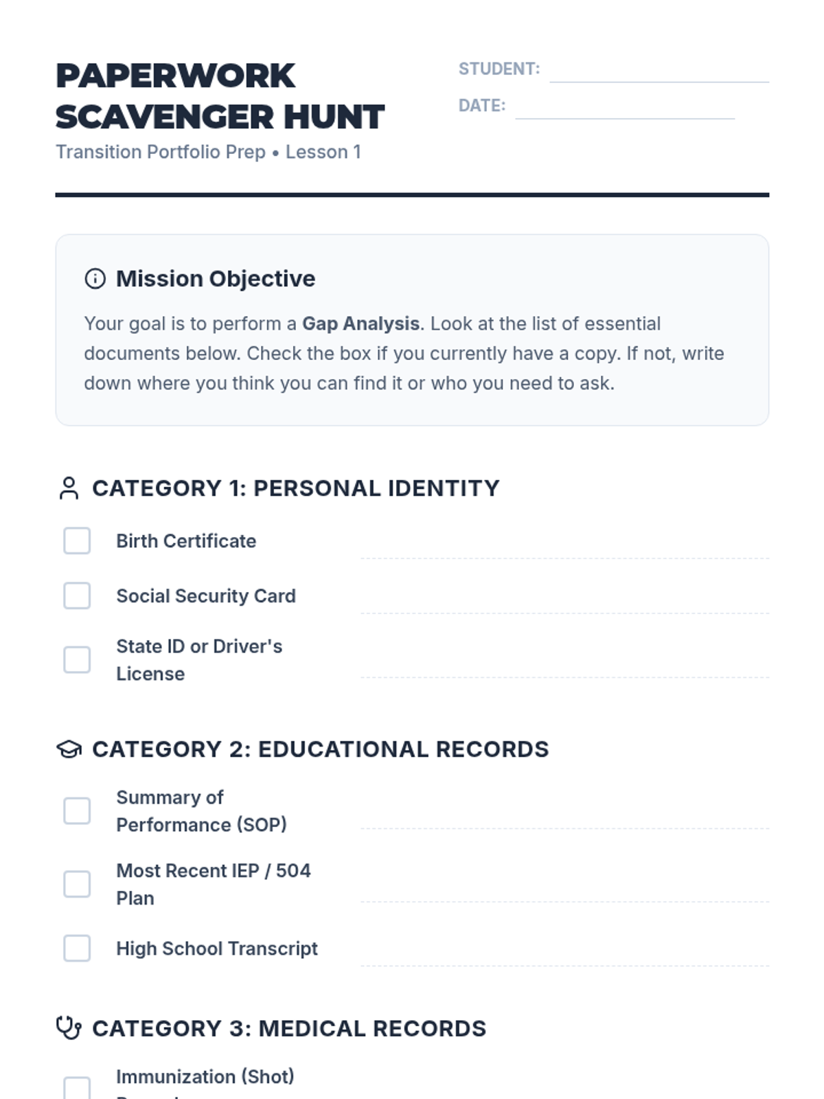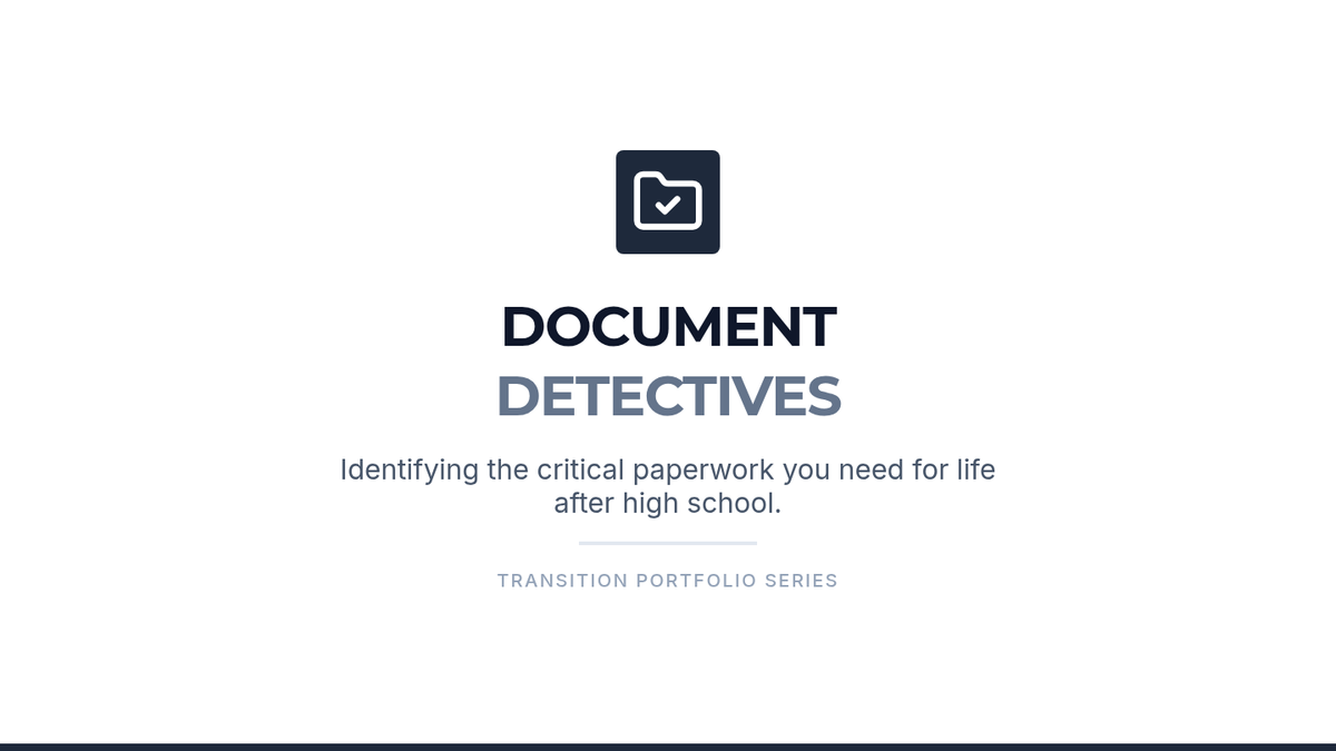 This sequence empowers 12th-grade students to take ownership of their personal, educational, and legal documentation as they transition to adulthood. Students will identify, secure, organize, and utilize essential records to foster independence and self-advocacy.