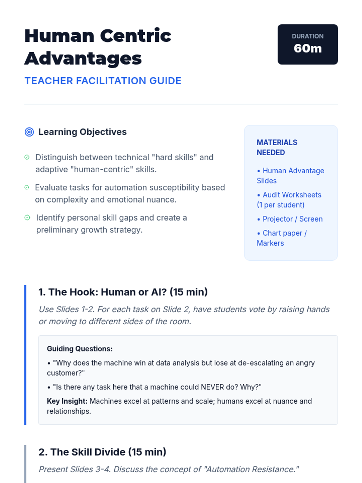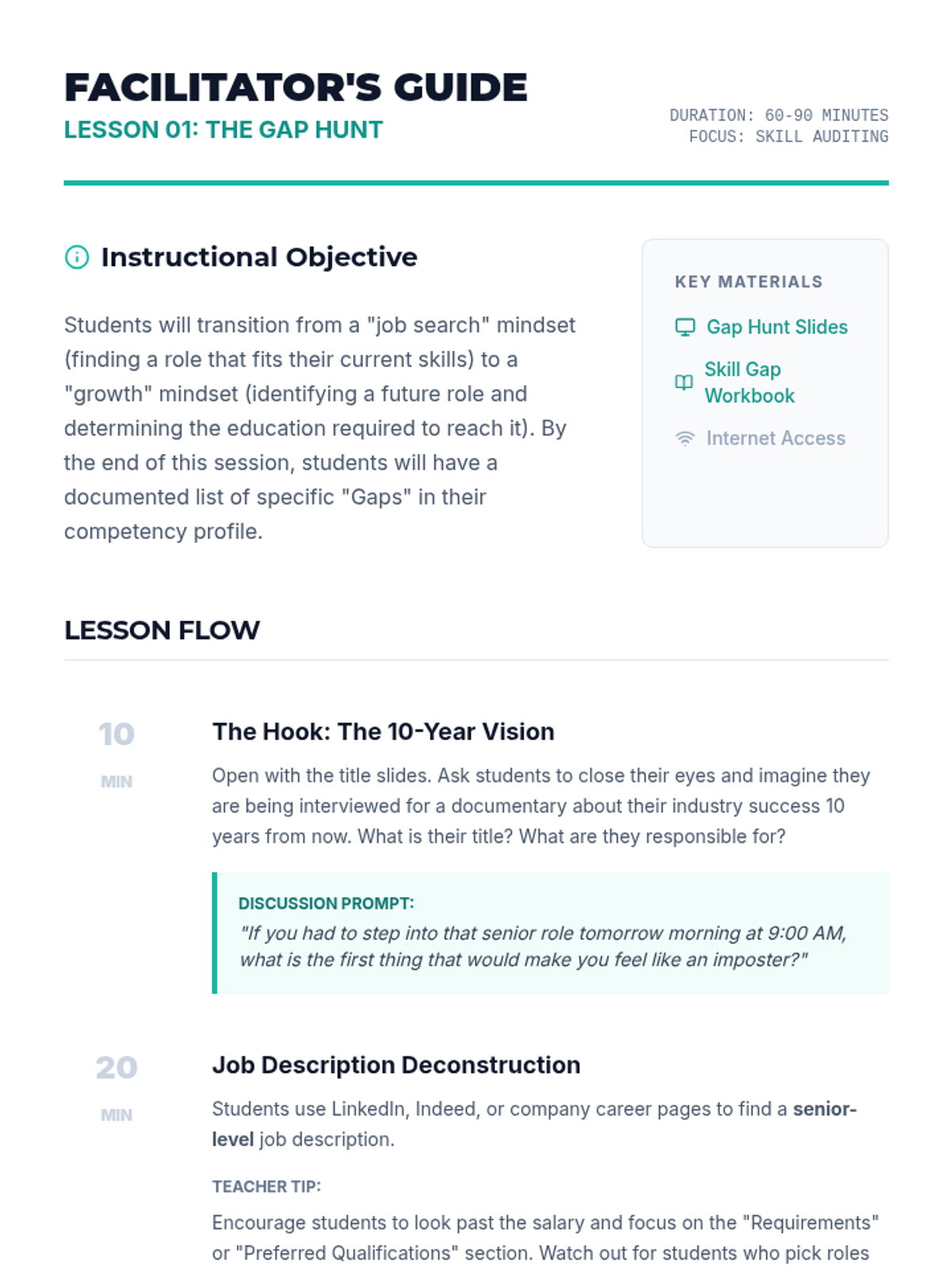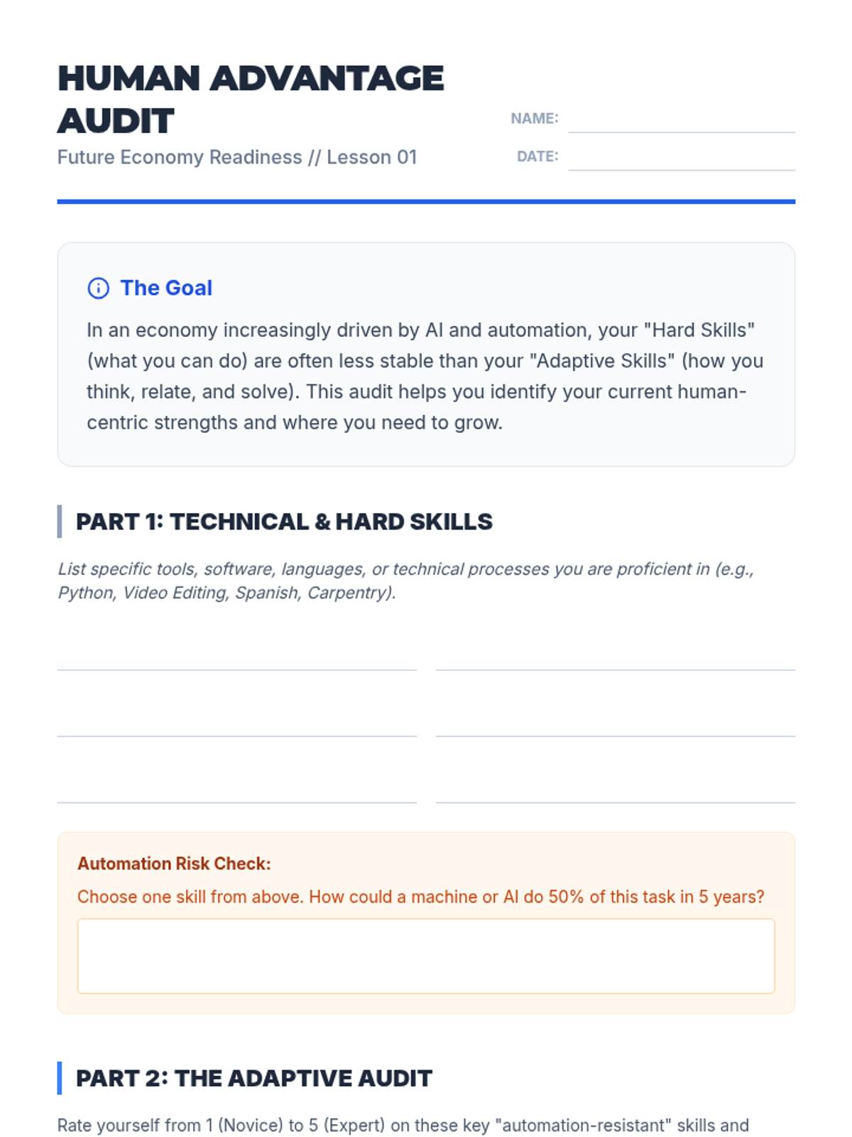 A comprehensive workshop-style sequence for 10th graders focusing on adaptability, soft skills, and career readiness in a rapidly evolving, automated, and decentralized economy. Students learn to audit human-centric skills, collaborate remotely, navigate gig economy contracts, and plan for continuous upskilling.