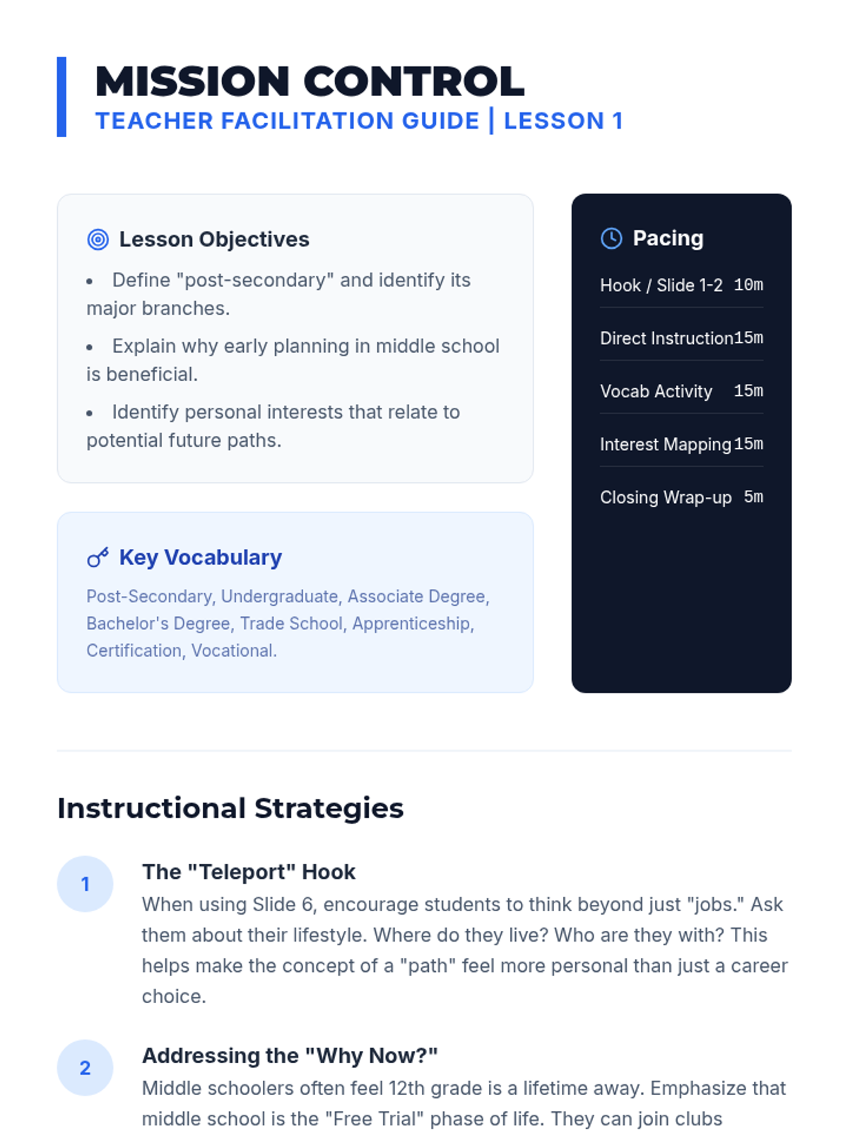 A comprehensive unit for middle school students to explore various post-secondary options including college, vocational training, military, and workforce entry, helping them connect current interests to future paths.