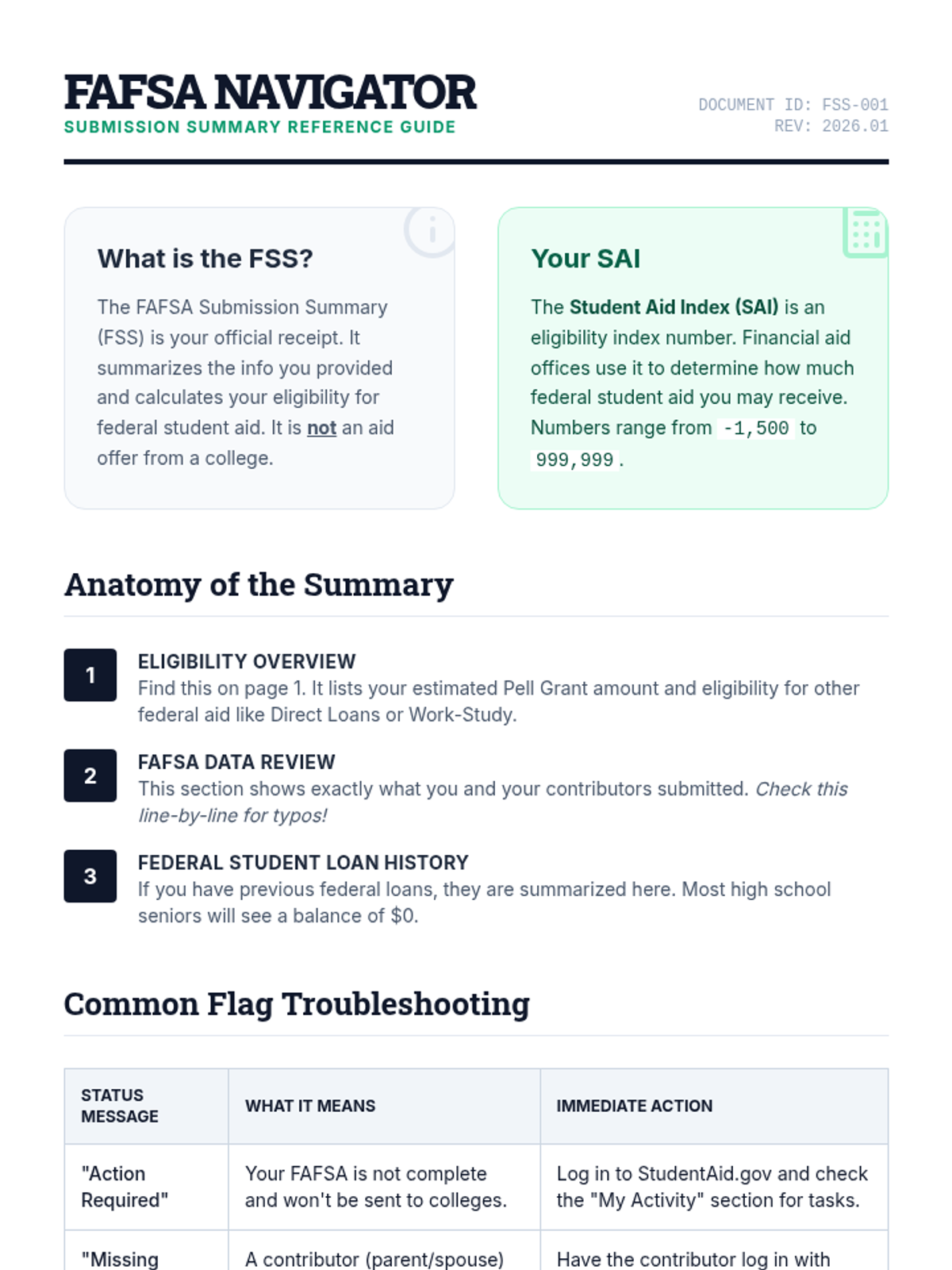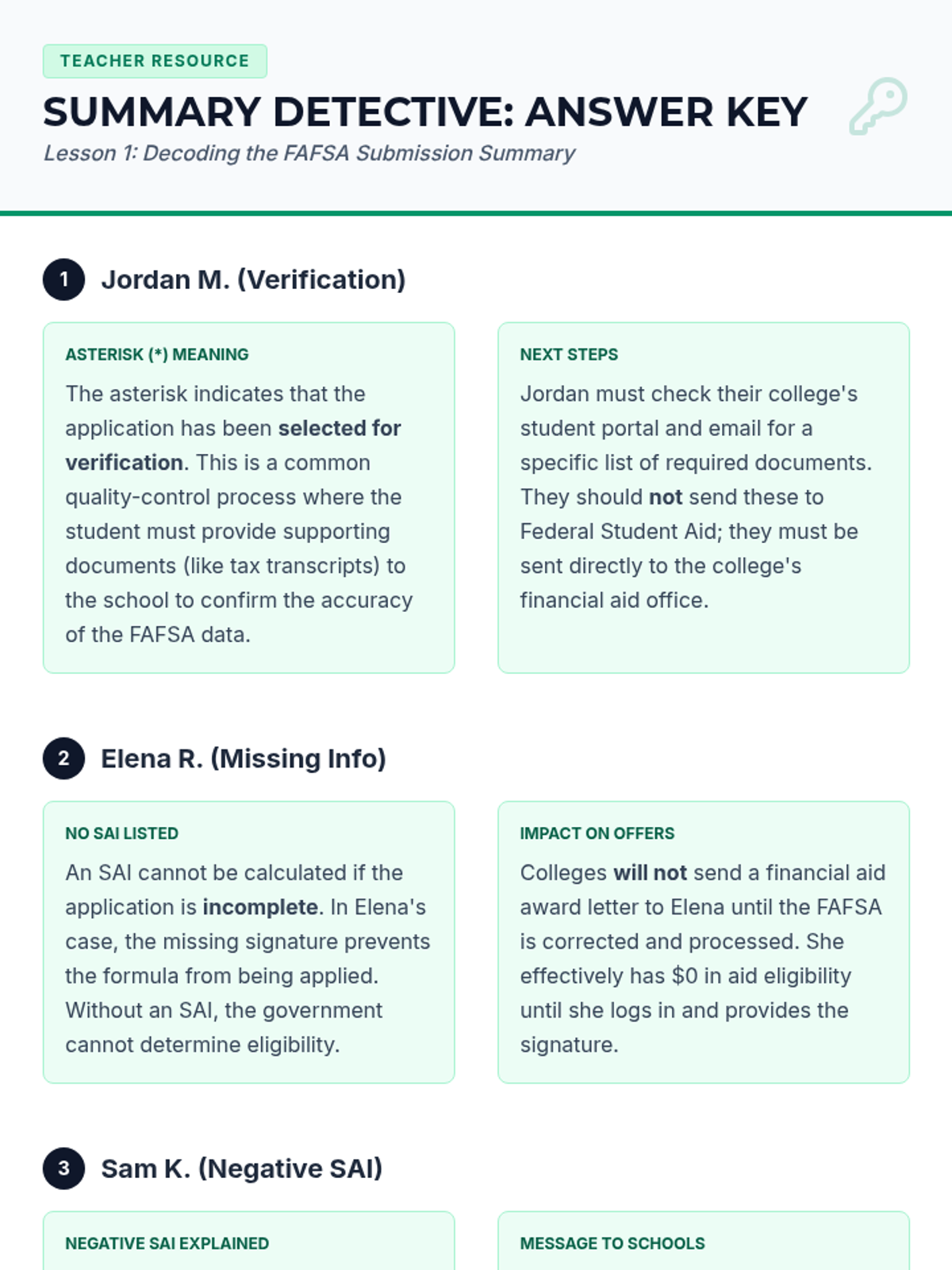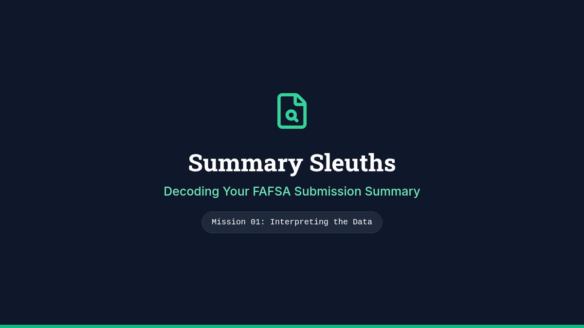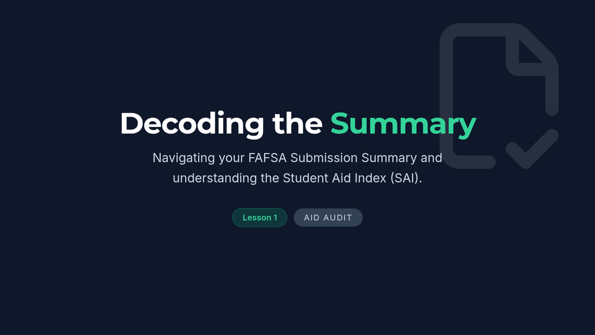 This mastery-based sequence guides 12th-grade students through the post-FAFSA submission phase, teaching them to interpret the FAFSA Submission Summary (FSS), understand the Student Aid Index (SAI), navigate verification, and compare financial aid award letters. Students develop critical financial literacy skills to determine the true net price of college and make informed enrollment decisions.