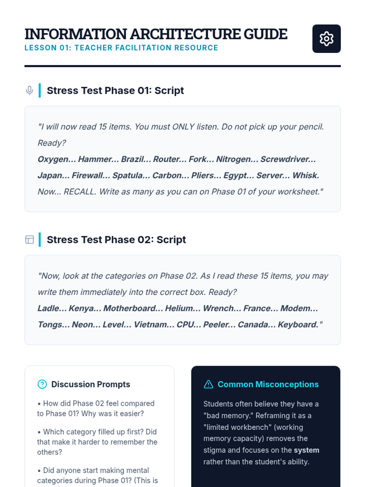 A 12th-grade sequence focused on transitioning from teacher-provided scaffolds to student-designed visual memory systems for college and career readiness. Students analyze cognitive load, design flowcharts and SOPs, and optimize their environments to support executive function.