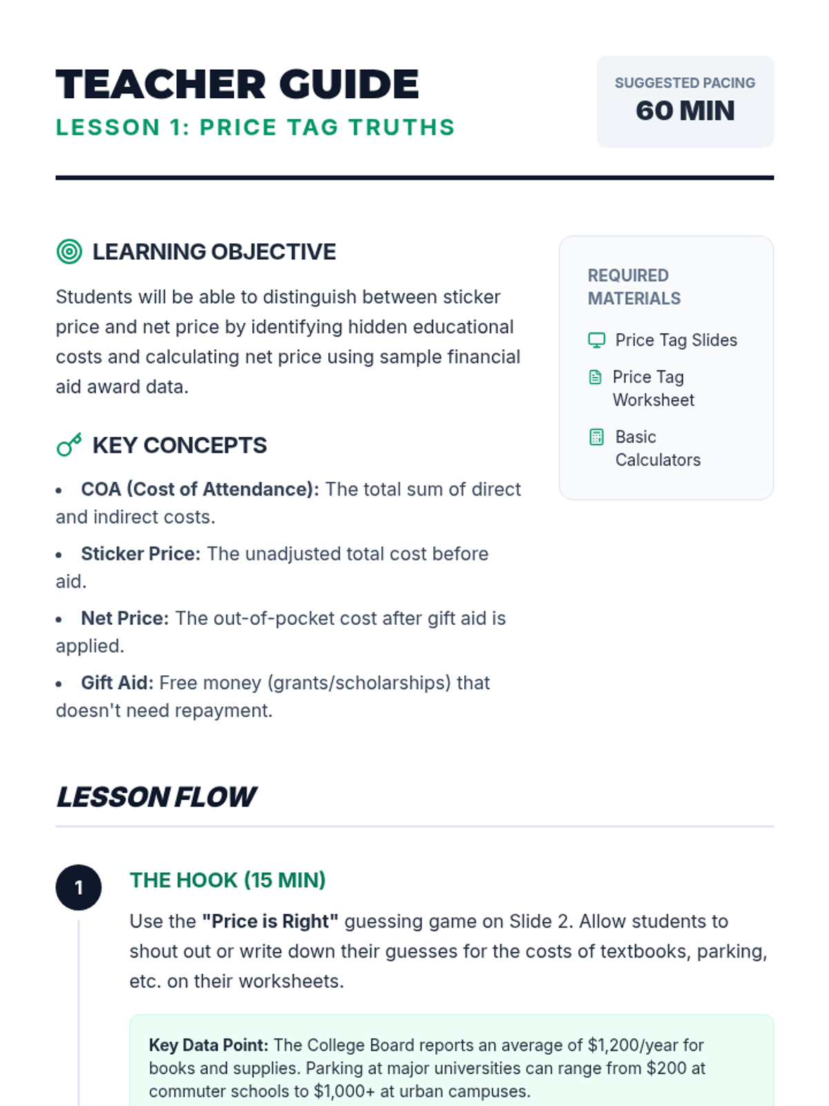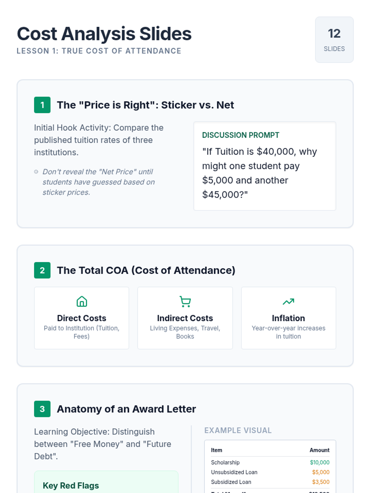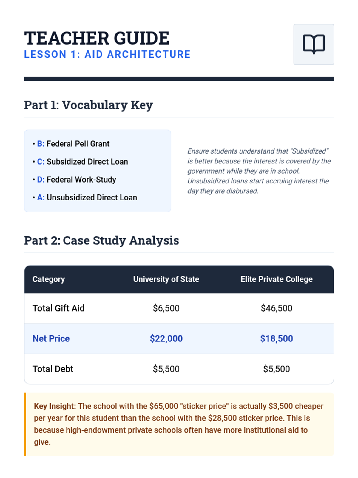 A comprehensive sequence for 11th-grade students to navigate the complexities of federal financial aid, FAFSA eligibility, and the actual cost of college. Students will move from understanding aid types to calculating net prices and debunking common myths.