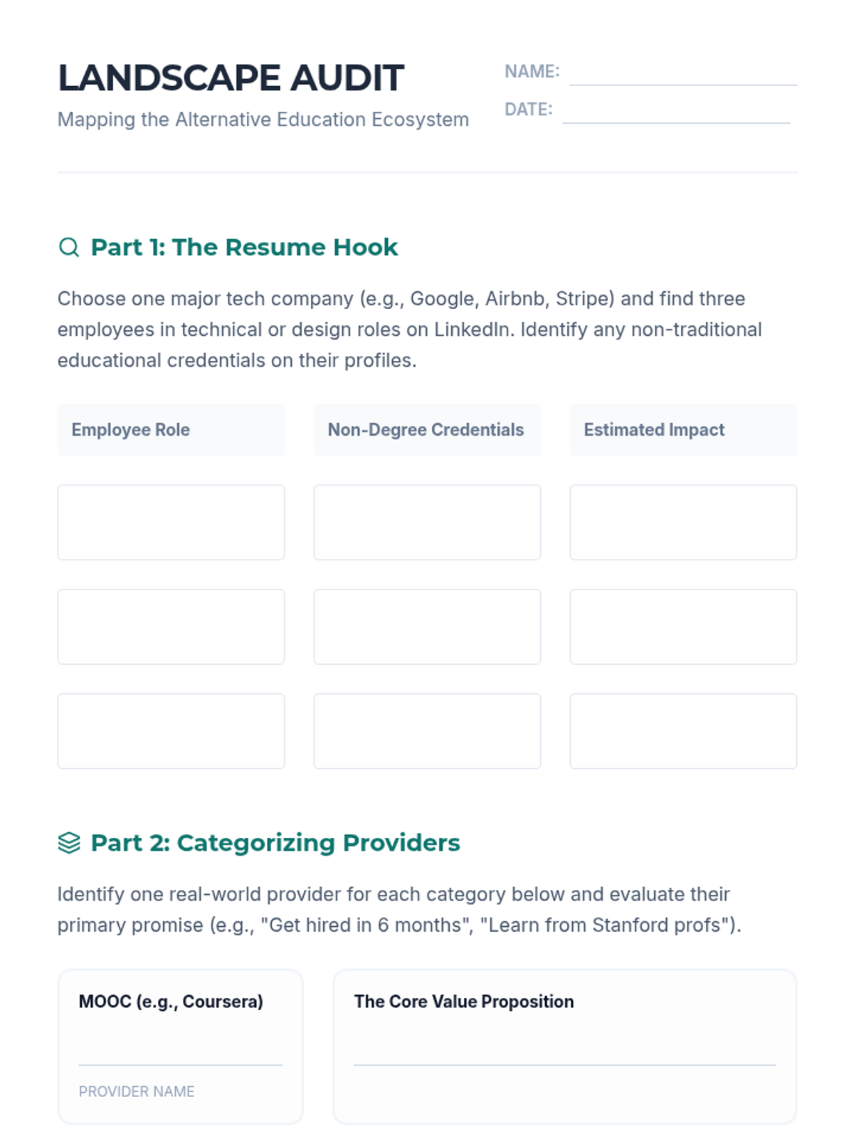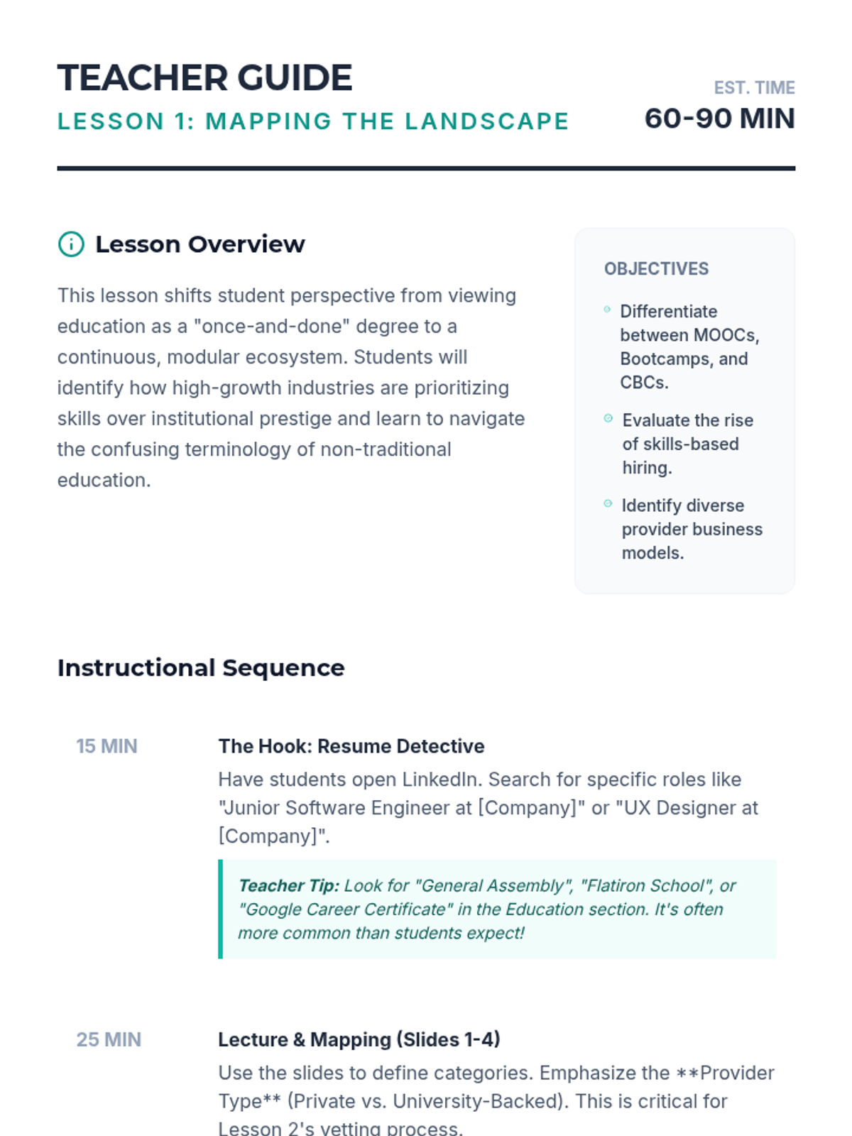 This sequence investigates the rapidly growing sector of non-traditional education, including coding bootcamps, MOOCs, and corporate training. Students learn to vet these pathways for quality, outcomes, and career alignment, moving from landscape survey to strategic decision-making.