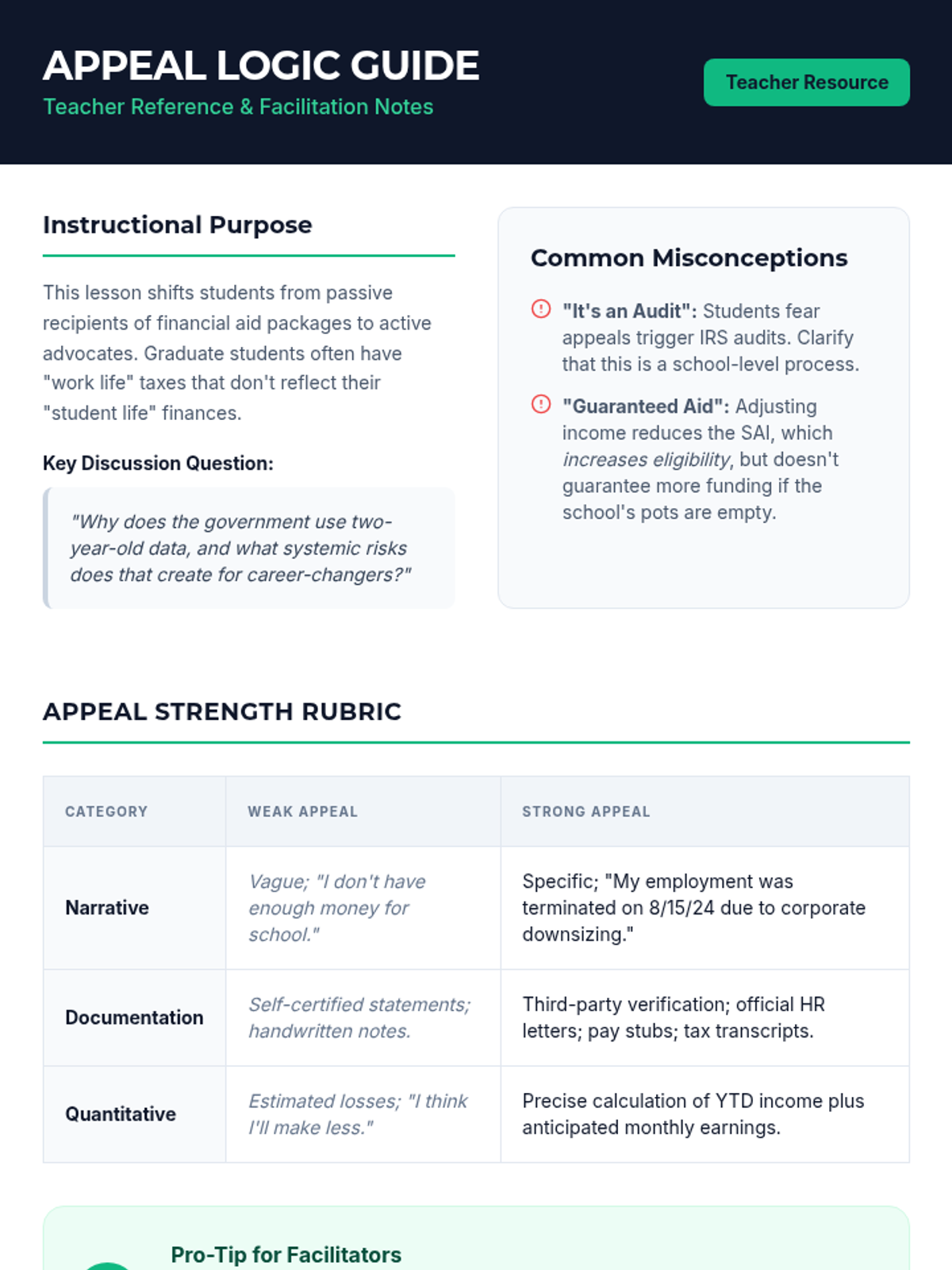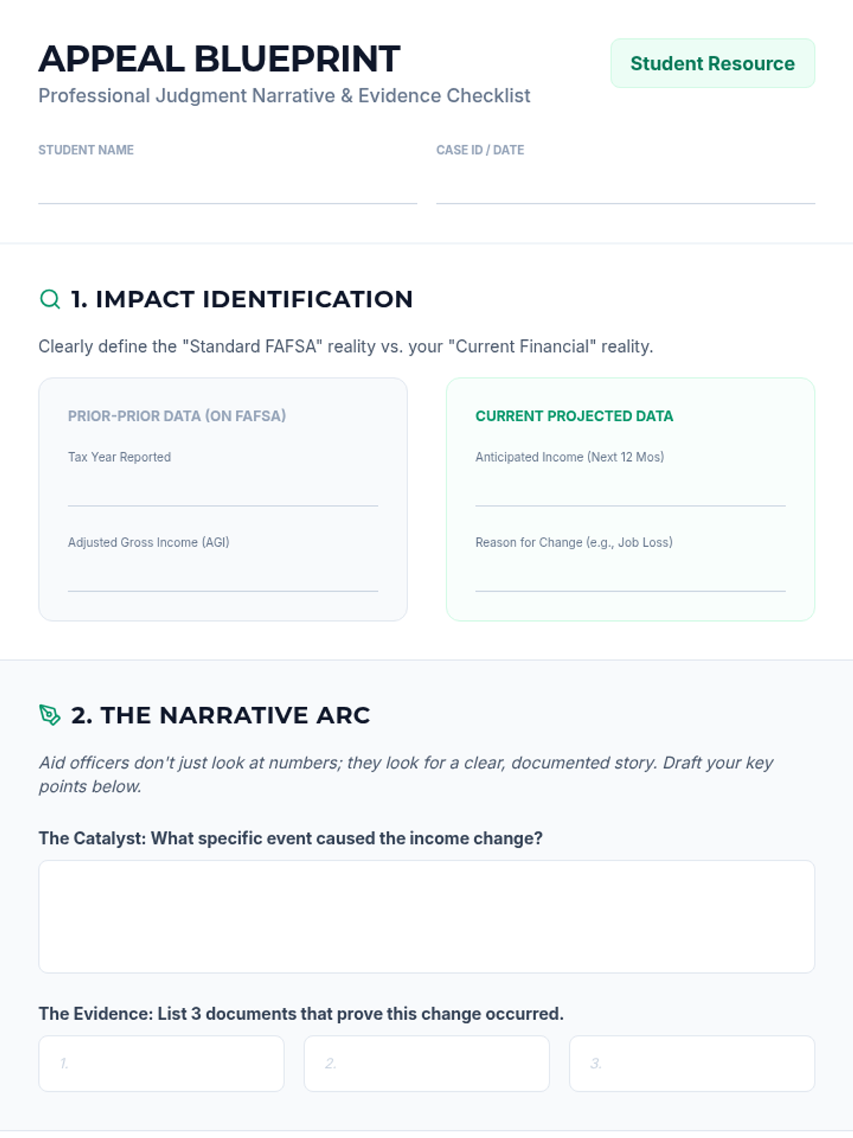 A comprehensive inquiry-based sequence for graduate students navigating complex FAFSA scenarios, including income changes, marital status impacts, and professional judgment appeals. Students learn to advocate for their financial reality when standard forms fall short.