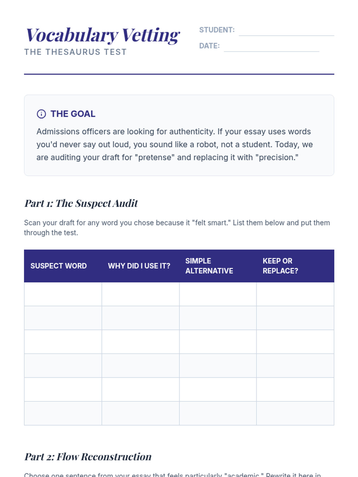 A comprehensive sequence for 11th-grade students focused on refining the personal statement. This unit emphasizes authenticity, auditory revision, emotional tone auditing, and technical finalization to ensure a student's written voice remains genuine and impactful.