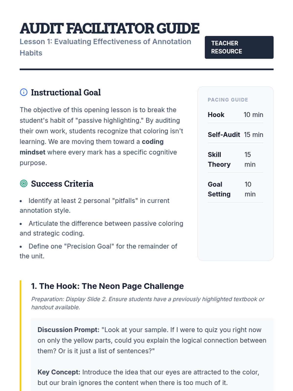This sequence transforms highlighting from a passive activity into a rigorous, systematic method for information processing. Students evaluate current habits, establish hierarchical color systems, develop marginal shorthand, and apply these strategies to complex texts to create effective study tools.