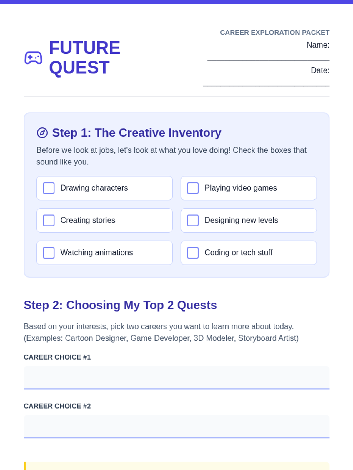 A career exploration sequence designed for students interested in creative technology, focusing on researching paths in cartoon and video game design with structured steps.