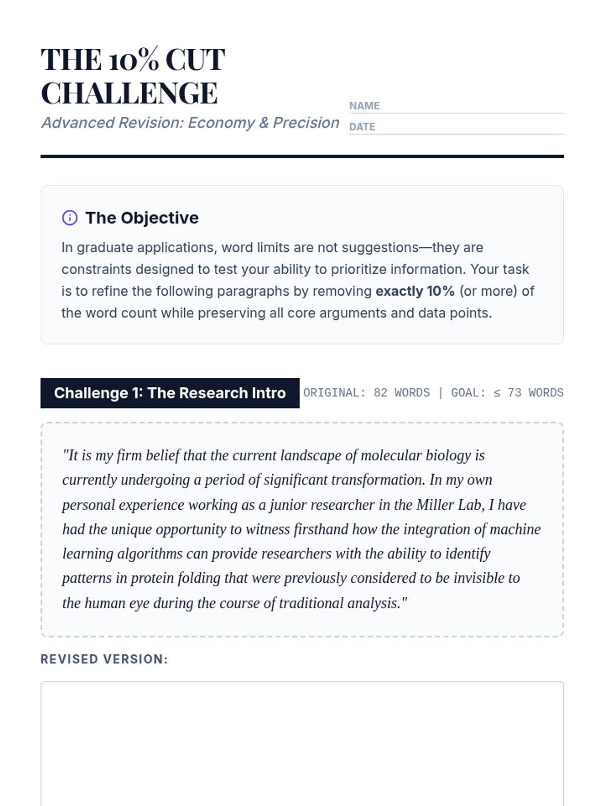 A high-level writing sequence for graduate students focusing on the final stages of personal statement revision. Students learn advanced techniques for conciseness, logical flow, authoritative tone, feedback management, and final submission quality assurance.