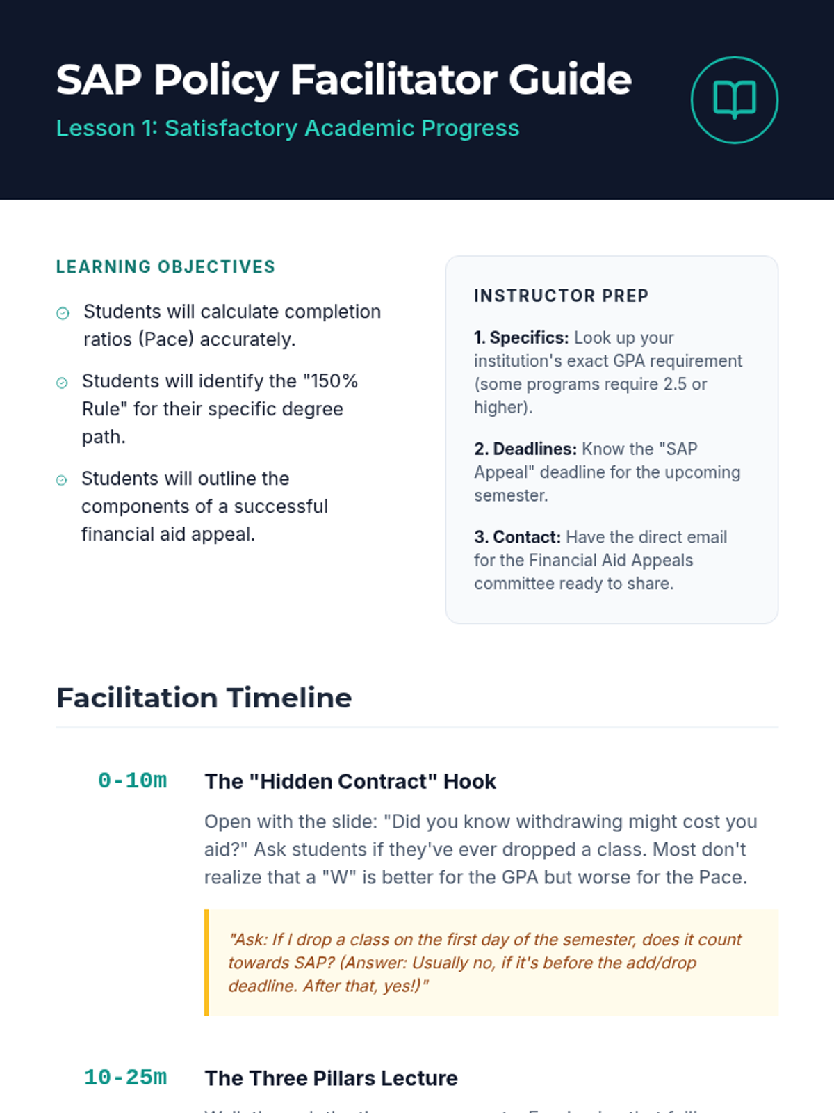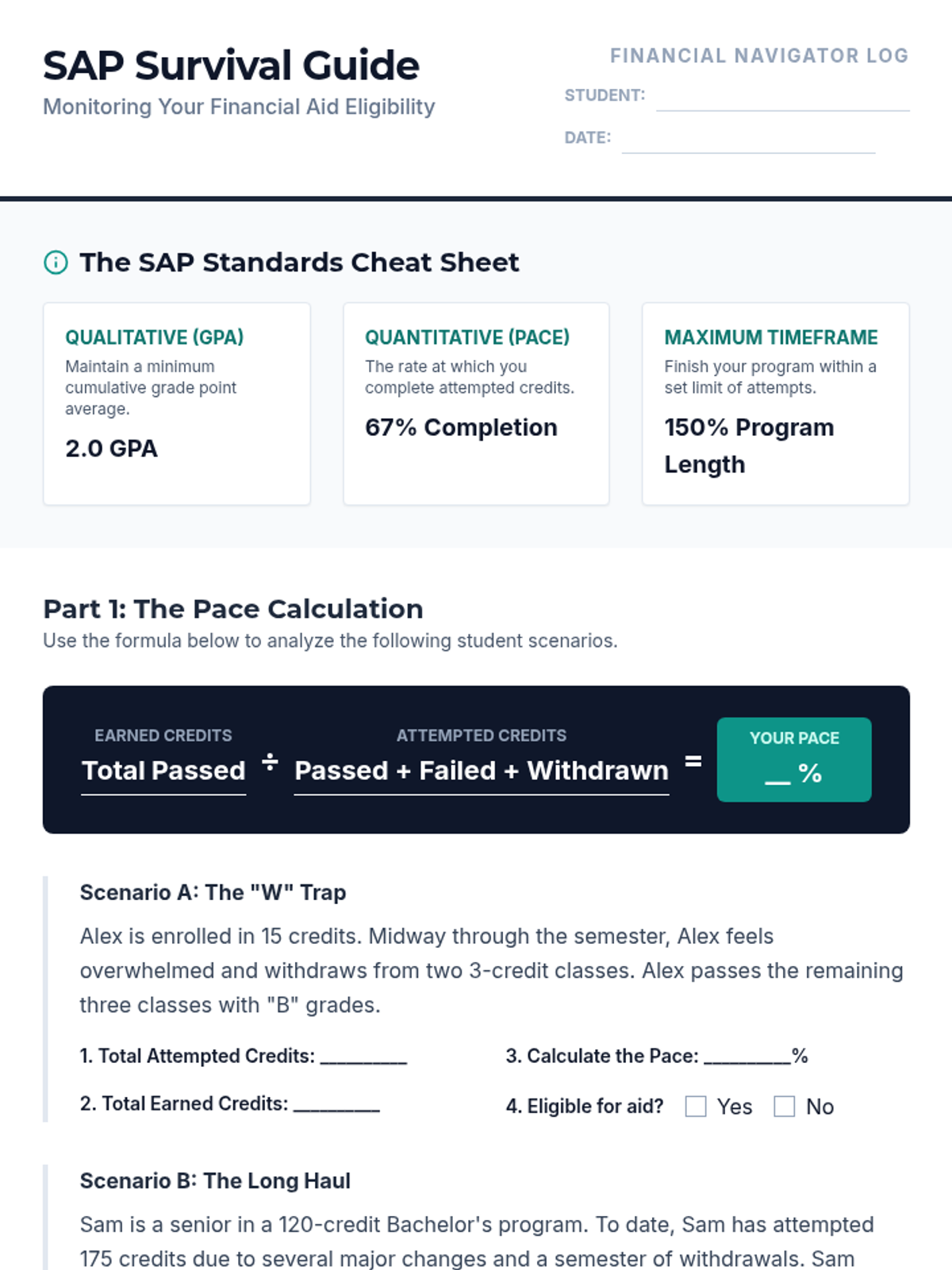 A comprehensive sequence for undergraduate students focusing on the long-term maintenance of federal financial aid eligibility. Students master Satisfactory Academic Progress (SAP), lifetime limits, loan aggregates, withdrawal consequences, and the annual renewal cycle.