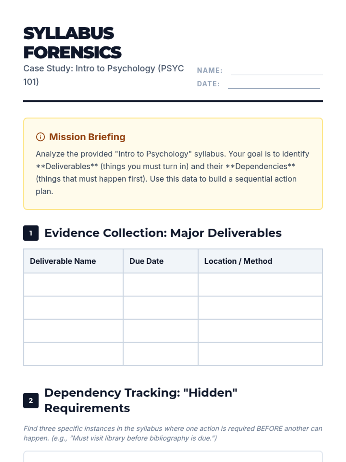 This sequence targets the ability of 12th-grade students with working memory challenges to decode and follow complex academic guidelines. It progresses from document analysis to auditory processing and technical protocols, culminating in a strategic planning challenge for post-secondary readiness.