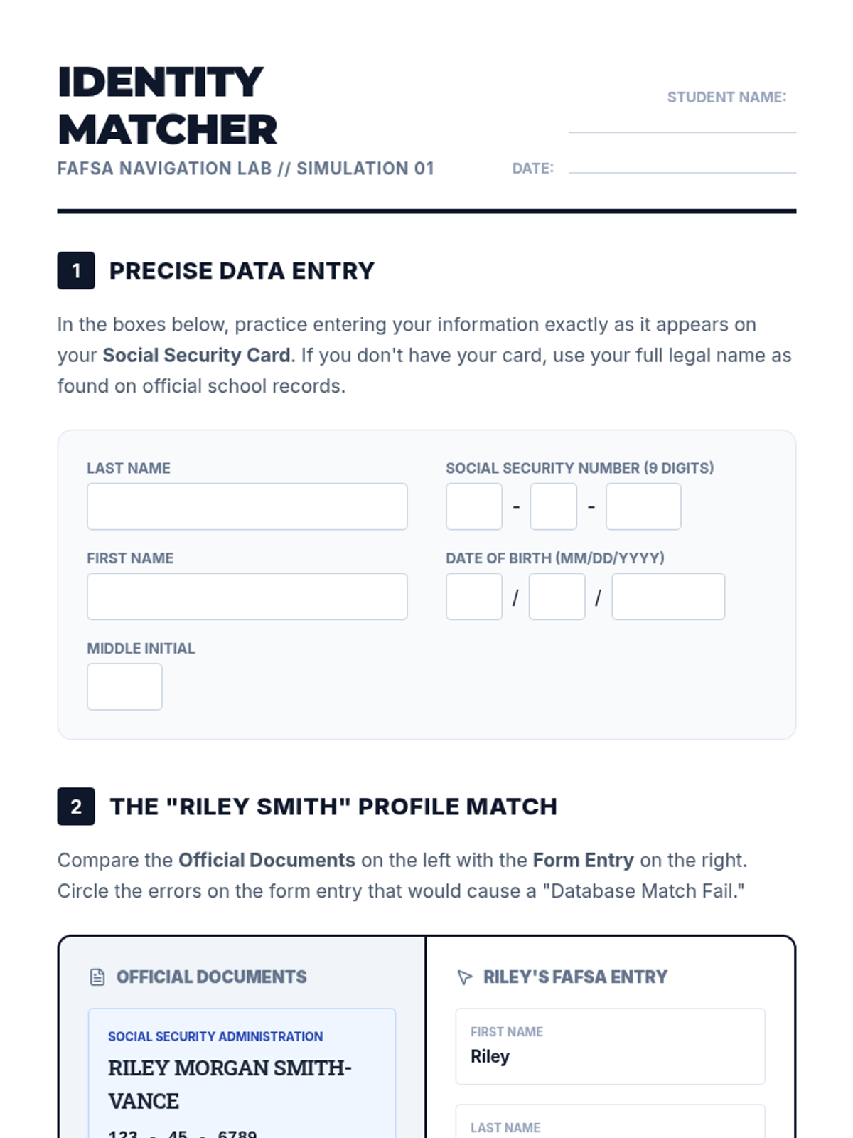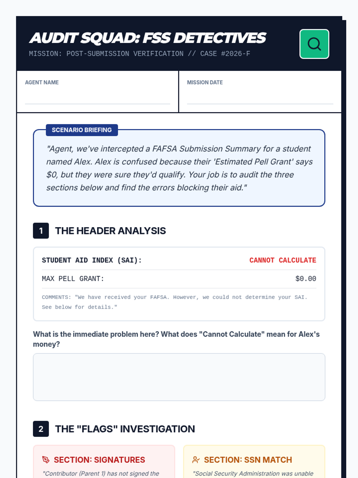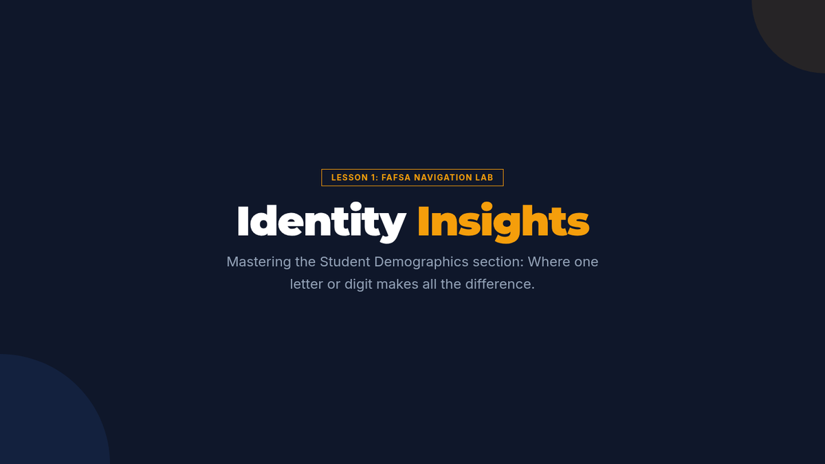 A simulation-based unit where 11th-grade students practice navigating the FAFSA form sections, focusing on data accuracy, school selection strategy, and financial document analysis to prepare for their senior year applications.