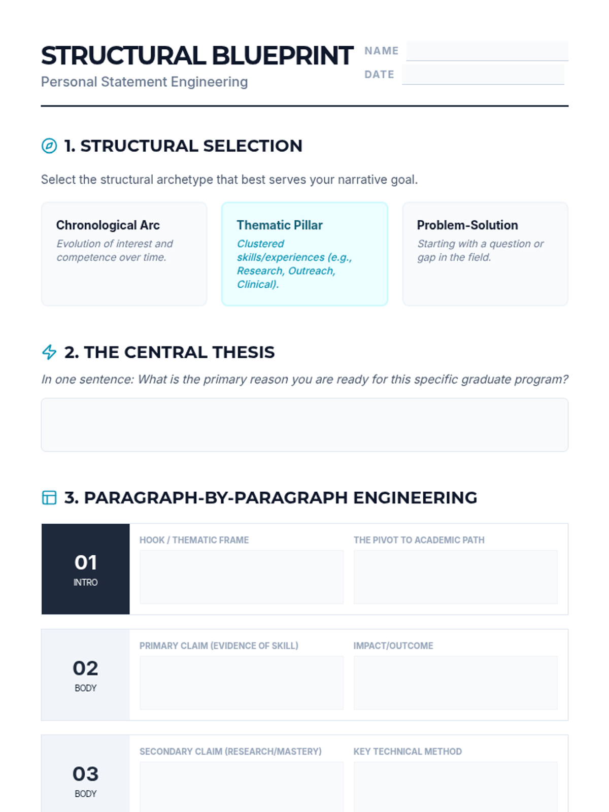 This sequence guides graduate-level applicants through the structural engineering of a personal statement. Students transition from abstract ideas to a concrete narrative architecture, focusing on research competence, future impact, and rapid prototyping of a complete draft.