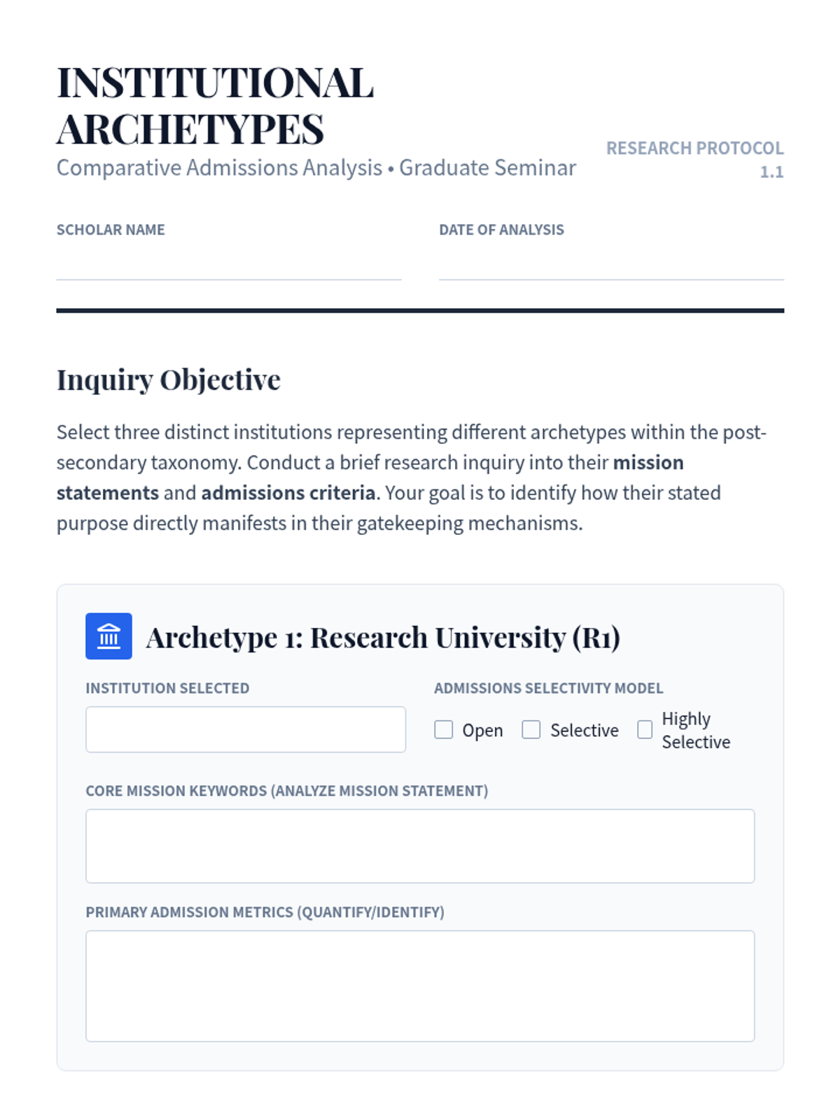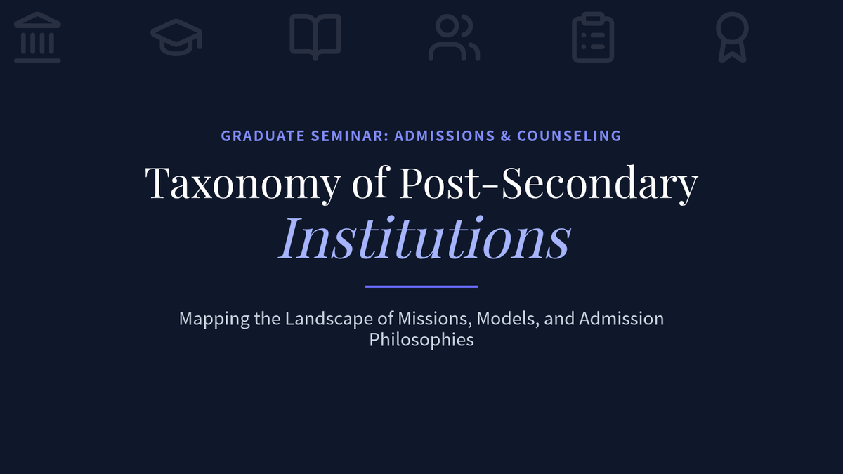 A comprehensive graduate-level sequence exploring the diverse landscape of post-secondary admission requirements across R1 universities, liberal arts colleges, vocational institutes, professional schools, and international systems. Students develop a comparative framework to understand how institutional missions shape admission protocols and cultural values.
