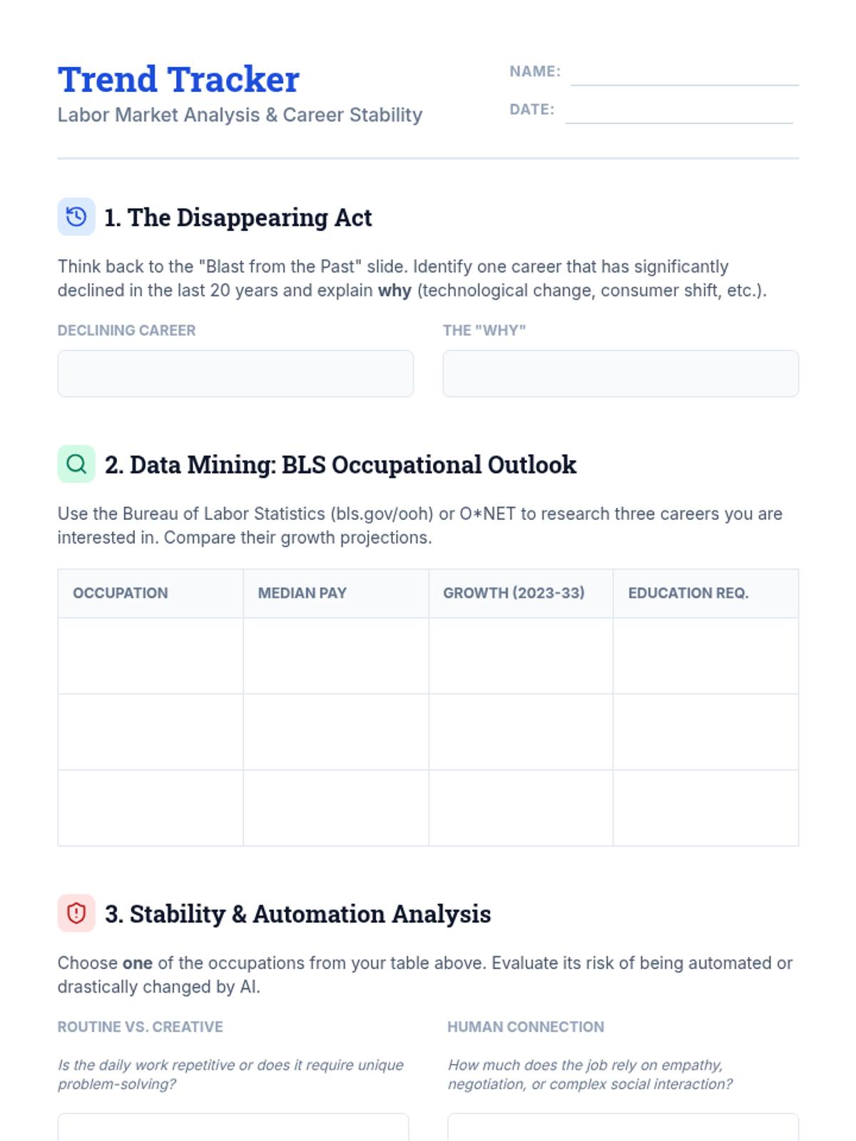 A comprehensive sequence designed to equip 11th-grade students with the mindset and tools for lifelong career adaptability. Through trend analysis, resource exploration, and simulation games, students learn to navigate the shifting landscape of work, automation, and continuous education.