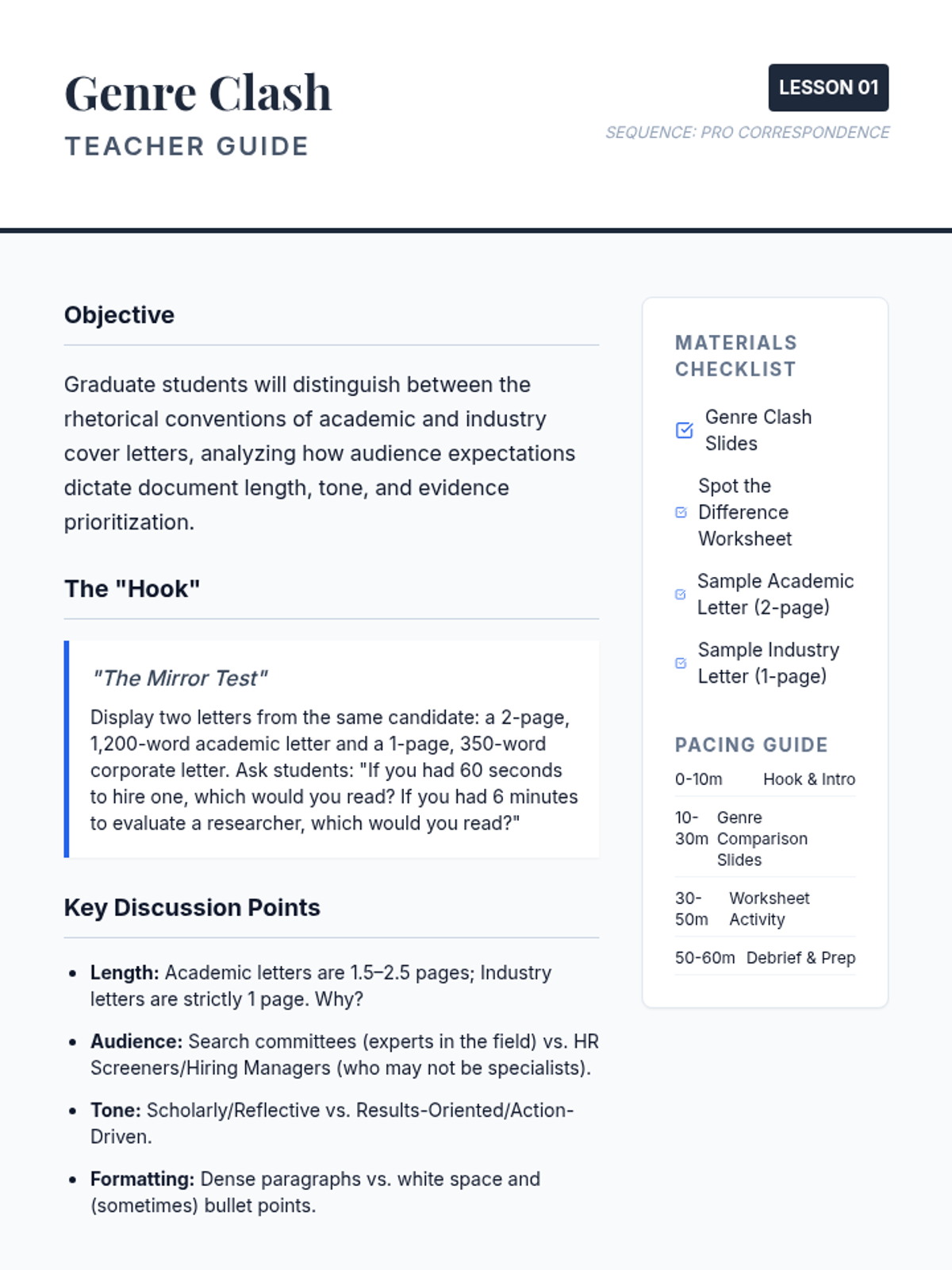 A comprehensive sequence for graduate students to master the distinct conventions of academic and industry cover letters, focusing on genre analysis, narrative construction, and sector-specific adaptation.