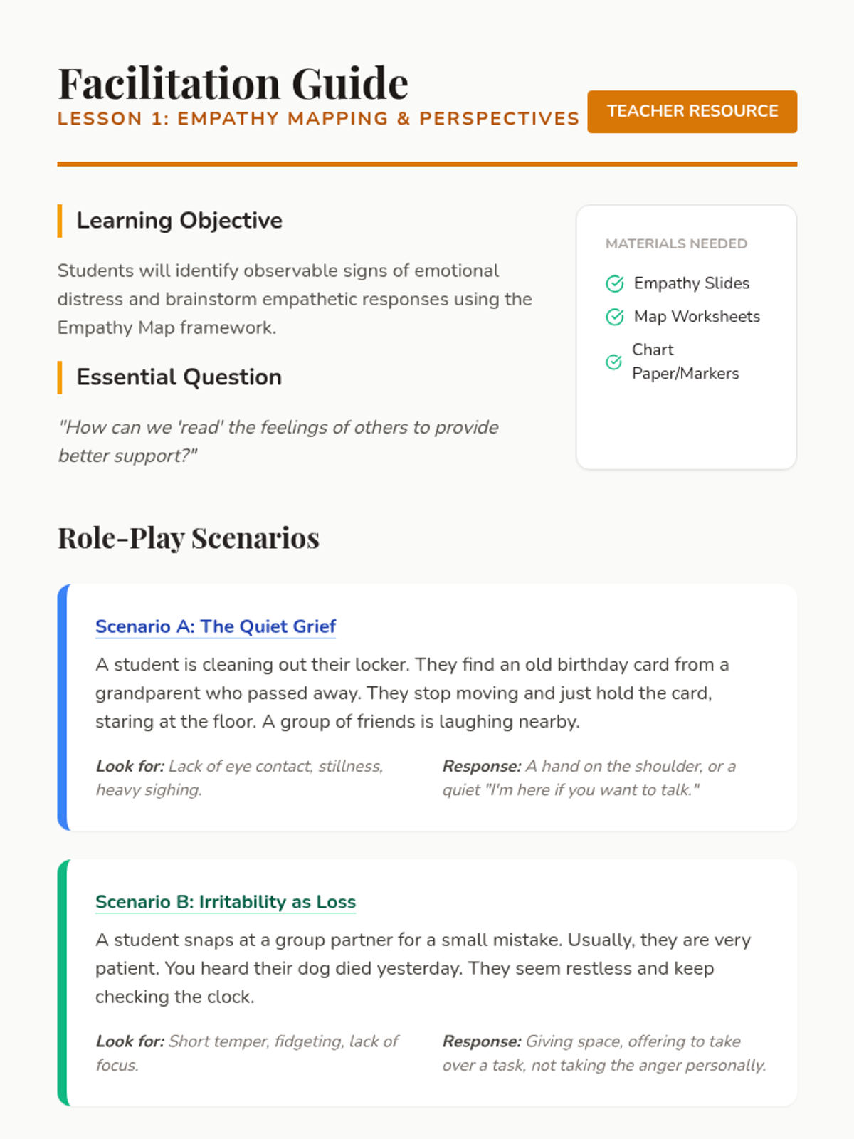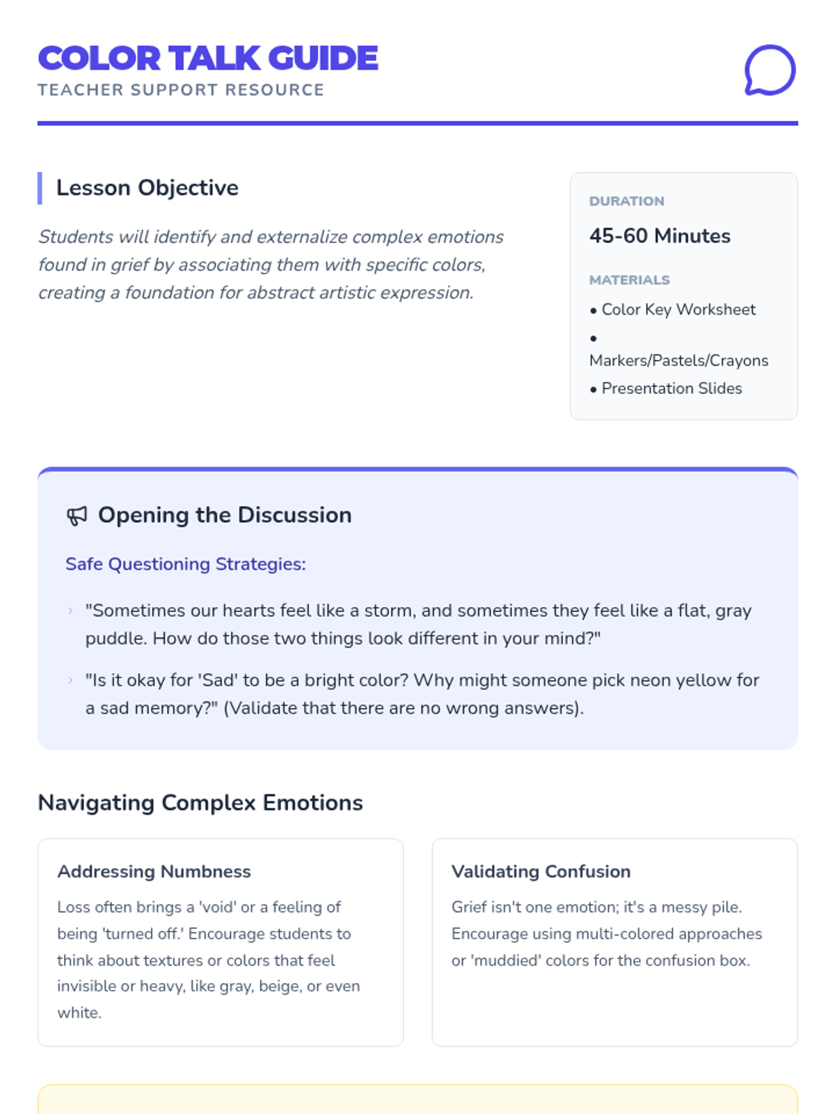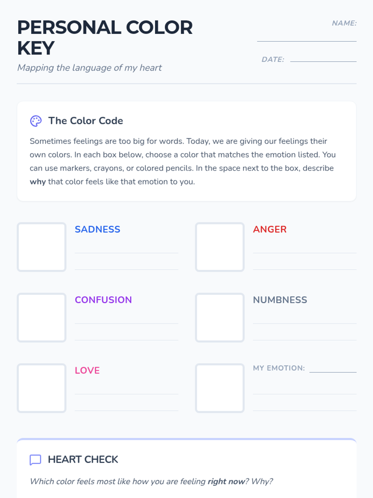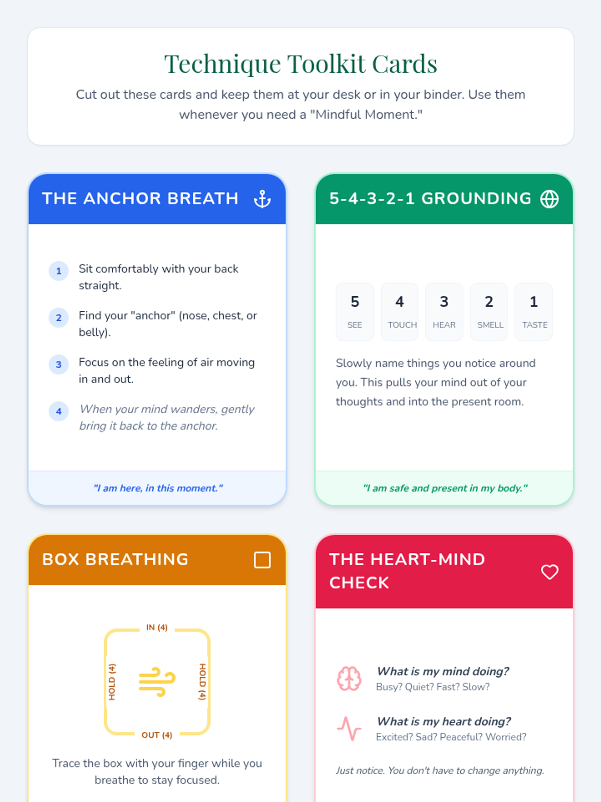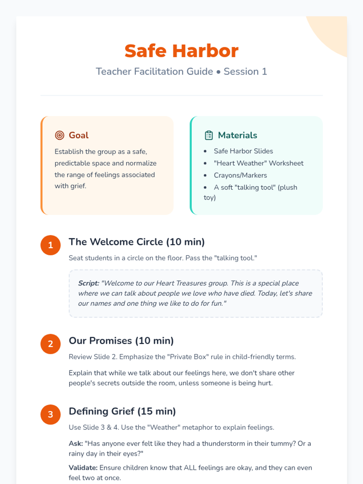 Identification of anxiety and depression symptoms alongside practical management strategies like progressive muscle relaxation and behavioral activation. Addresses the stages of grief through creative expression and routine-building to support emotional resilience.