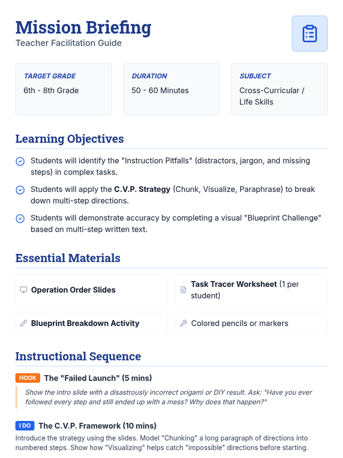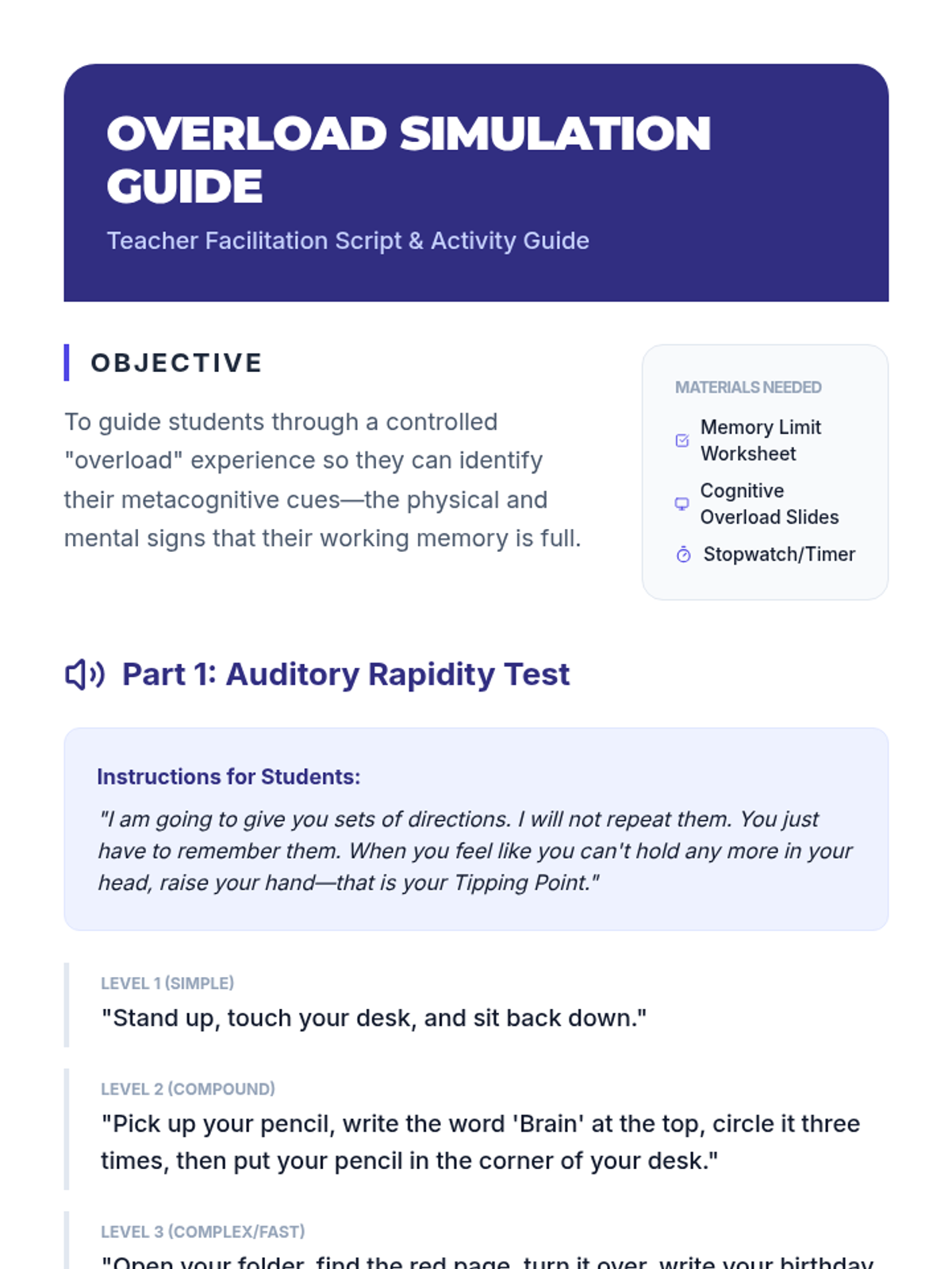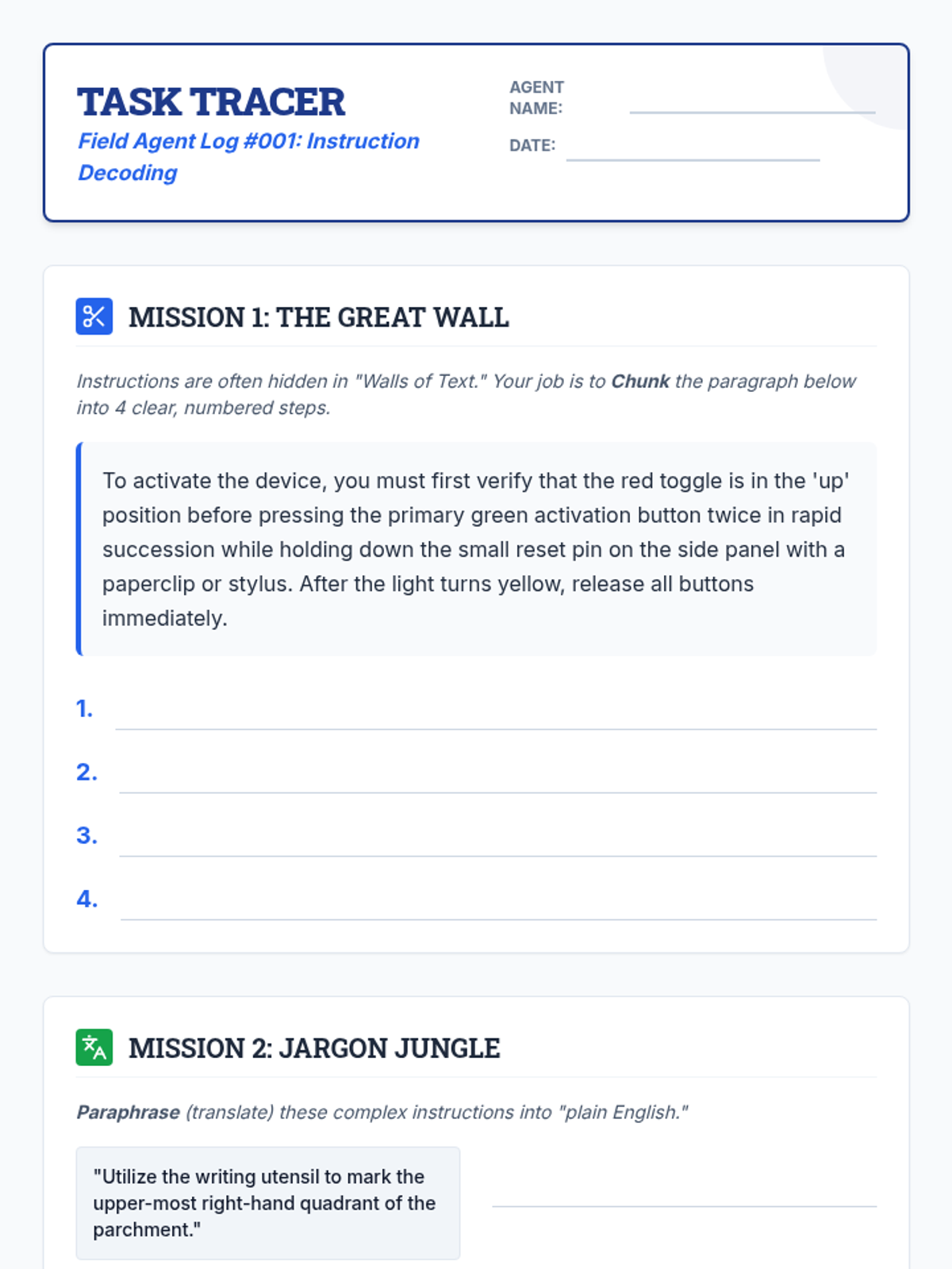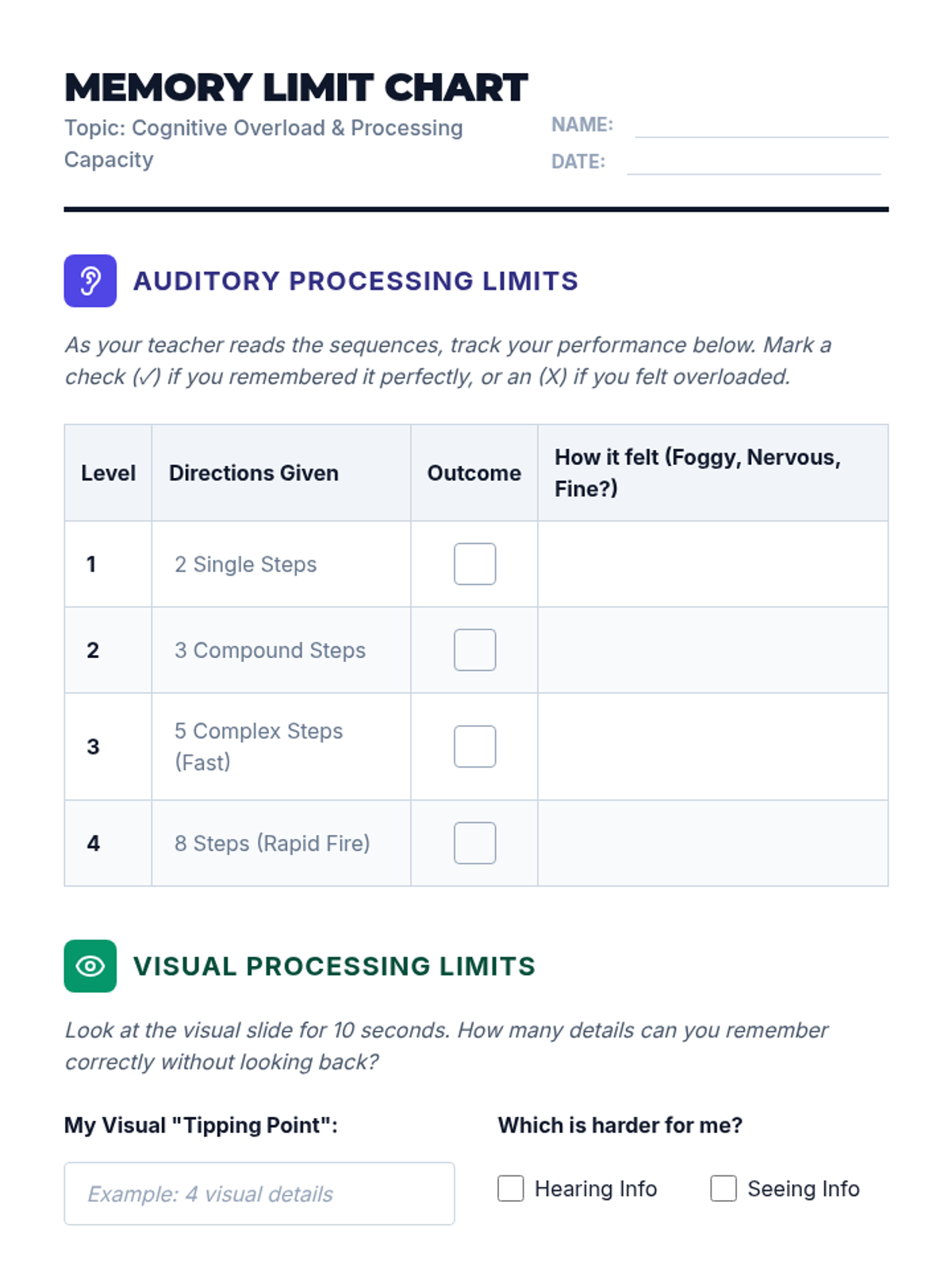 A 12th-grade sequence focused on empowering students with working memory challenges to advocate for single-step directions in professional and academic settings. Students learn to recognize their processing limits, draft professional scripts, and practice high-stakes role-play to ensure they can manage information overload effectively.