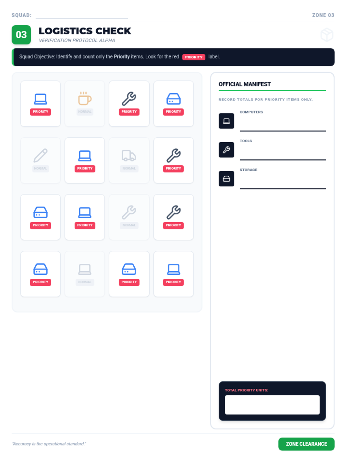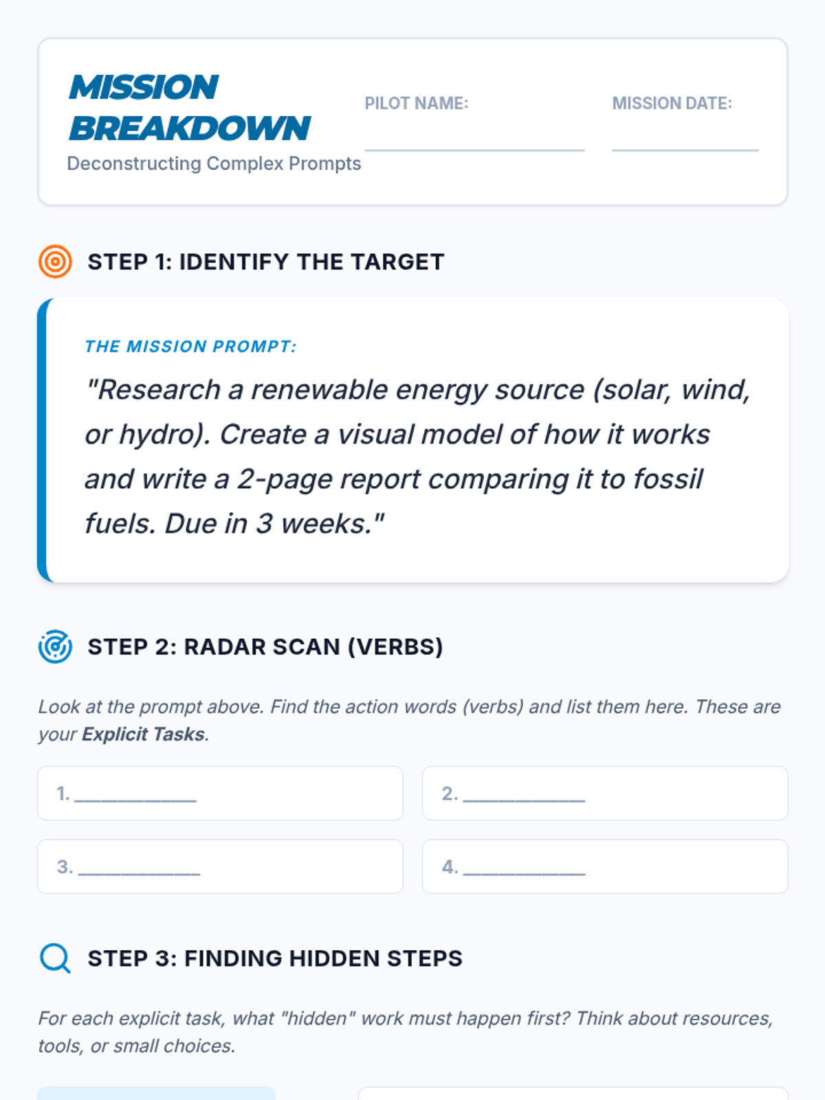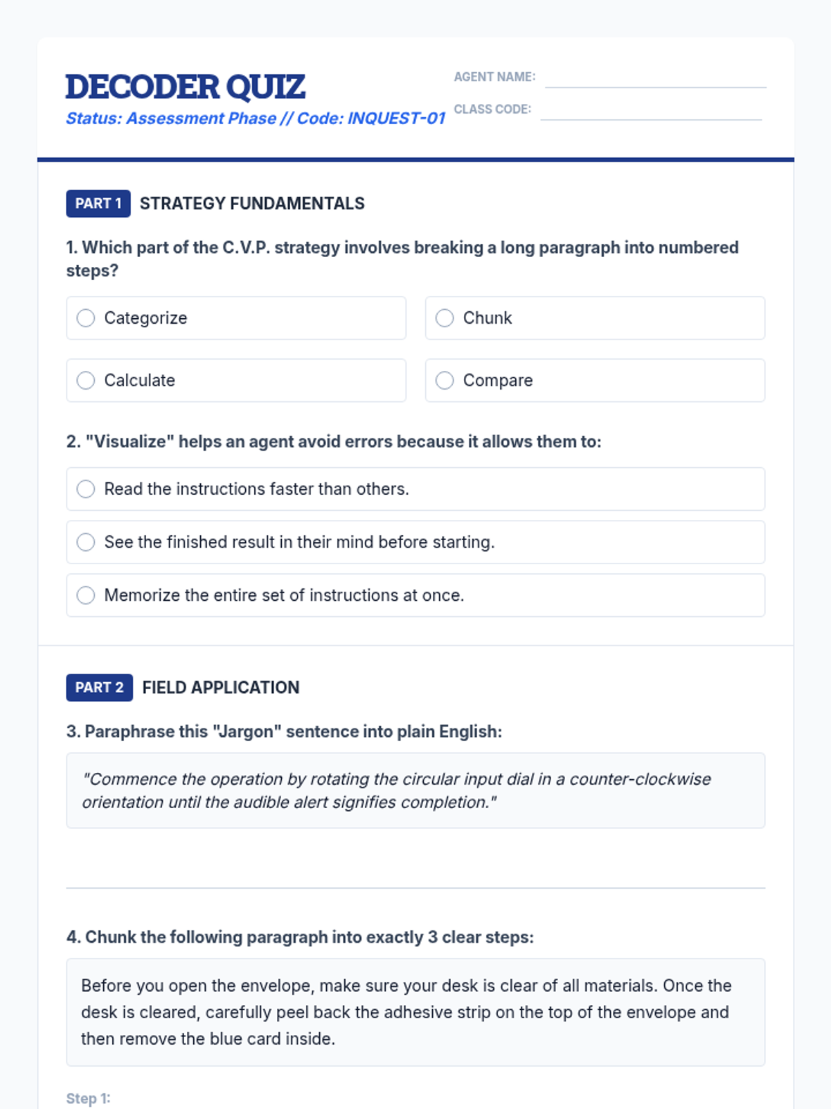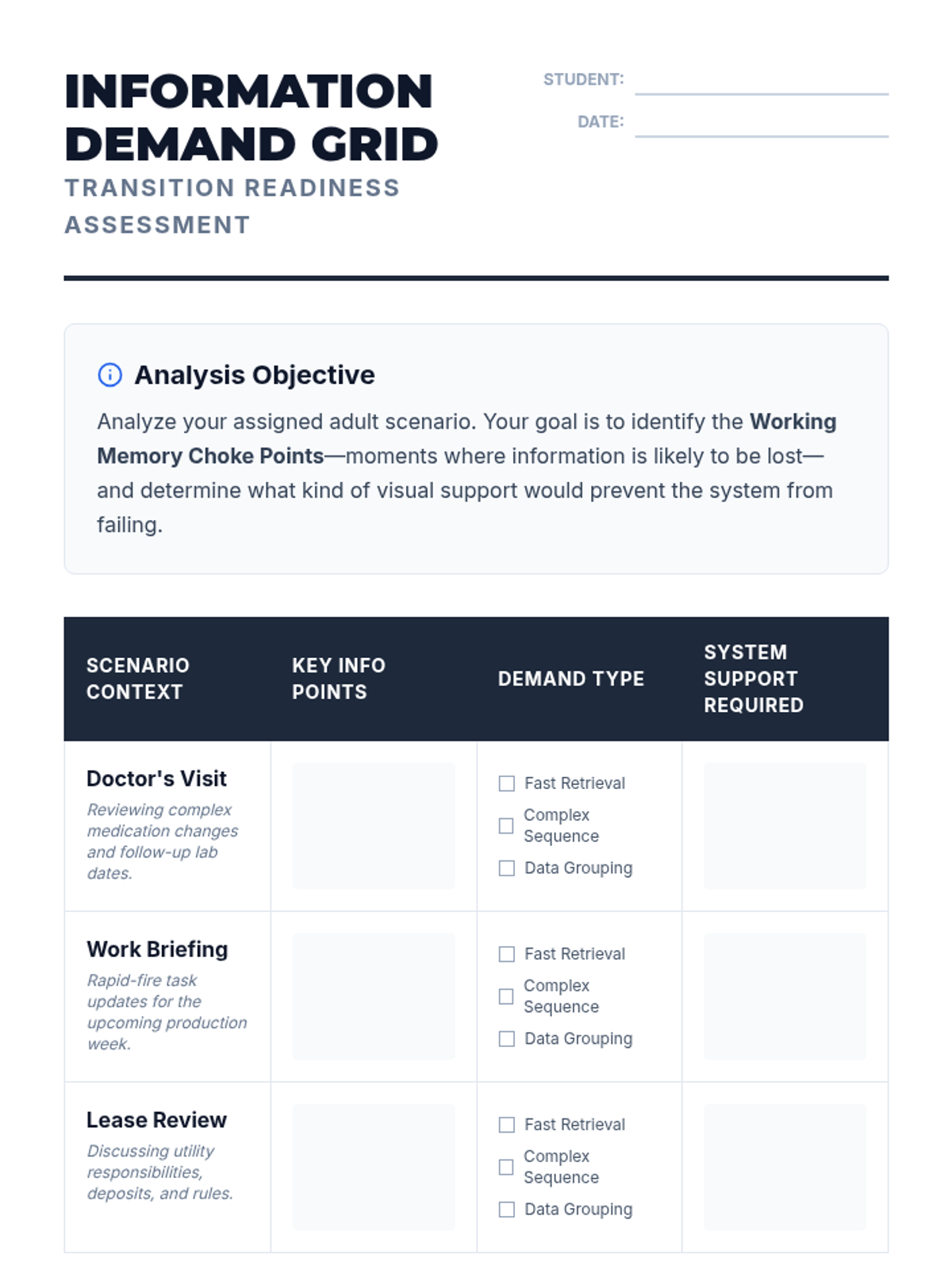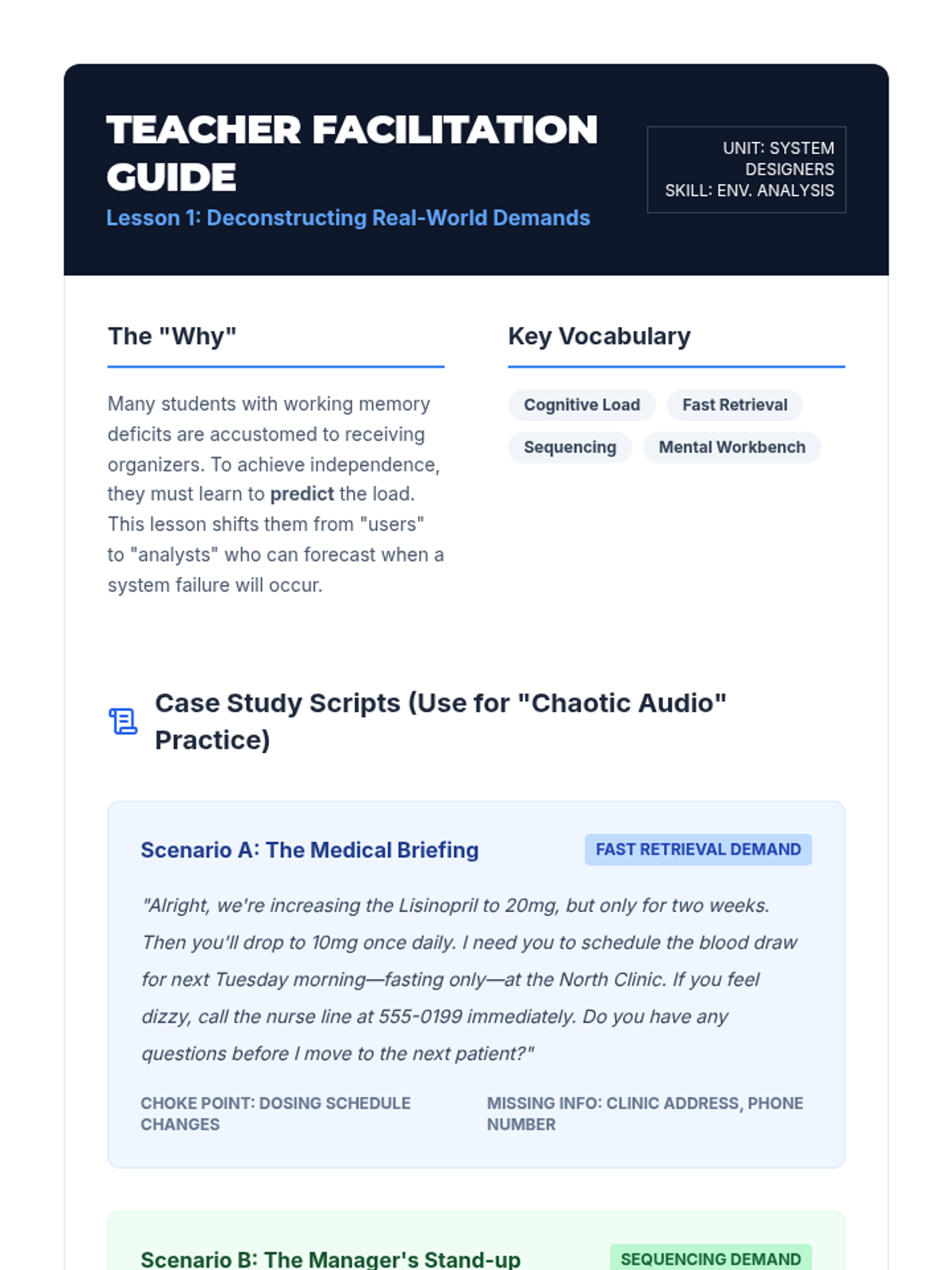 A 12th-grade sequence focused on empowering students with working memory challenges to advocate for single-step directions in professional and academic settings. Students learn to recognize their processing limits, draft professional scripts, and practice high-stakes role-play to ensure they can manage information overload effectively.