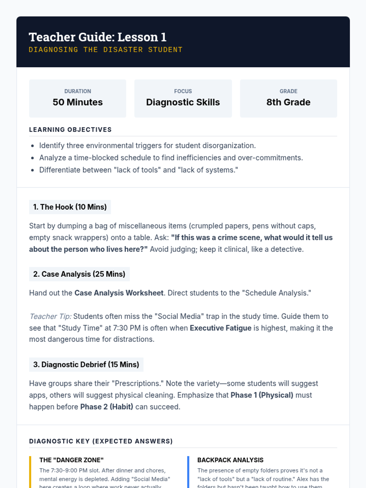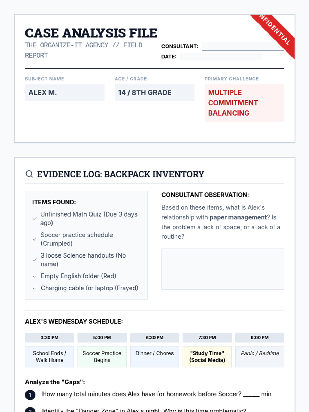 A comprehensive sequence where 8th-grade students act as 'organizational consultants' to diagnose and solve scheduling conflicts and executive functioning challenges through case studies. Students learn root cause analysis, professional self-advocacy, emotional regulation strategies for procrastination, and tool evaluation before creating a final consultancy report.