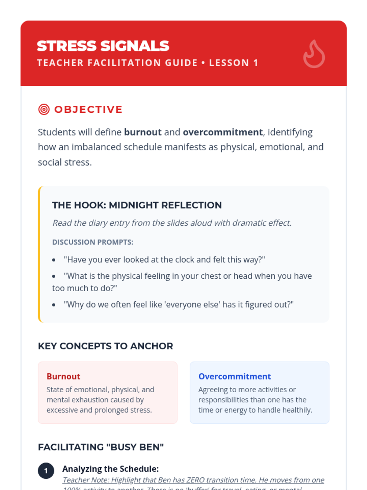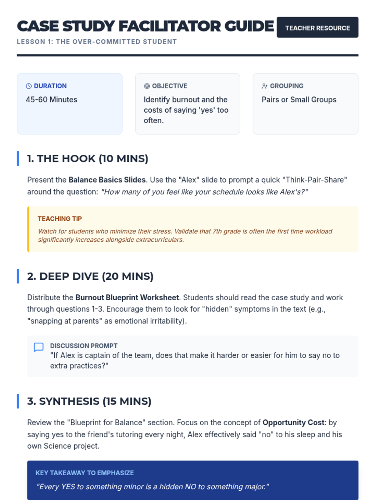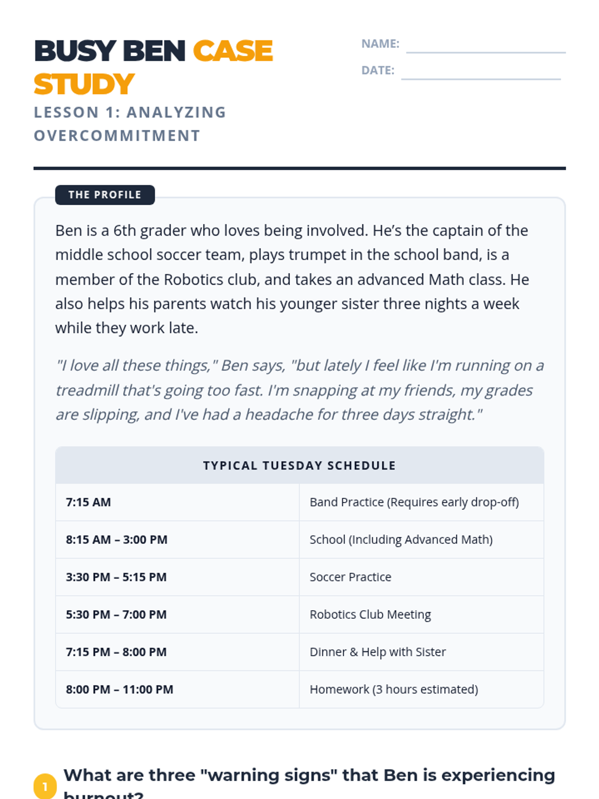 A comprehensive unit for 6th-grade students focusing on balancing academic requirements, extracurricular activities, and essential self-care. Through case studies, categorization activities, and communication practice, students learn to prevent burnout and advocate for their well-being.