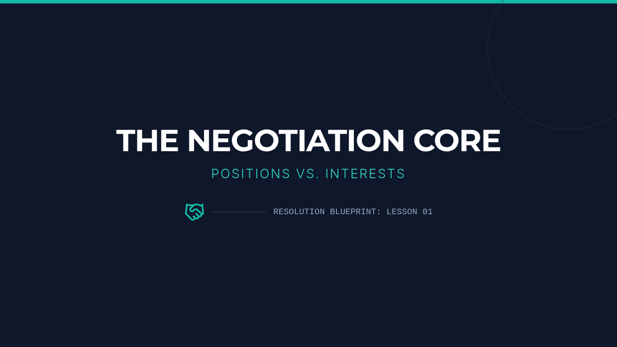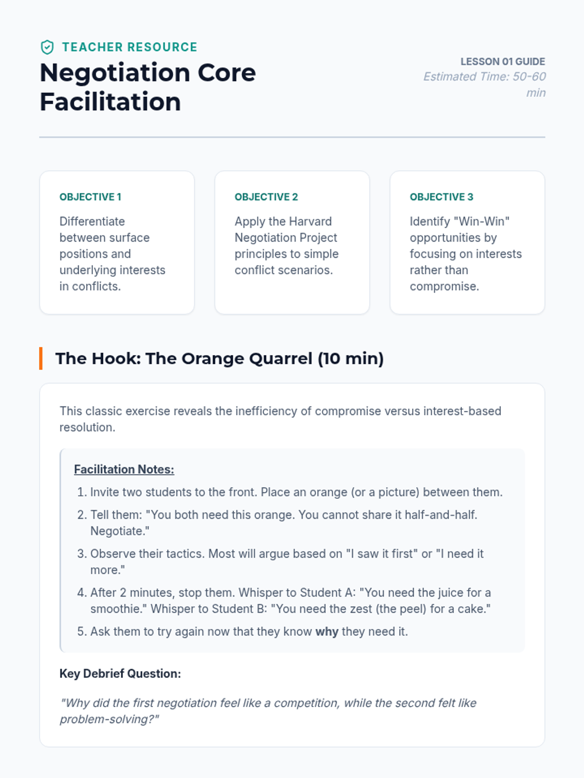 A comprehensive high school unit on interest-based negotiation and formal mediation. Students move from understanding individual interests to facilitating multi-party resolutions using the Harvard Negotiation Project framework and professional mediation stages.