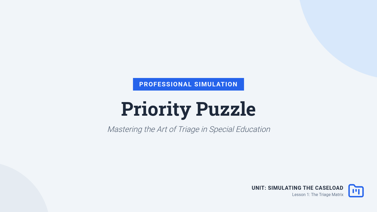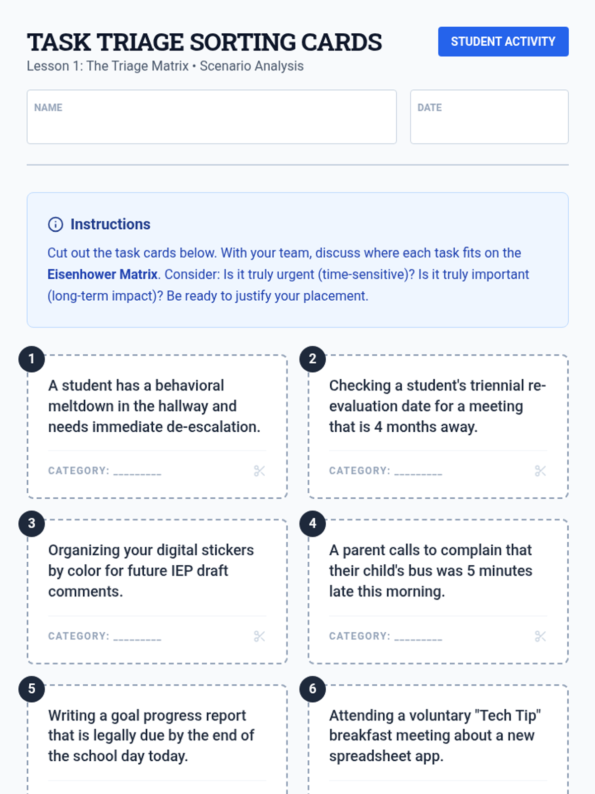 A high-stakes simulation for 12th graders transitioning to professional environments, focusing on prioritizing competing demands, managing interruptions, and professional communication in a special education caseload context.
