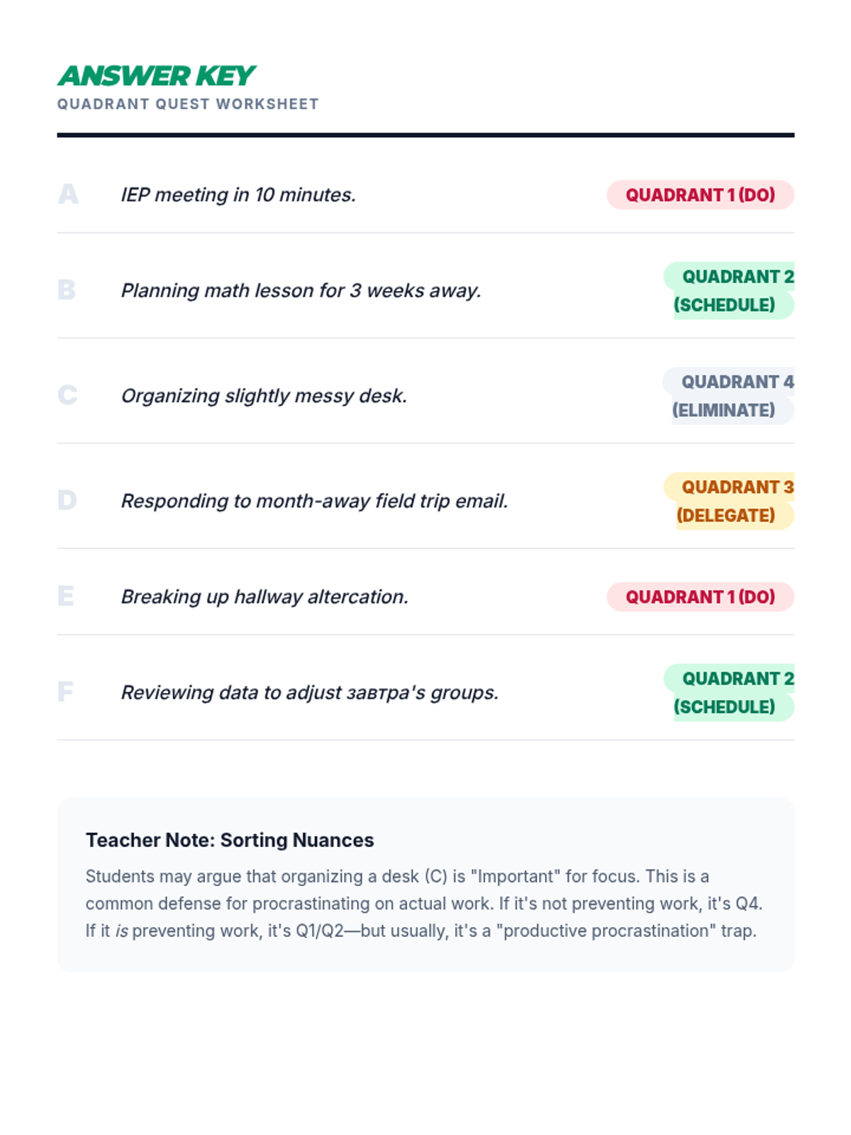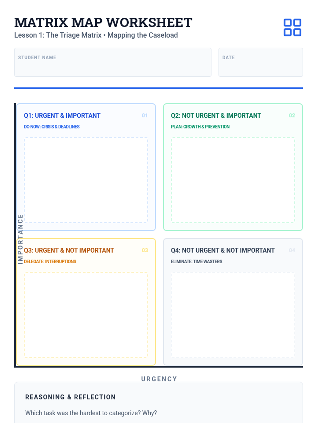 A professional executive functioning sequence for 11th-grade students (specifically those in teaching or professional pathways) focused on high-stakes prioritization. Students master the Eisenhower Matrix, ABCDE method, and time-blocking to navigate the complex demands of educational environments.