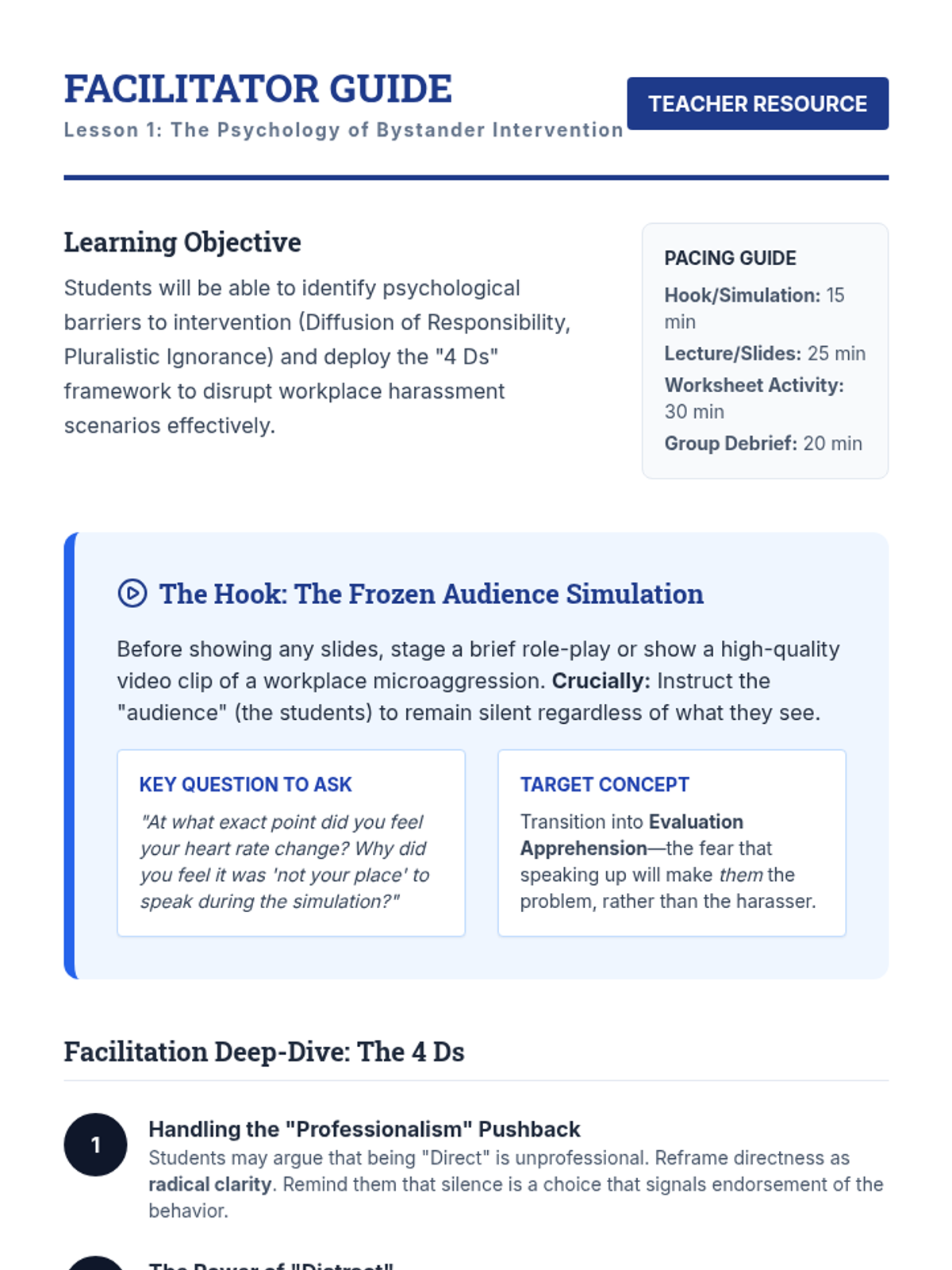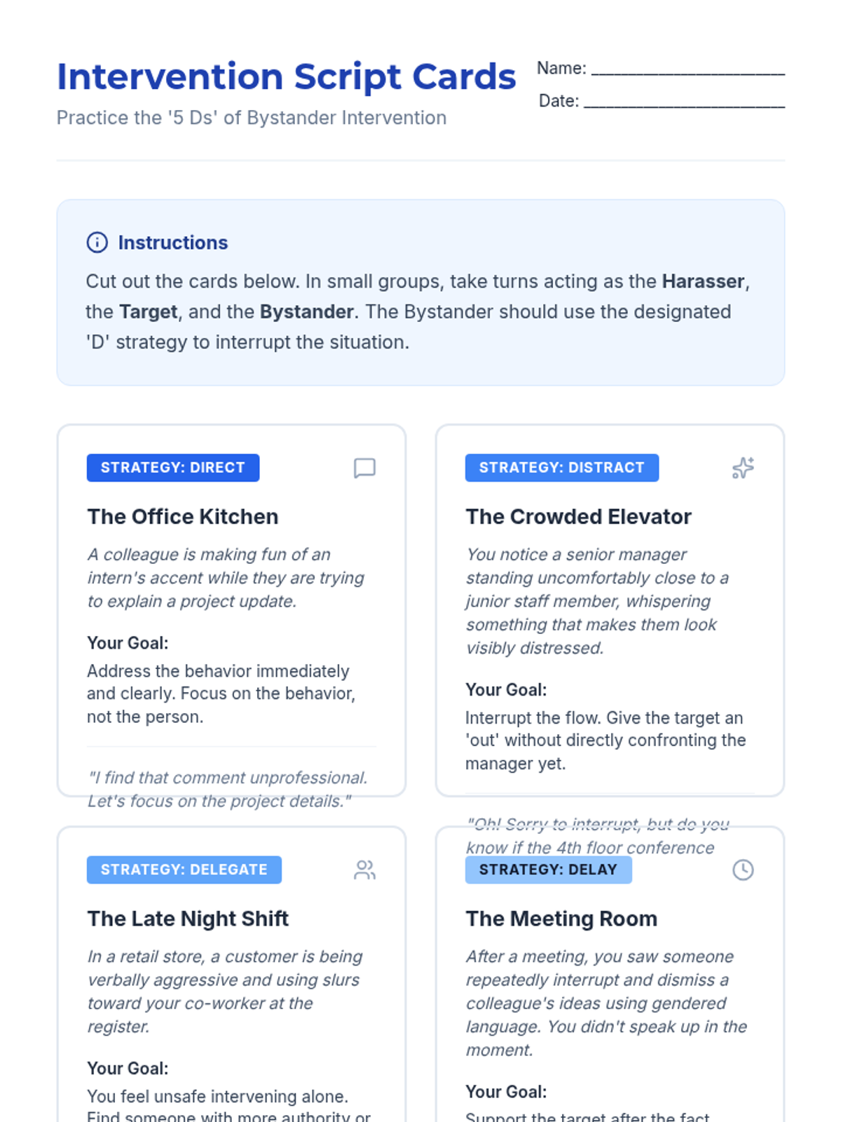 This sequence equips 11th-grade students with actionable skills for workplace safety, focusing on bystander intervention, formal reporting procedures, and understanding legal protections against retaliation. Students move from individual intervention to systemic policy design, preparing them to foster professional environments free from harassment.